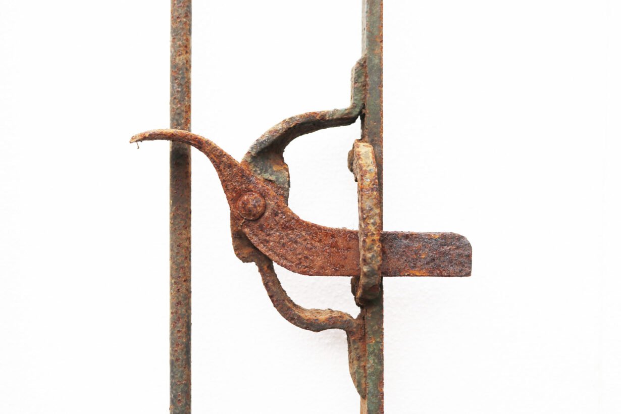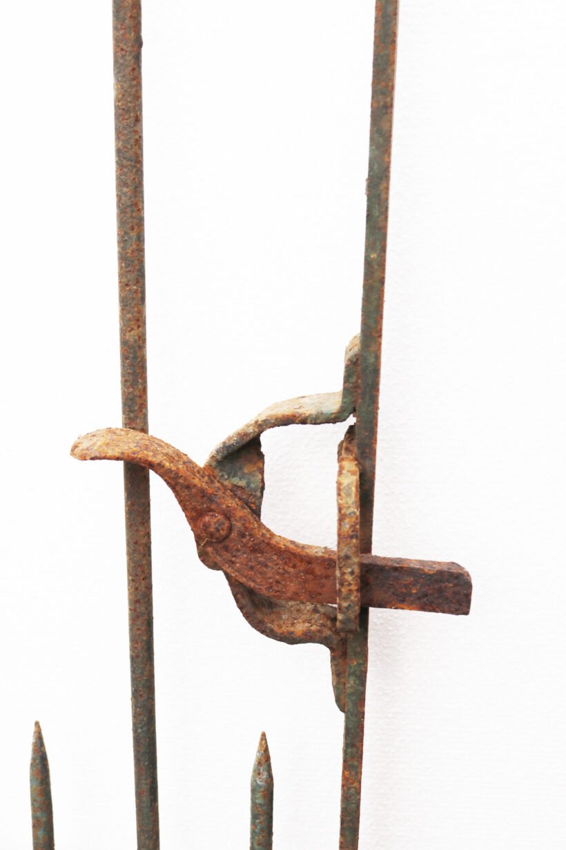 A salvaged wrought iron side gate with scroll finials and working latch.