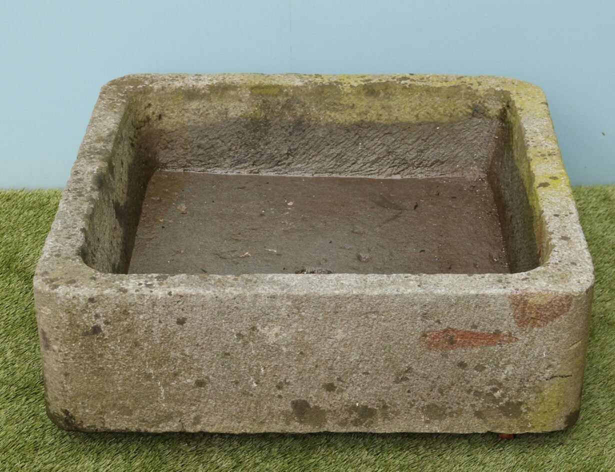 A reclaimed stone trough suitable for use as a planter or as a sink.