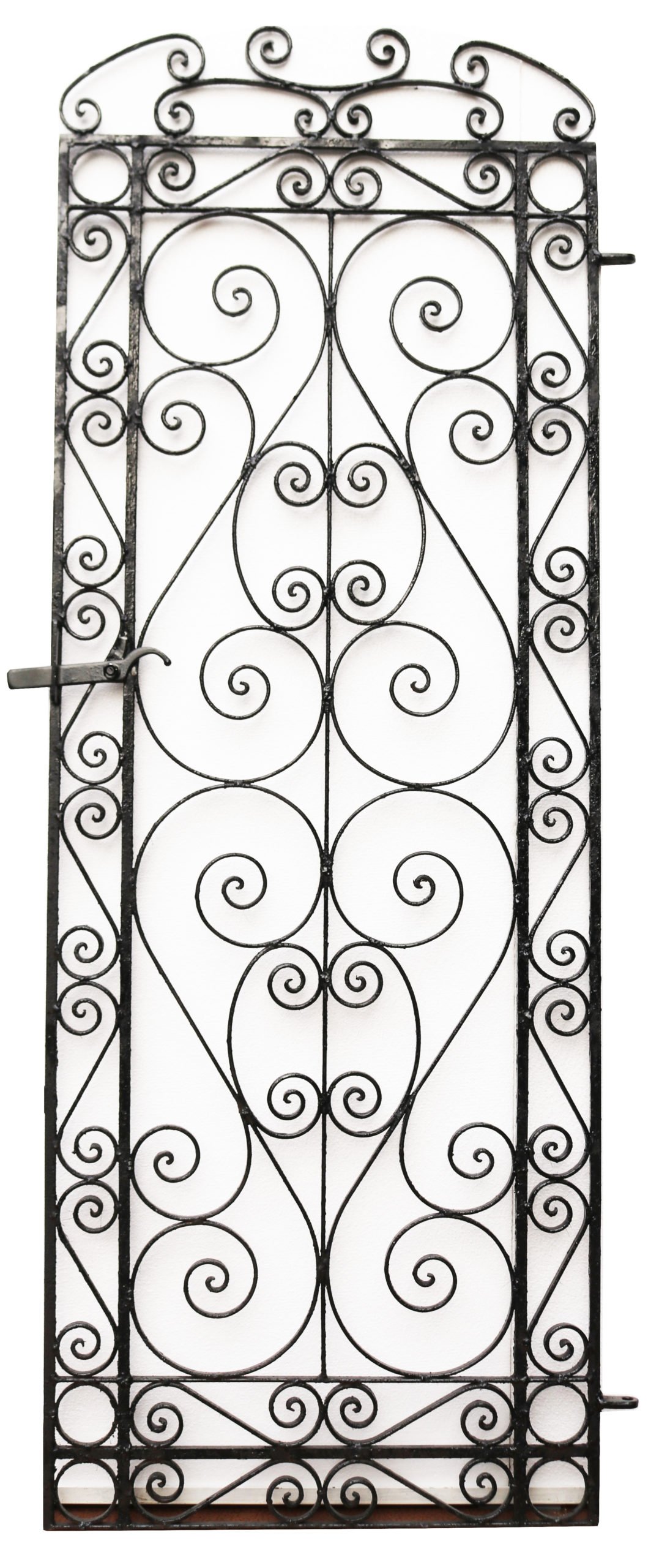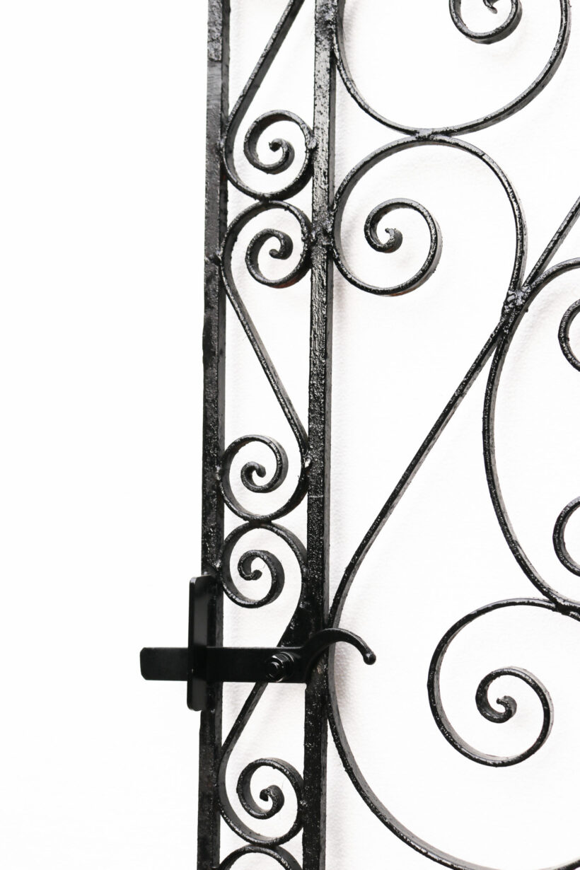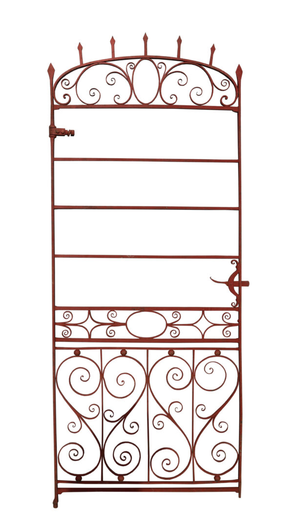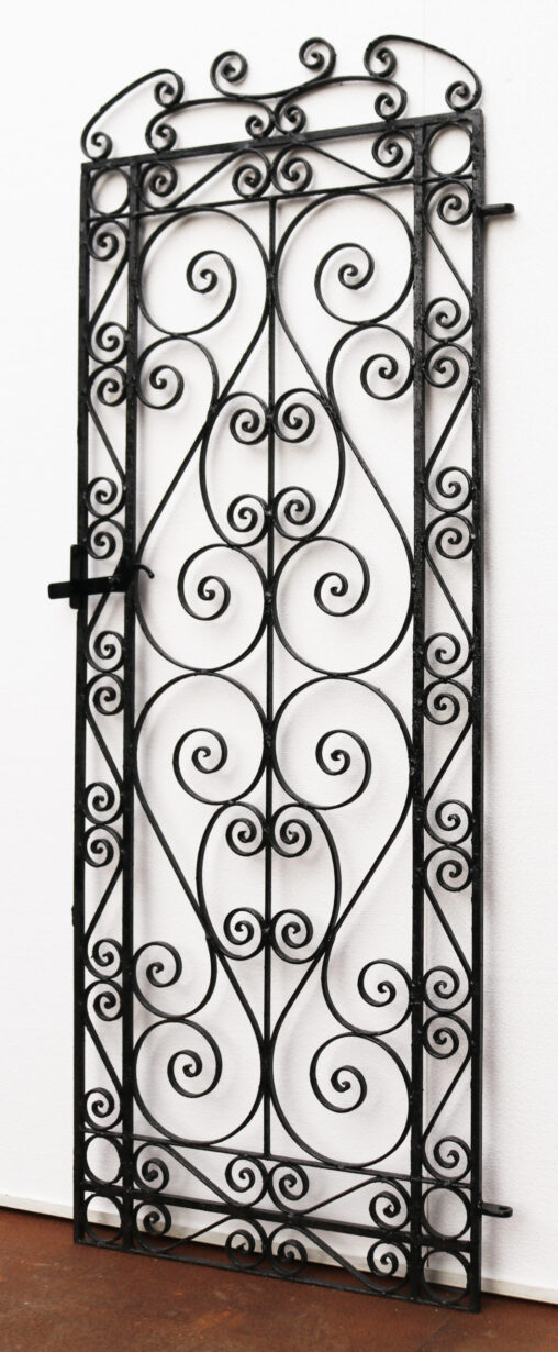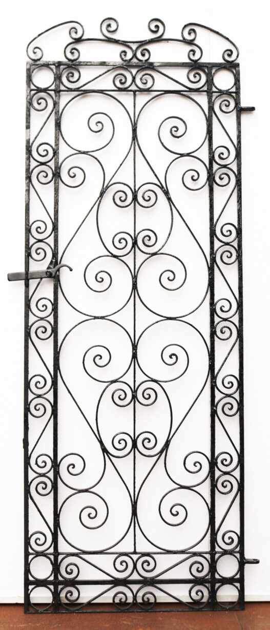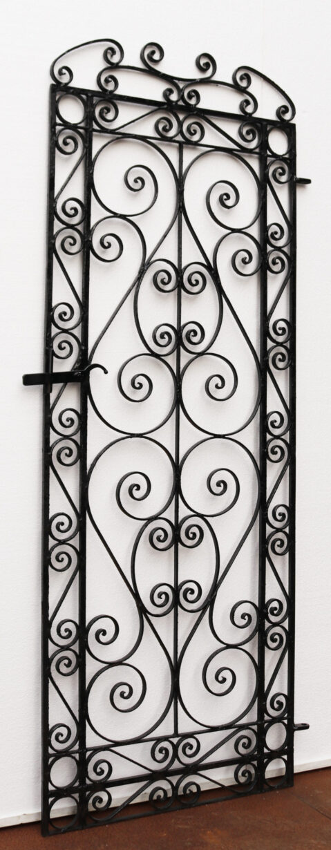 A tall and slender garden gate with a repeated scrolling design. Additional Dimensions For an opening of approximately 74 cm