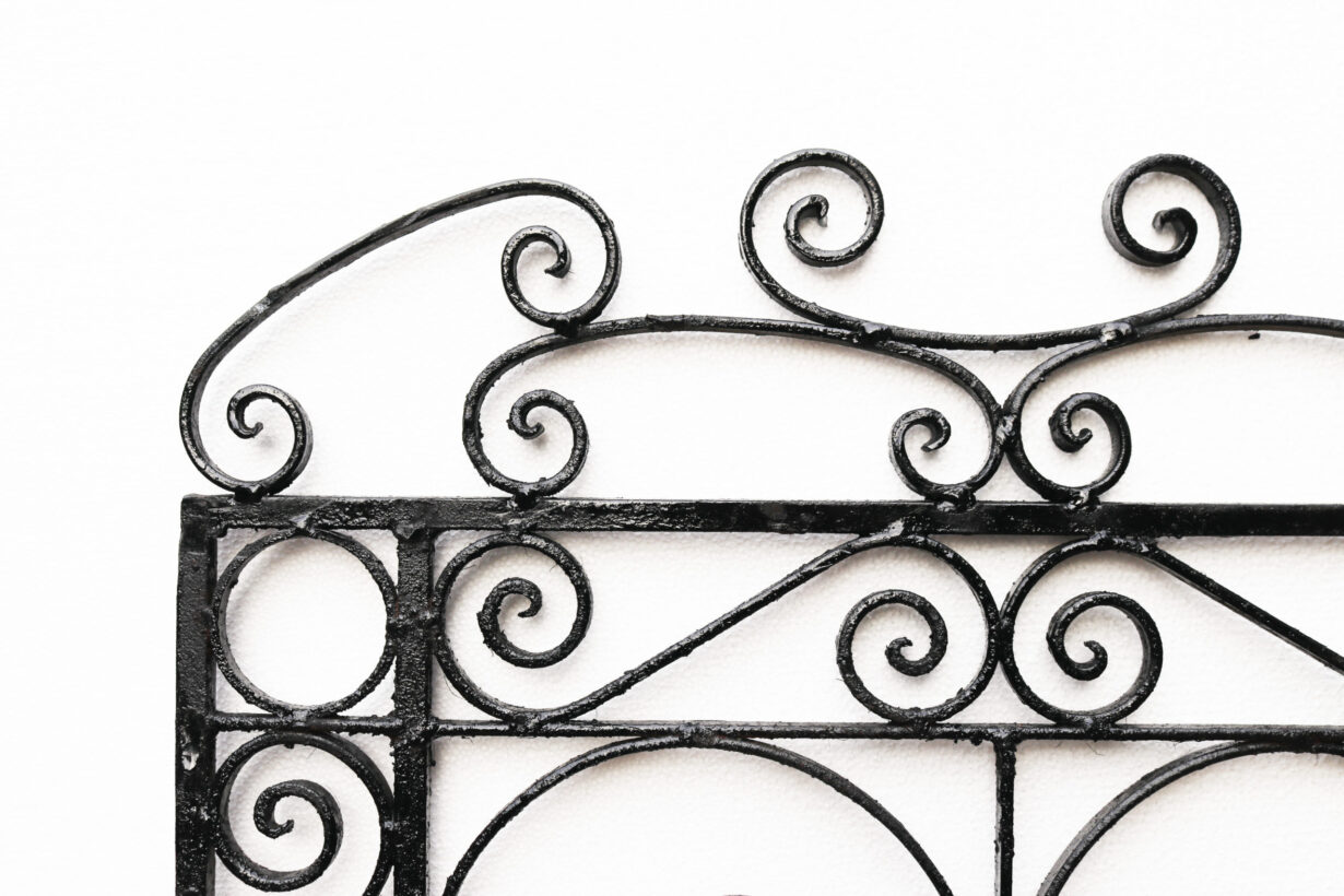 back to topA tall and slender garden gate with a repeated scrolling design.