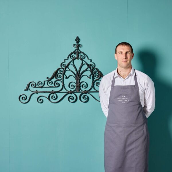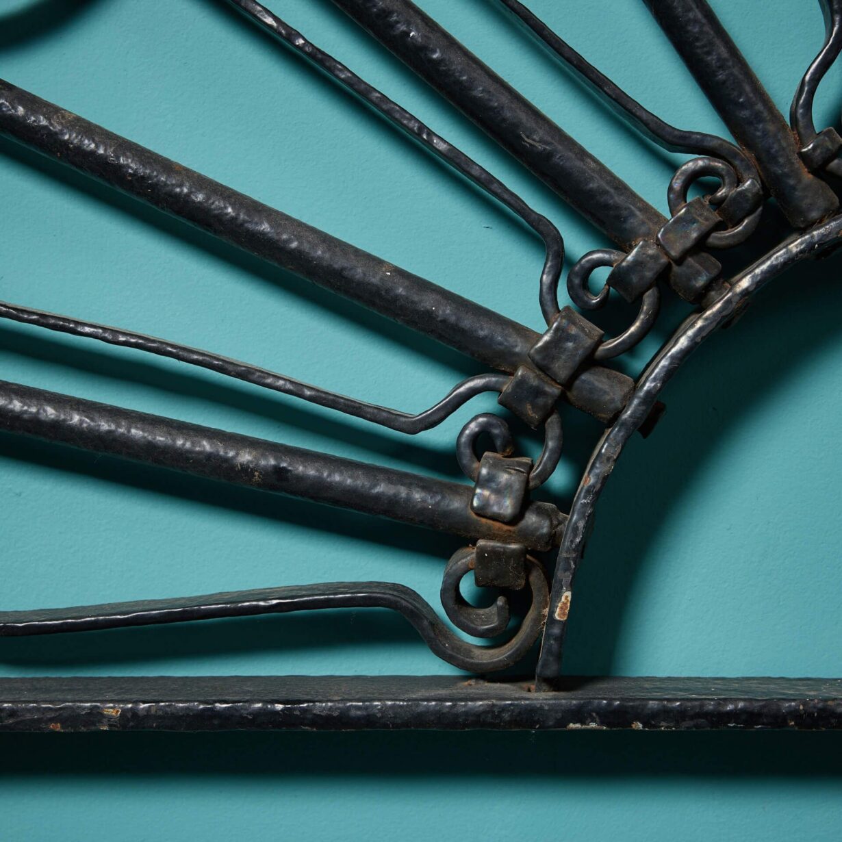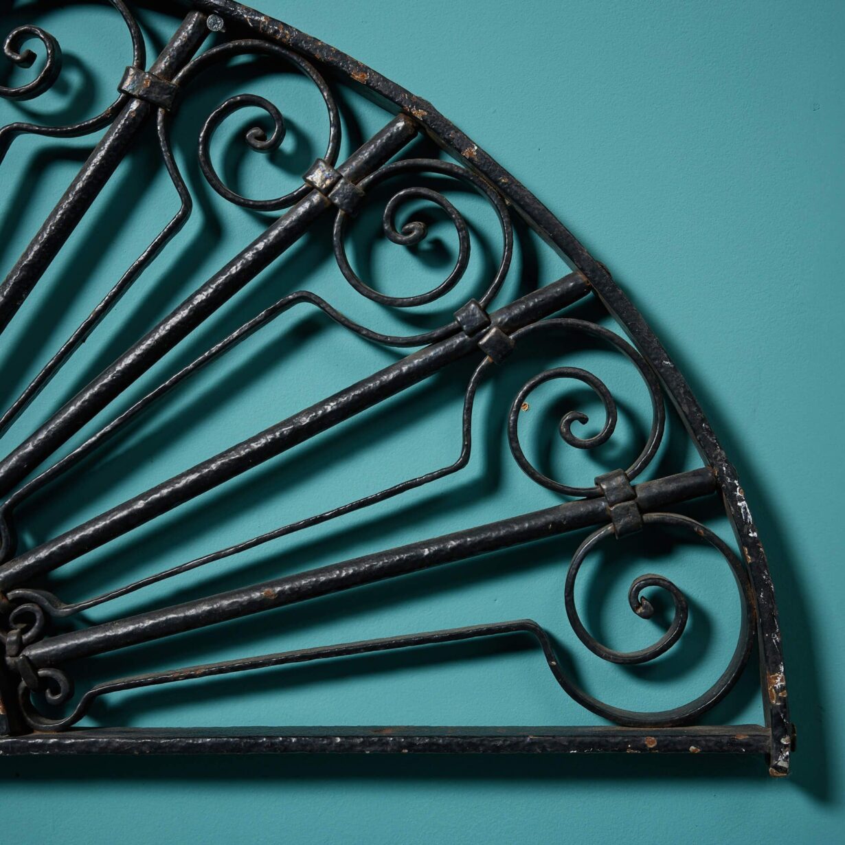 back to topAn antique wrought iron semi-circular window grill, reclaimed from a house in Cheltenham. With its fine scrollwork, this arched metal panel will make a stunning overdoor at the entrance to a Georgian townhouse. Alternatively, it could be used as a decorative demilune wall feature panel in an interior or walled garden.