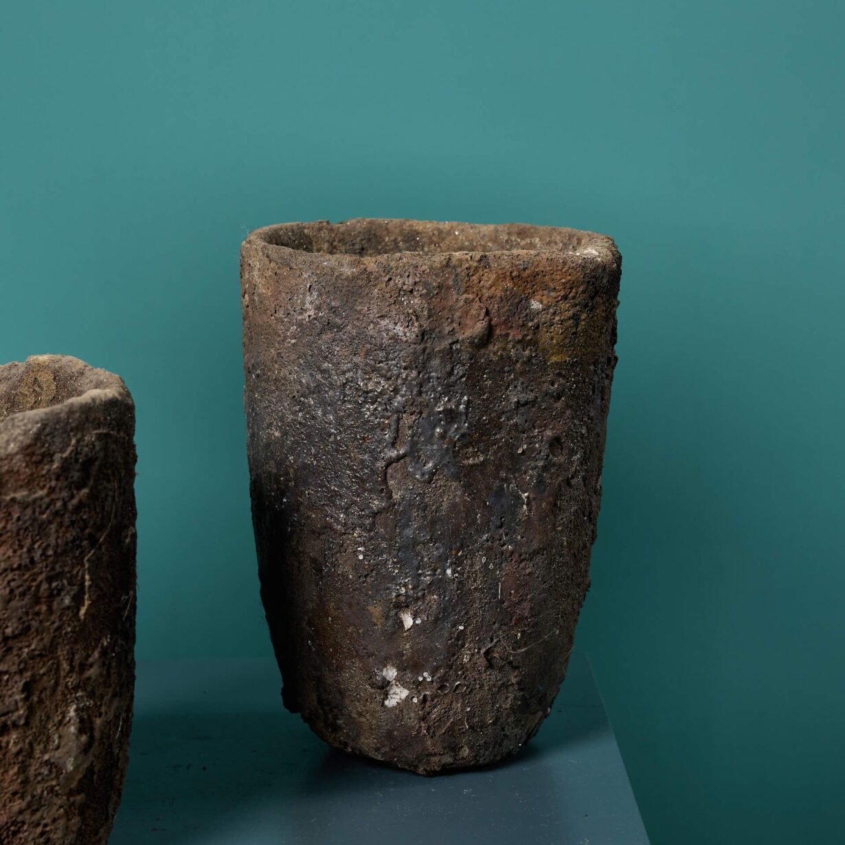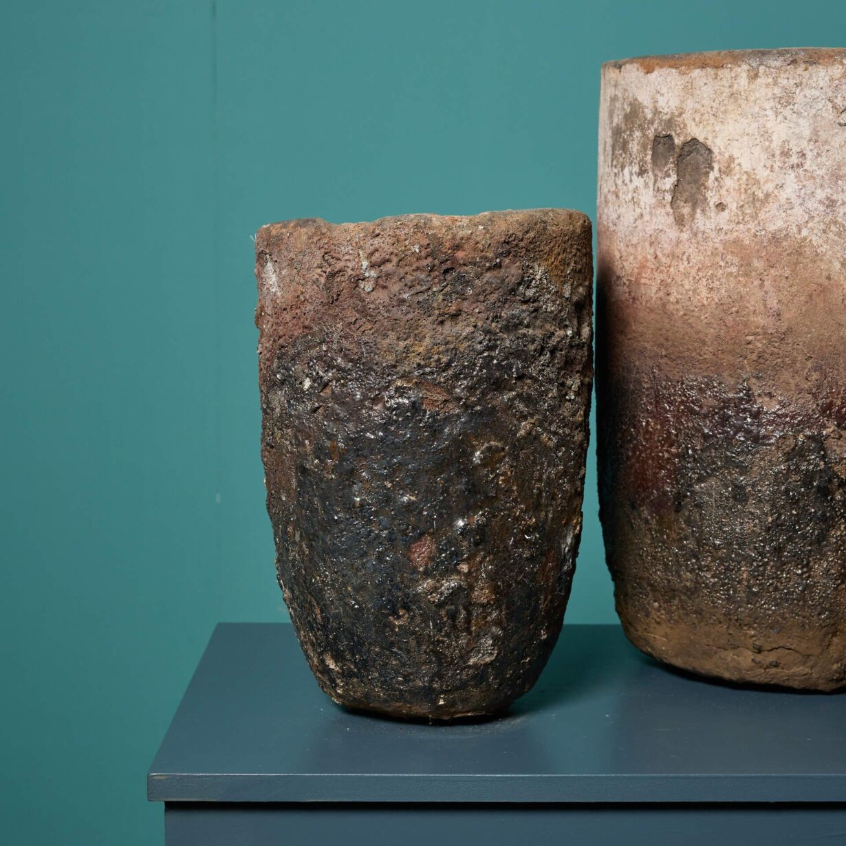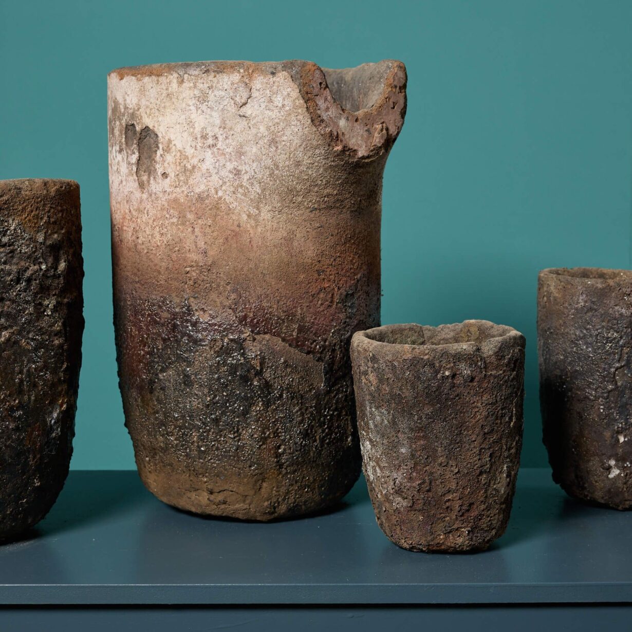 back to topA set of four large foundry crucibles. Once used to heat and pour white-hot metals for foundry production, these unique crucibles feature exteriors encrusted with molten metals. They could be used as industrial garden ornaments or vases, making a bold statement in traditional and contemporary settings alike.
