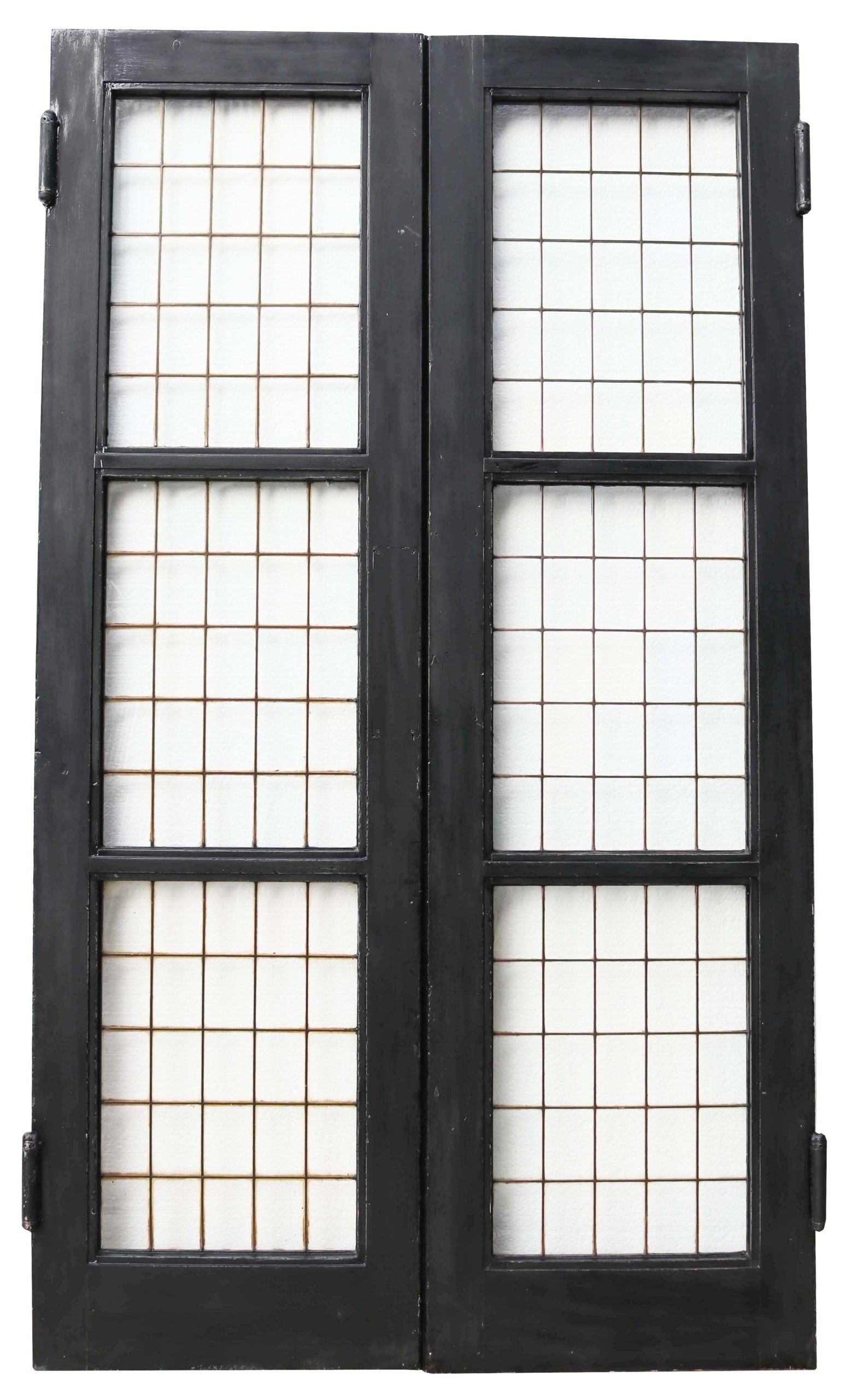Good structural condition. There are no cracks or breaks to the glass. Each door has the original swing hinges attached.