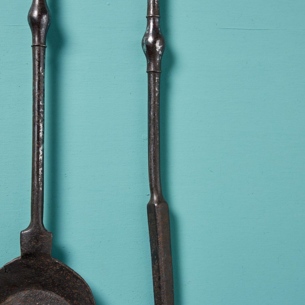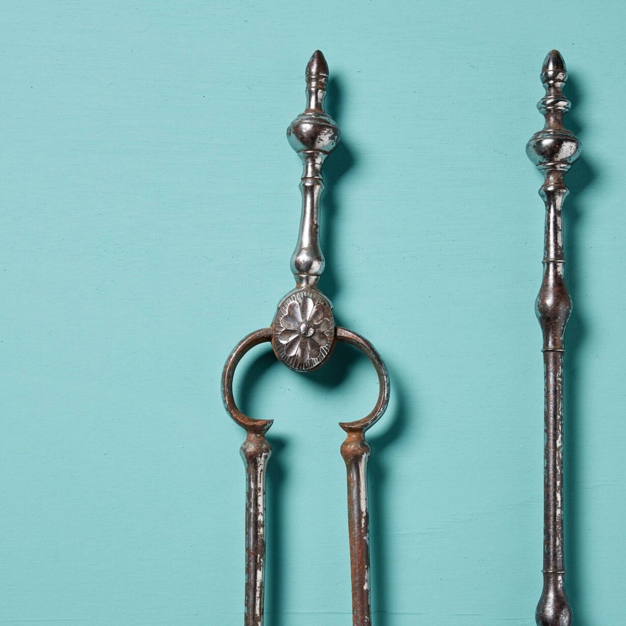 A set of original reclaimed Georgian fire tools. The set consists of a poker, tongs and shovel with matching finial shaped handles. The perfect finishing touch for an antique fireplace!