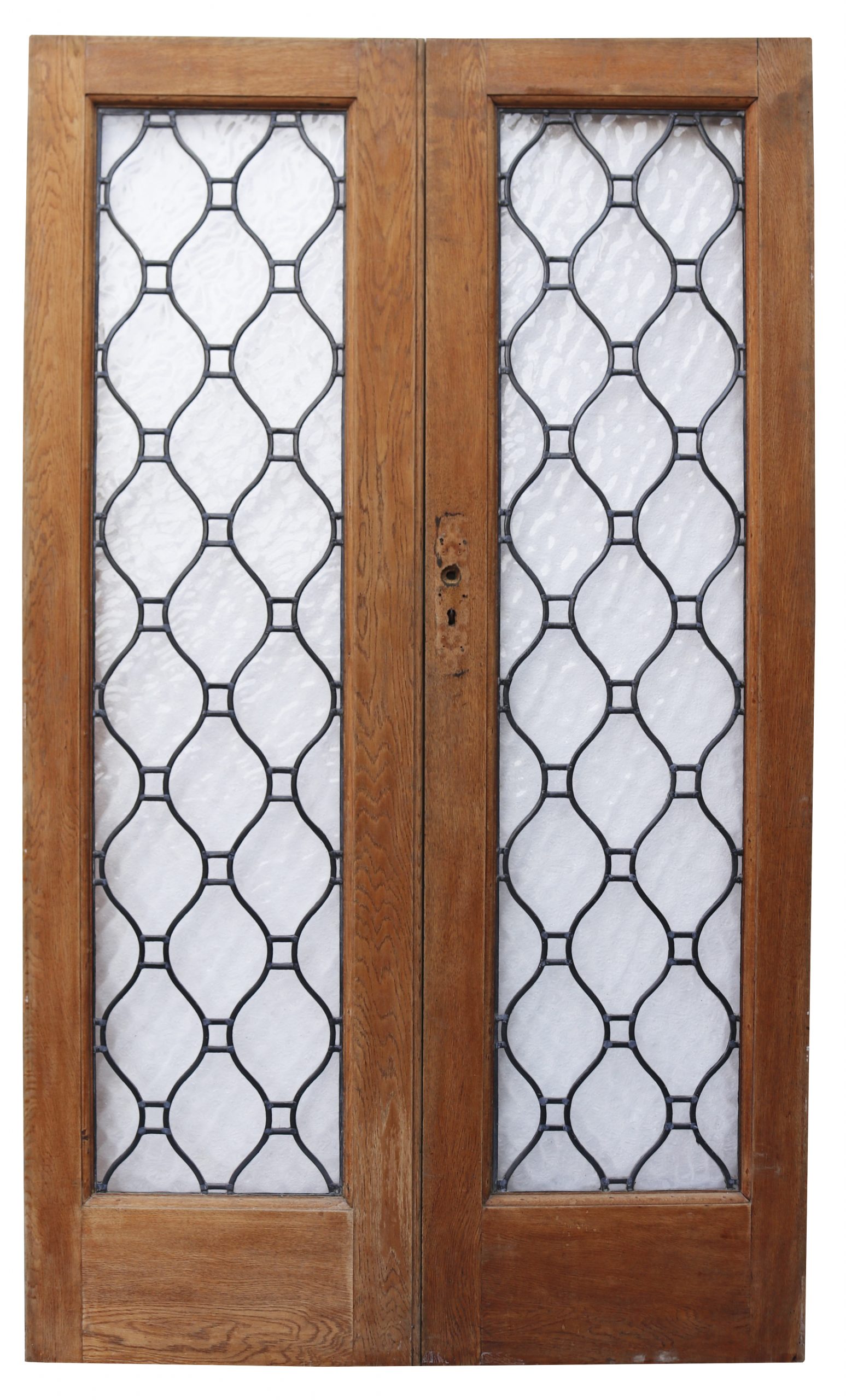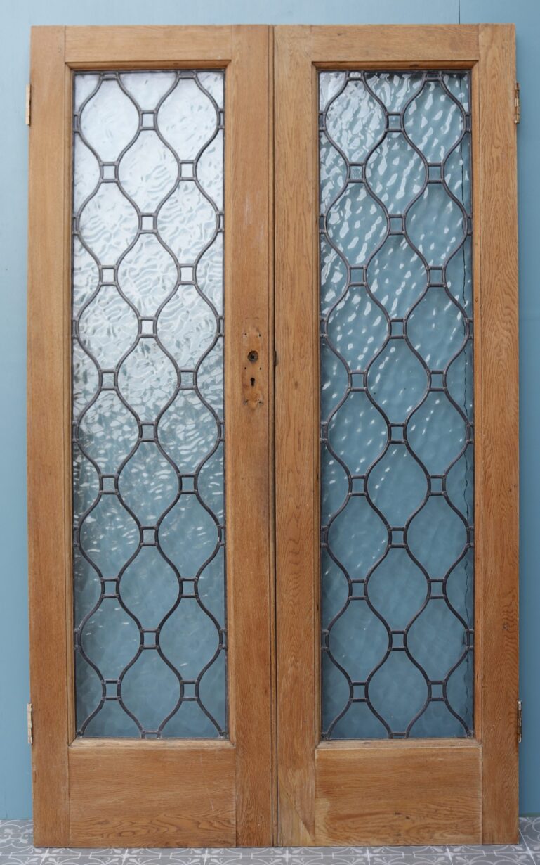 A set of Oak double doors with leaded textured glass panels. We have two sets available.
