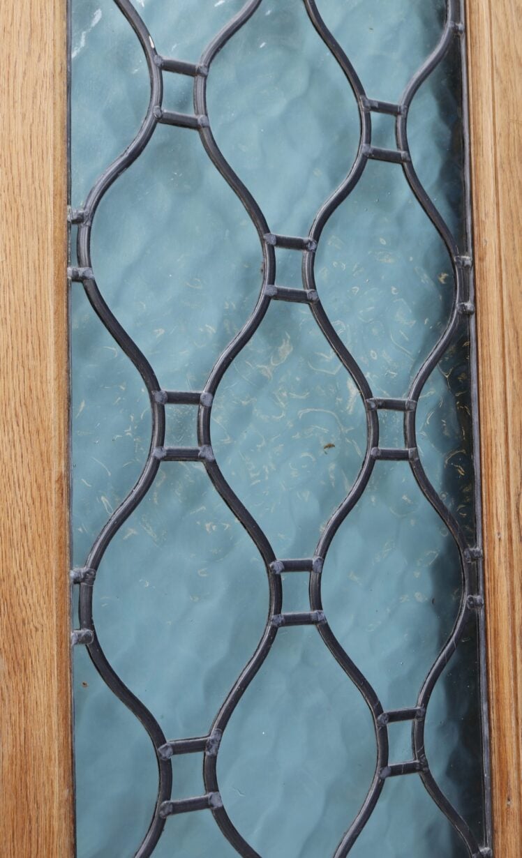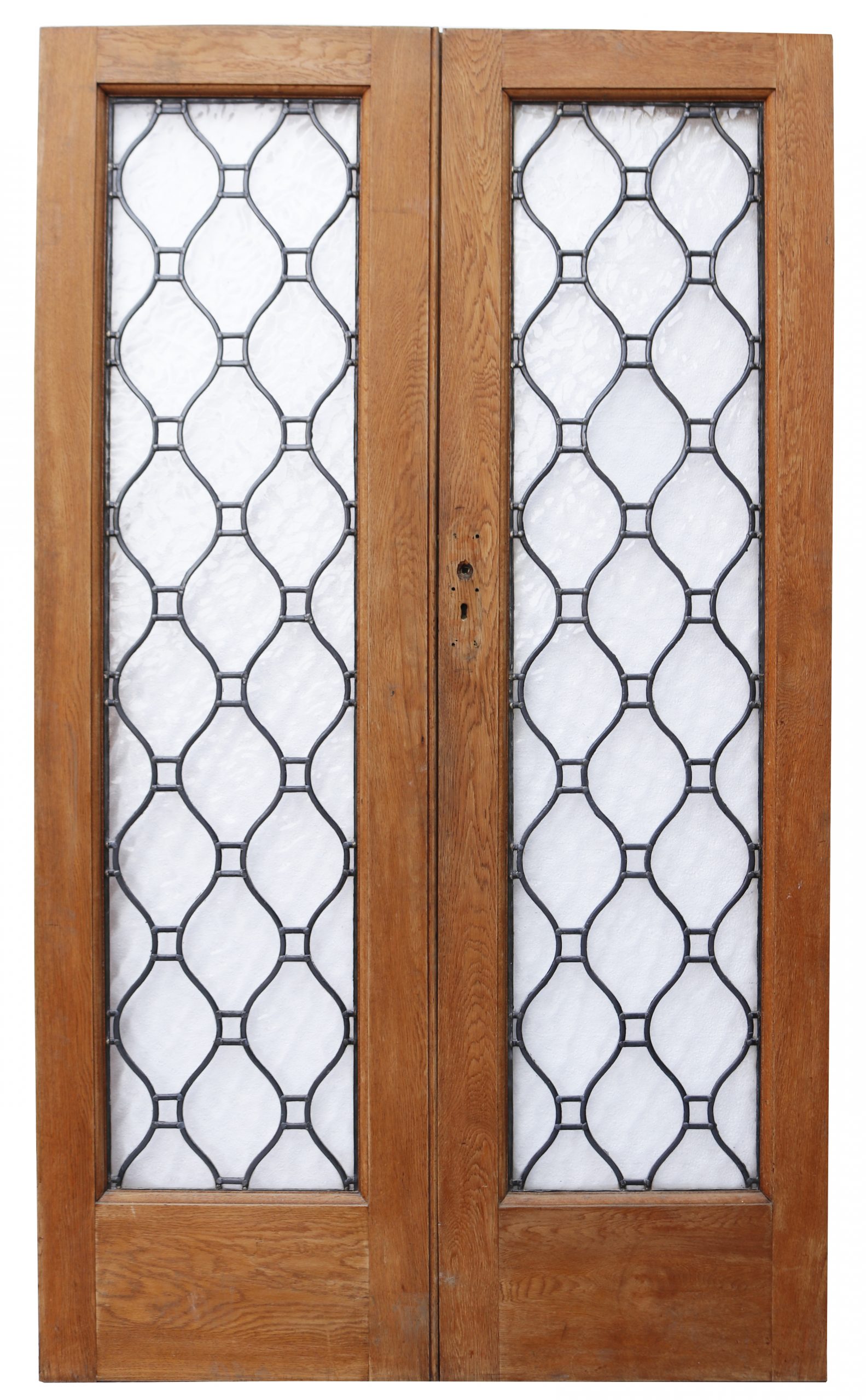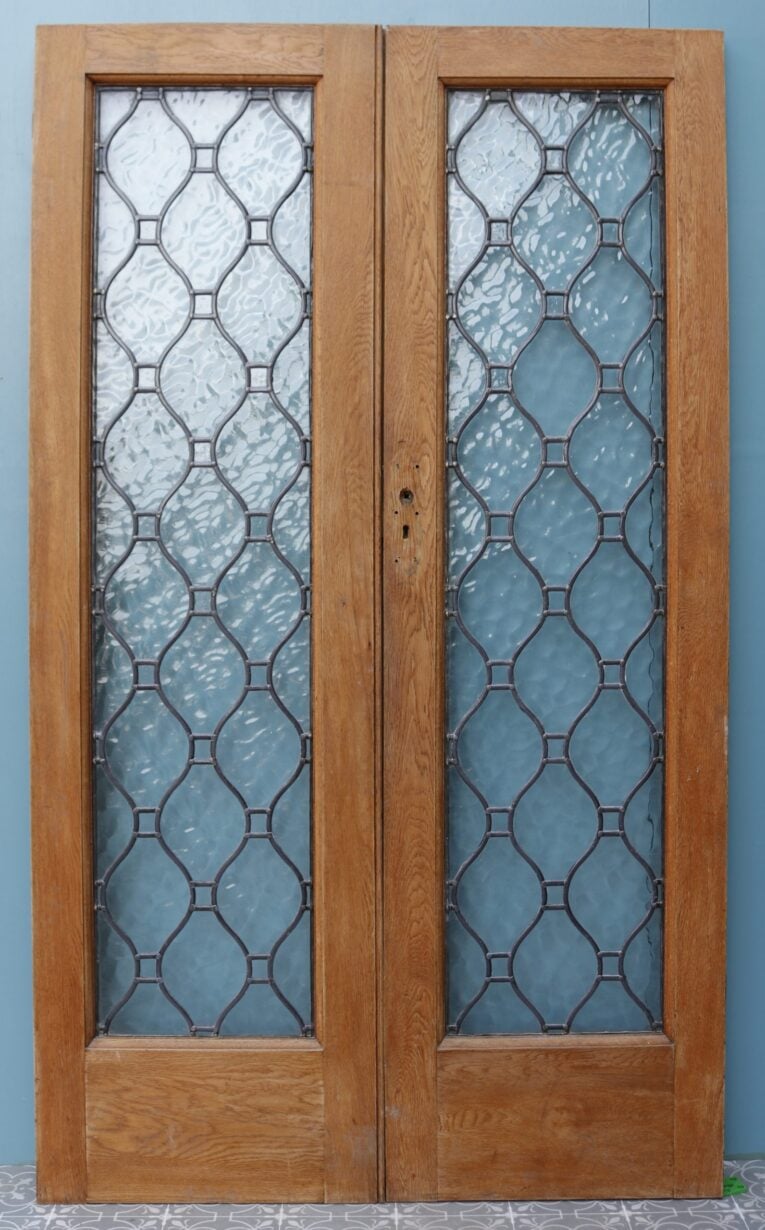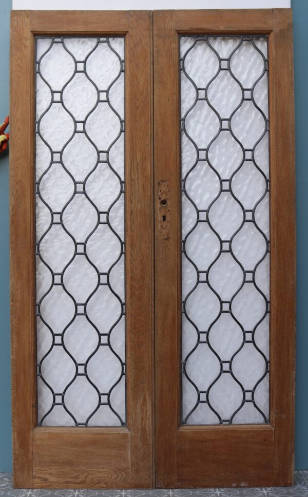 Oak double doors with leaded textured glass panels. We have two sets available.
