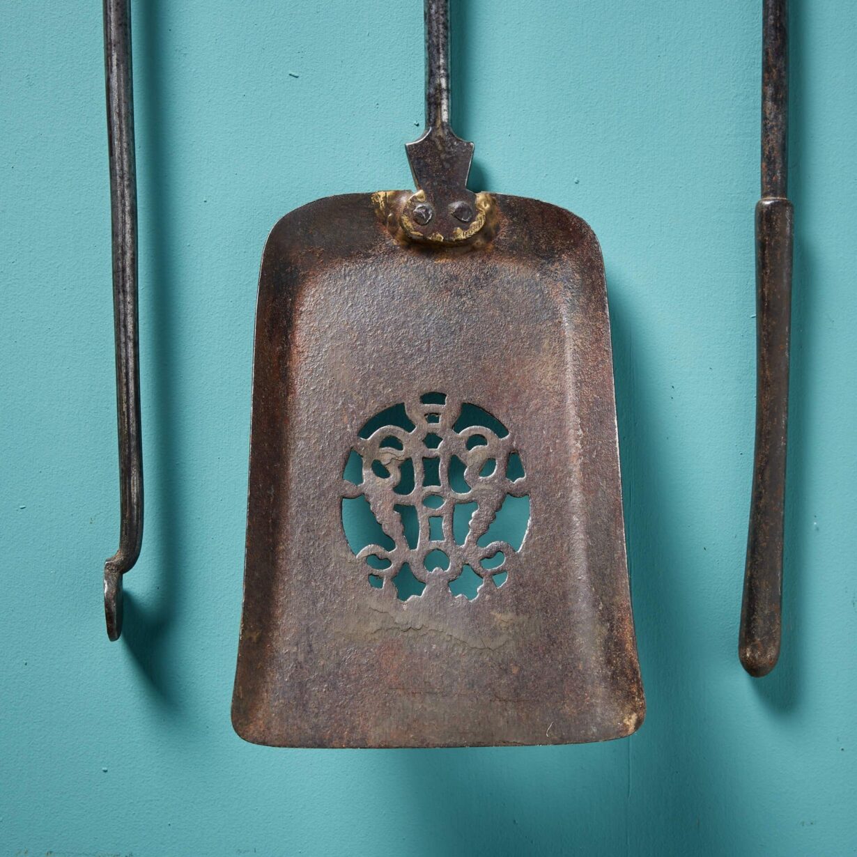 Good structural condition. These fire tools are fully functional and in good, original condition, with one historic repair to the shovel where it meets the shaft. Wear consistent with age and use. Minor Losses, scuffs, and scratches.