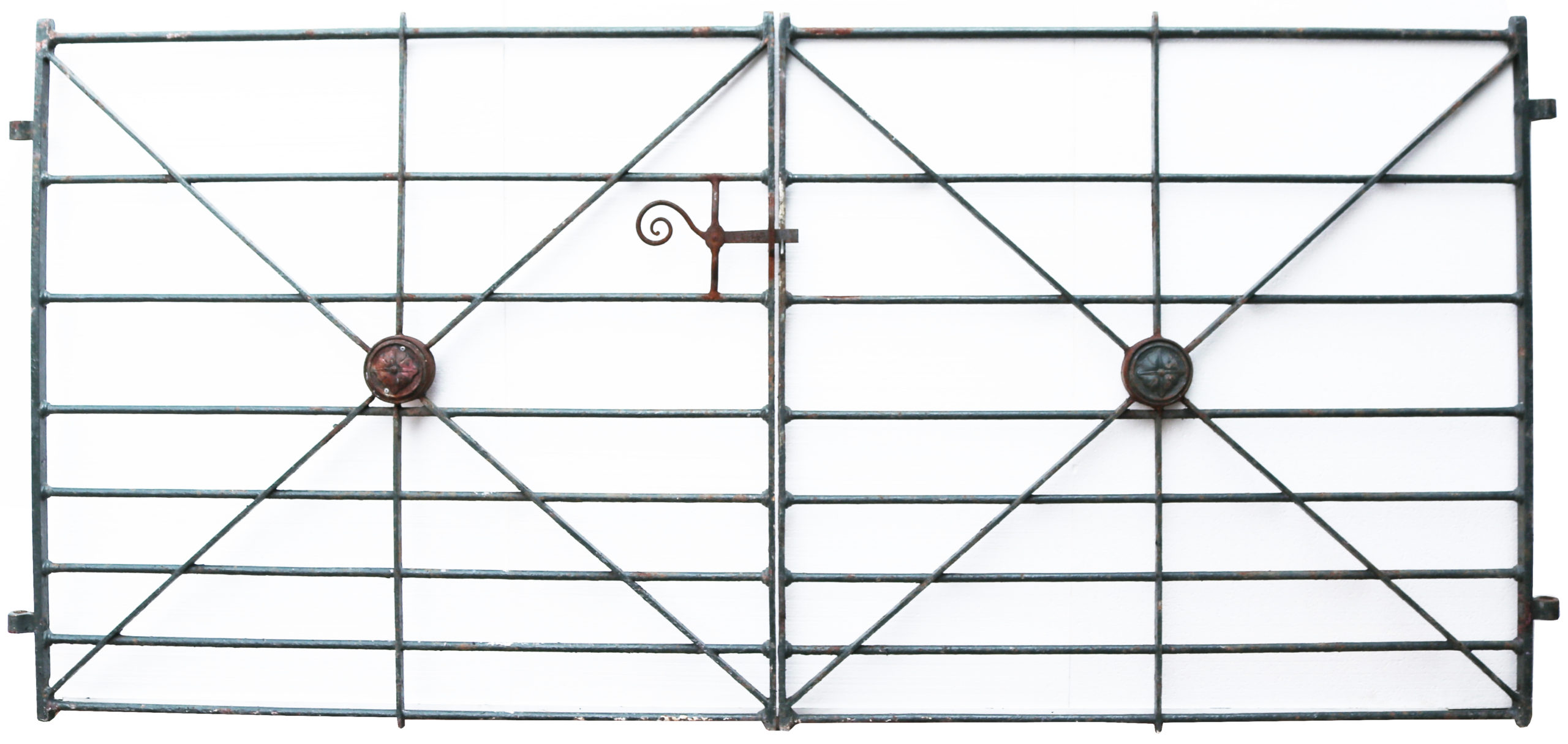Good structural condition. These gates are fitted with hinge eyes, no pins. Old flaky green paint and light surface rust finish.