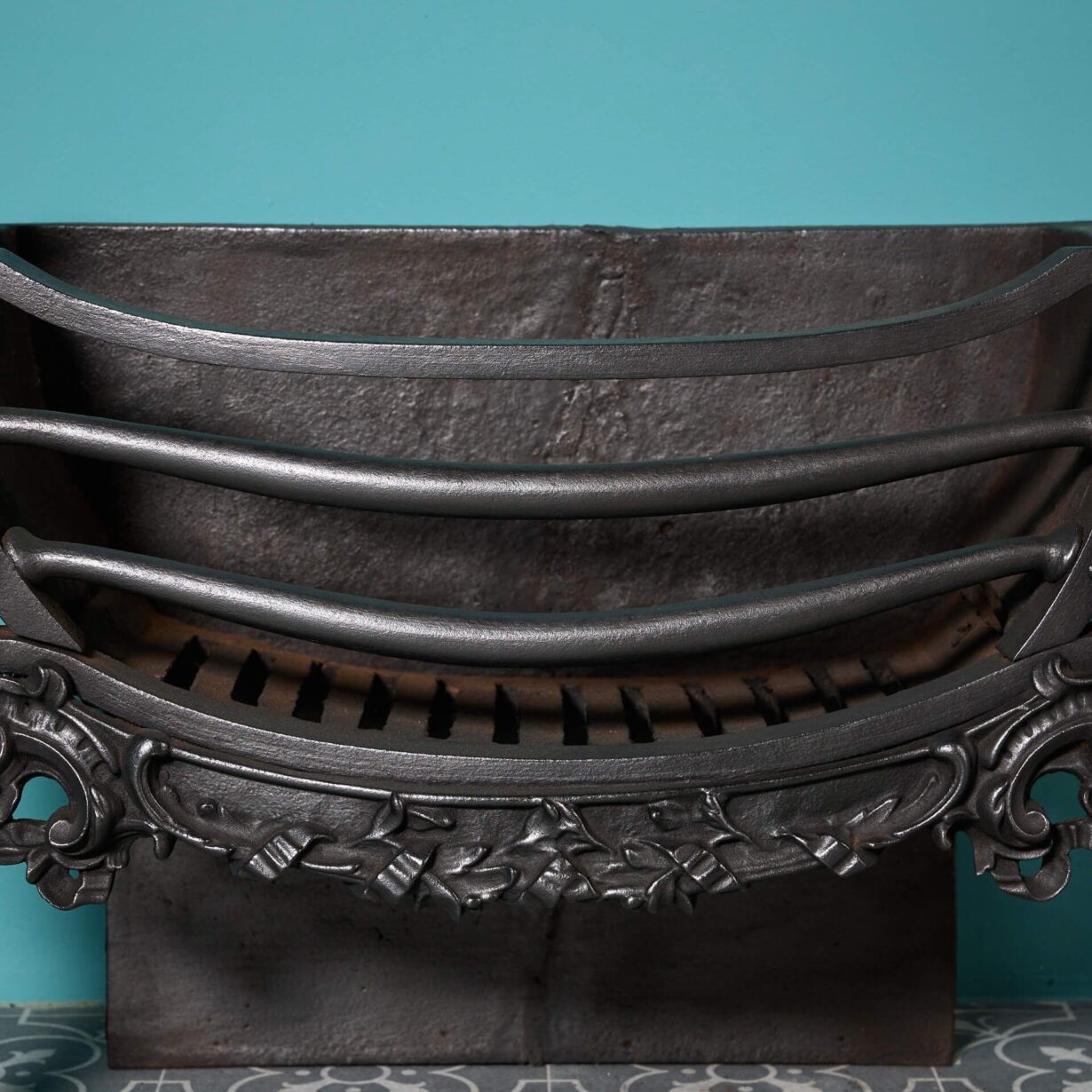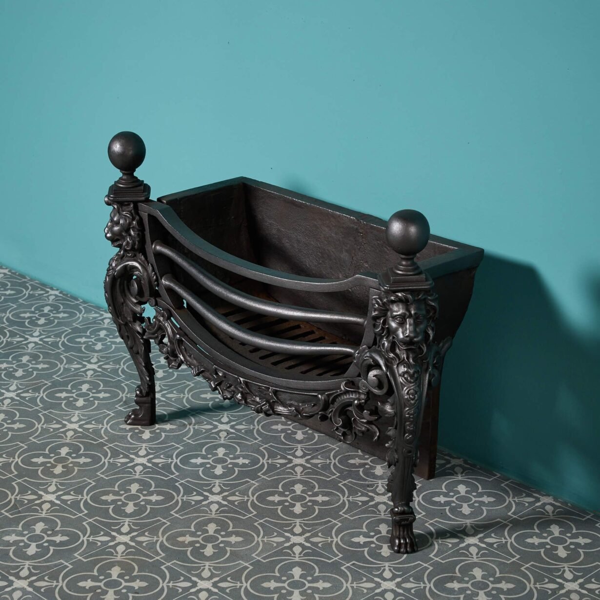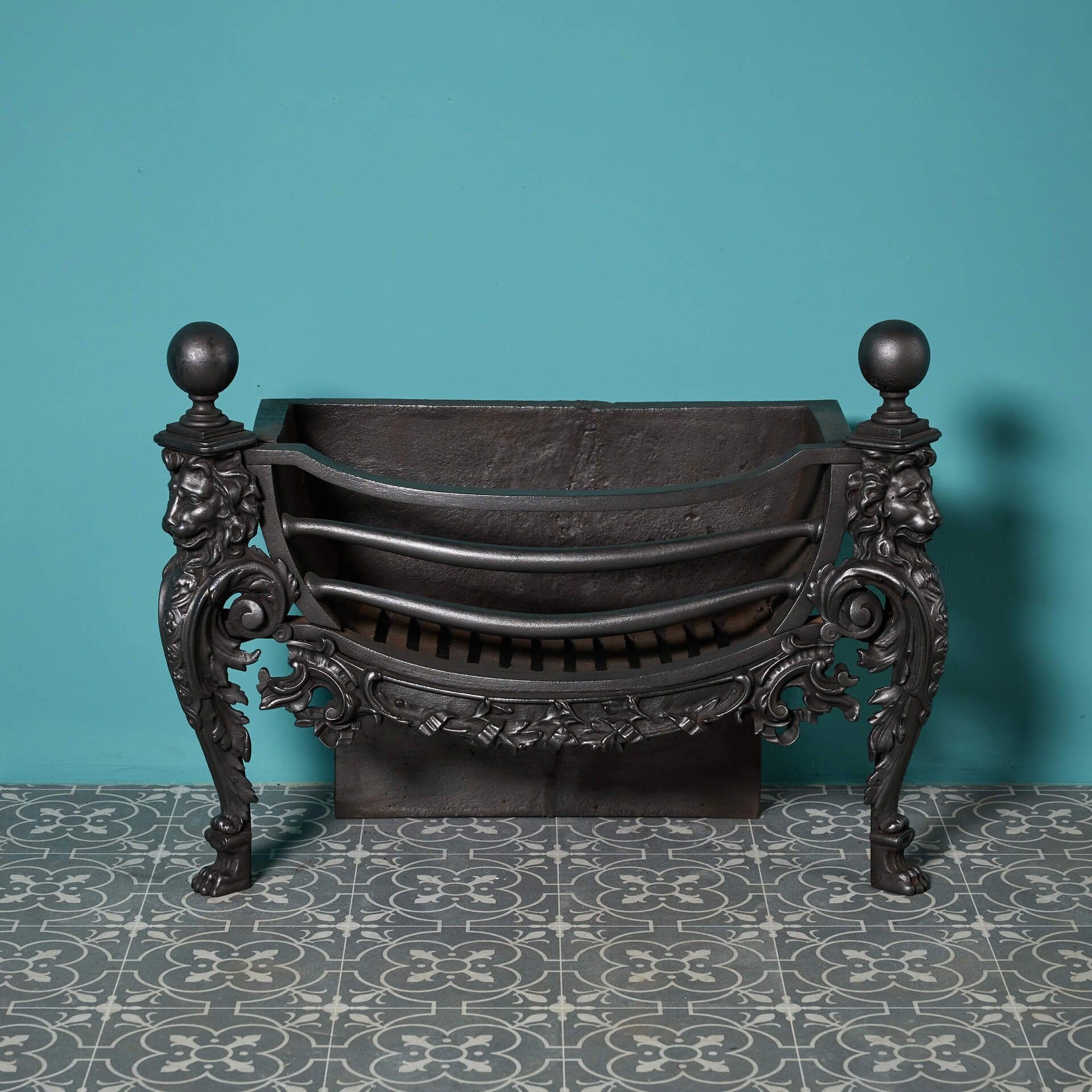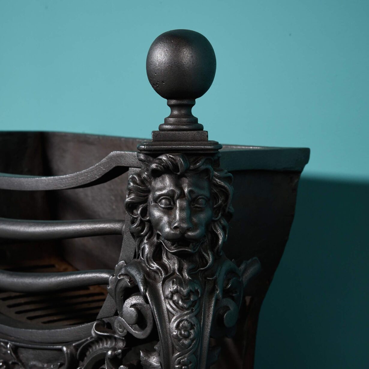 back to topAn unusual early 19th century Victorian cast iron fire grate with lion mask decoration, shaped bars and ball finials. Though almost 200 years old, this beautiful antique fire basket is in good condition for its age with ornate cast iron decoration certain to instil any fireplace with flair and elegance in an instant.