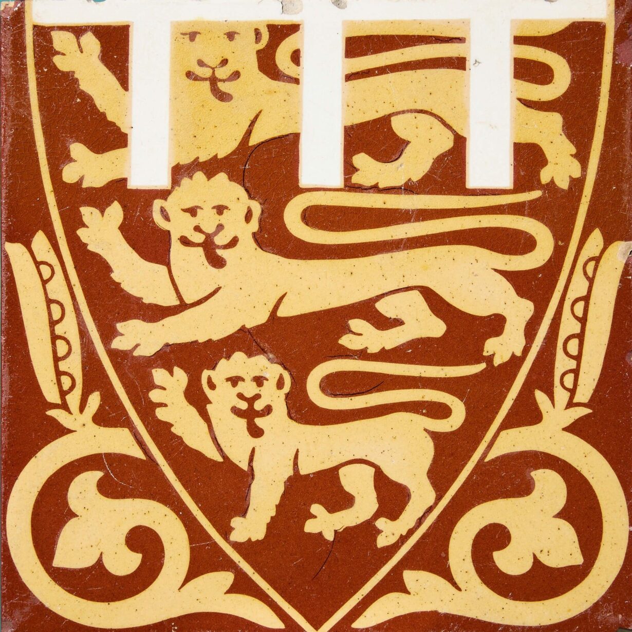 This 5 inch square tile is adorned with three lions passant within a heraldic shield and flanked by seed pods on scrolling foliate stems, thought to be fruits of planta genista and the emblem of the Plantagenists, all in a buff terracotta over a rich rouge ground.