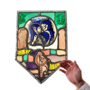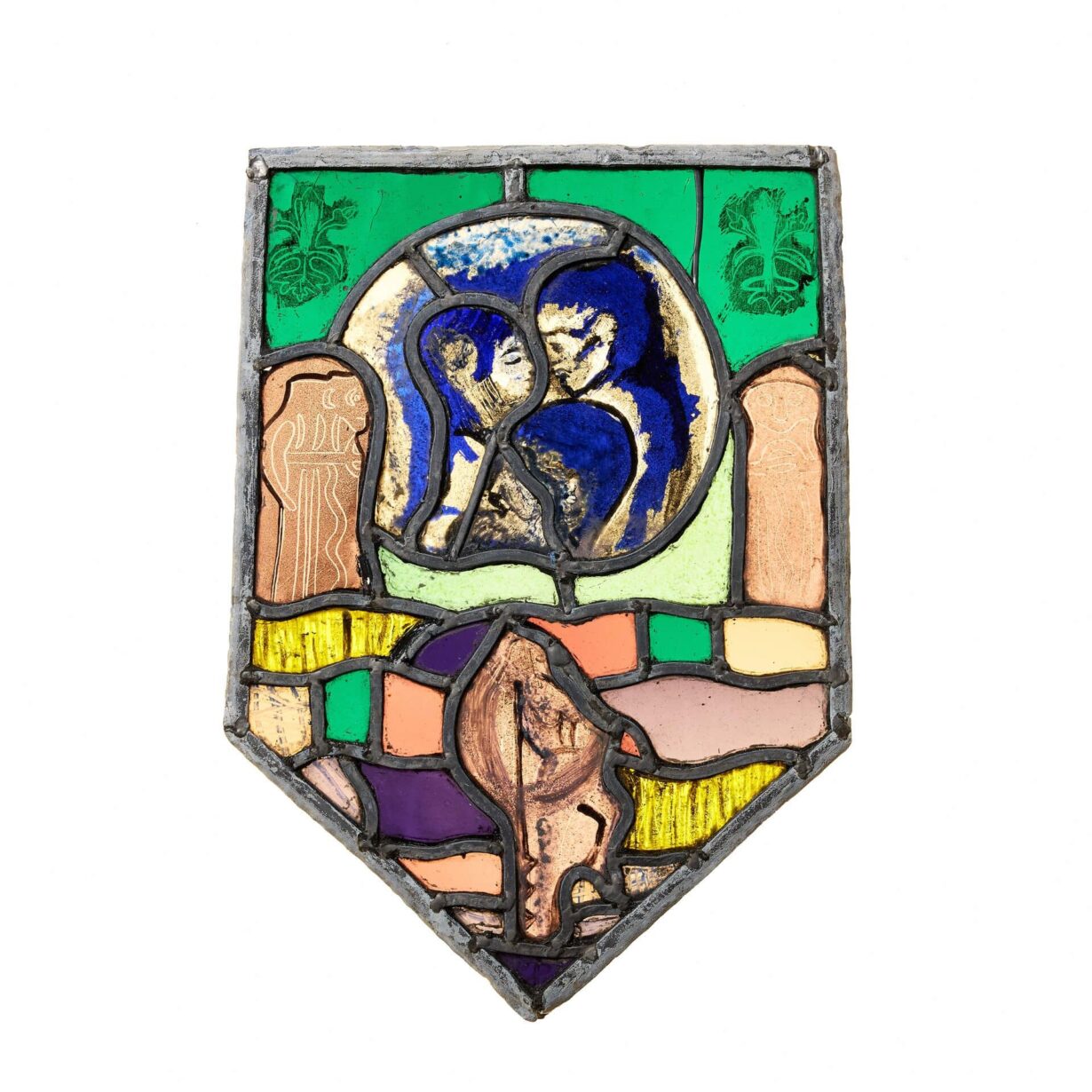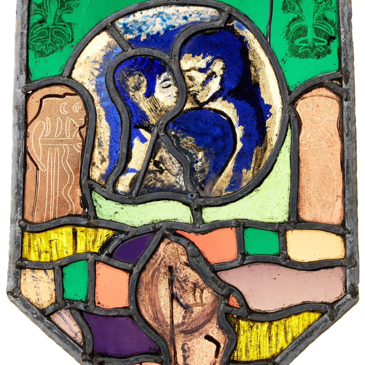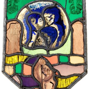back to topA small abstract modernist stained glass window with an unusual design, blending together a range of vibrant colours and patterns. Defined by its defined shape, this modern stained glass window features an abstract design centring around a roundel with an embracing couple to the centre.