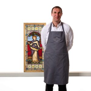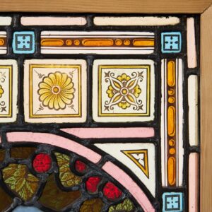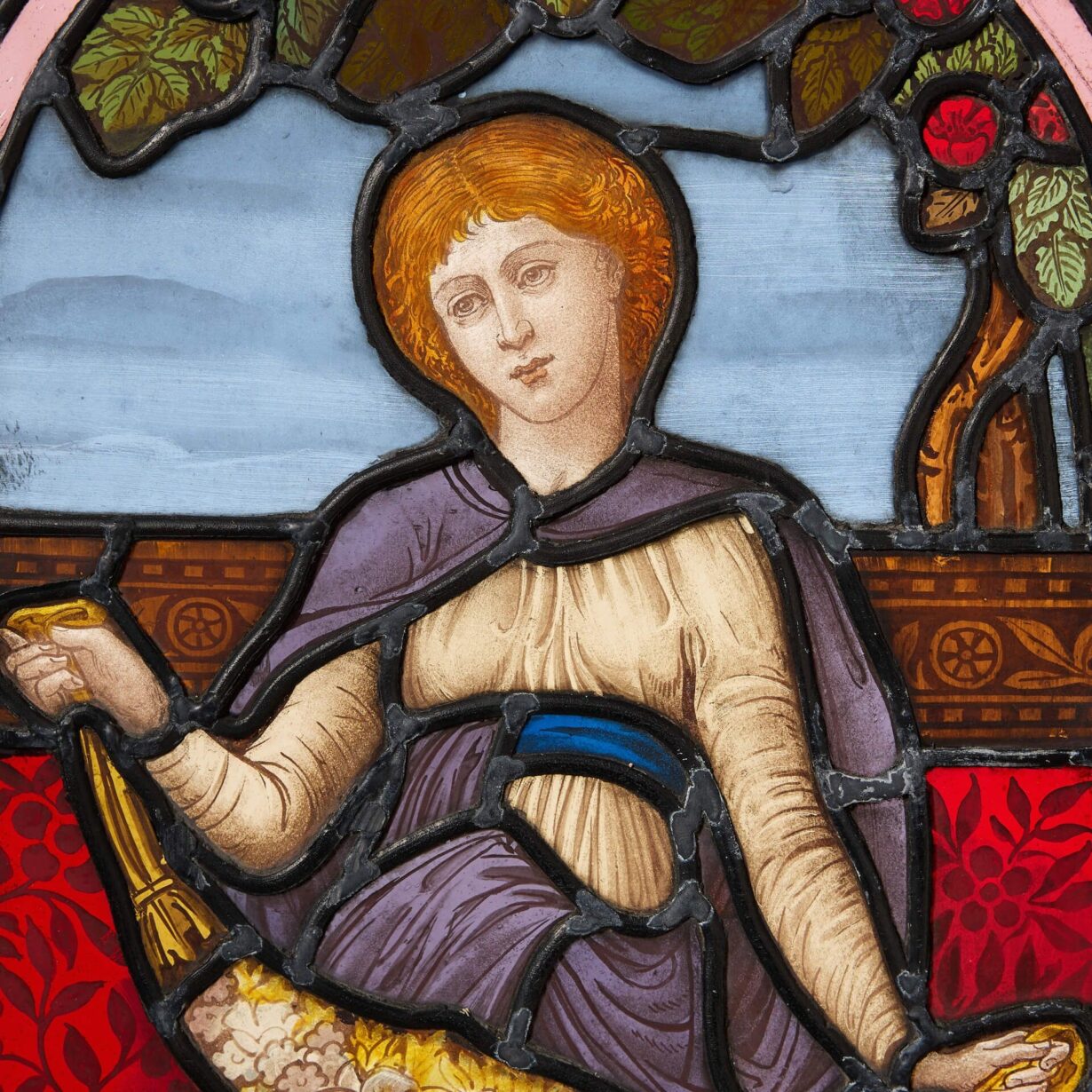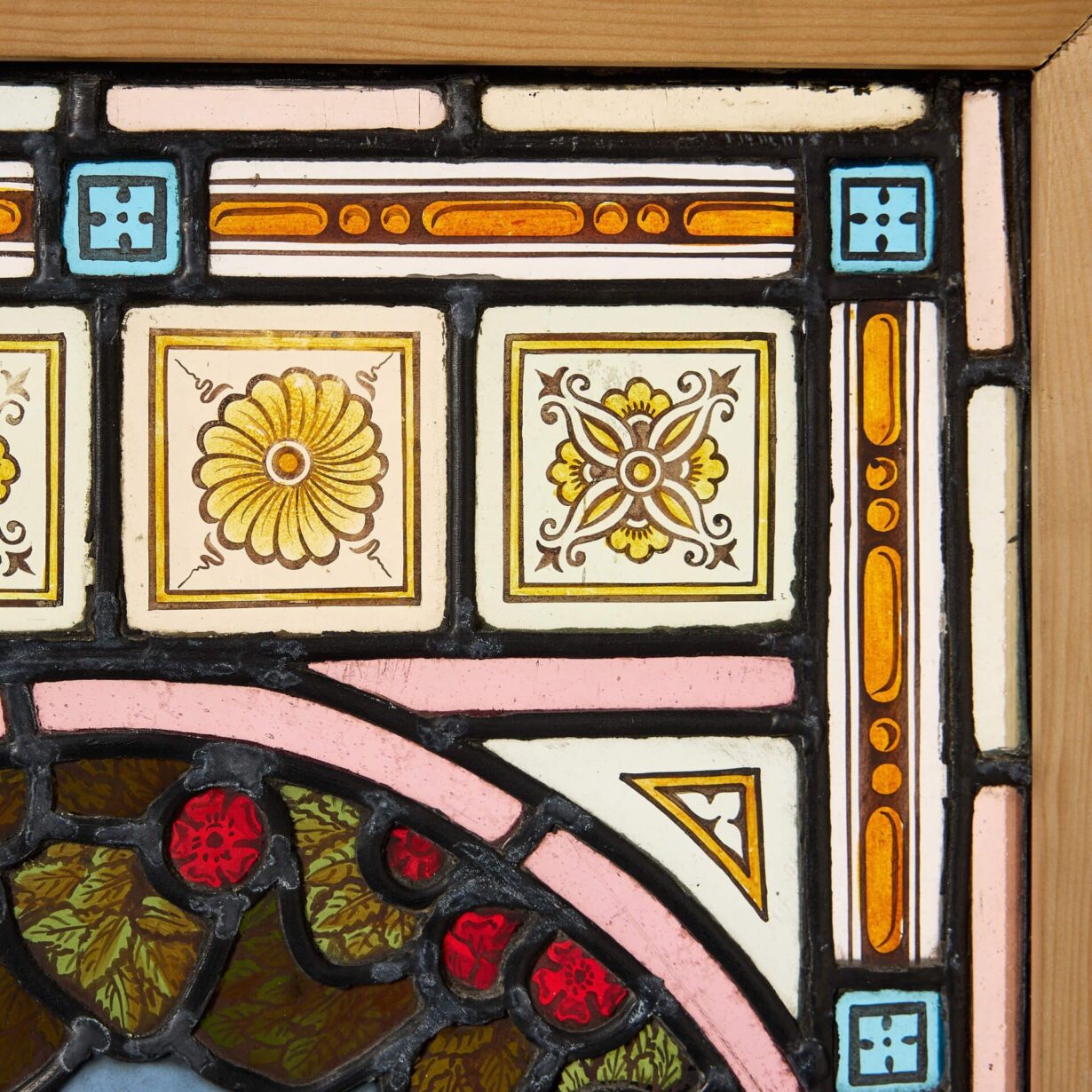 back to topAn elegant English aesthetic movement stained glass window, circa 1890, the central arched panel depicting a classical maiden in a garden holding a garland of flowers. Evoking a sense of Victorian romanticism, this beautiful window will look stunning in any property with its serene subject and multitude of colours and patterns, the outer panes handpainted with florals and edged with bead and reel detail.