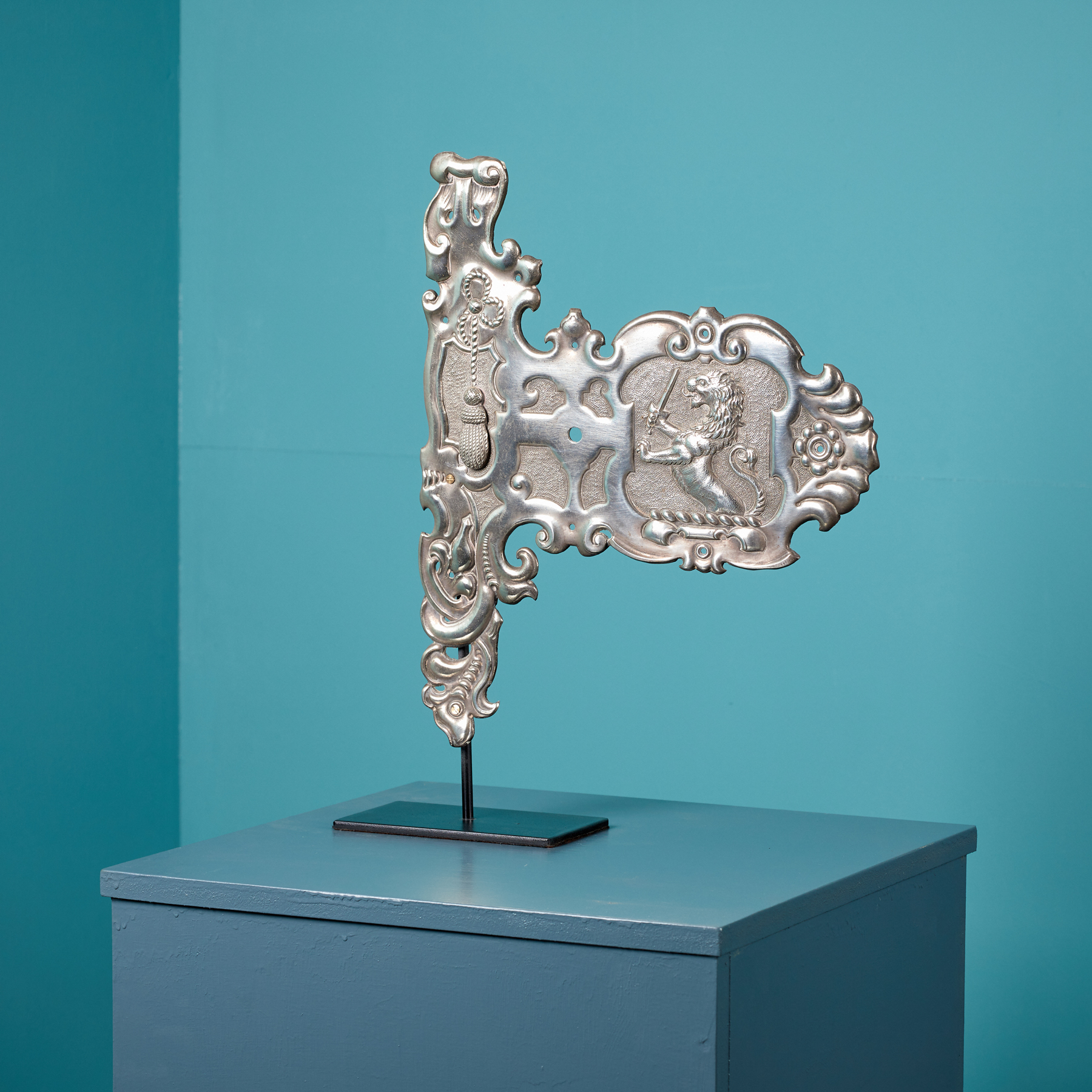 Antique Armorial Door Escutcheon Plate. A white metal armorial door escutcheon plate with engraved detail, featuring the City of Londons lion crest. Additional Dimensions Plate Height 42 cm Width 35 cm Depth 0.5 cm