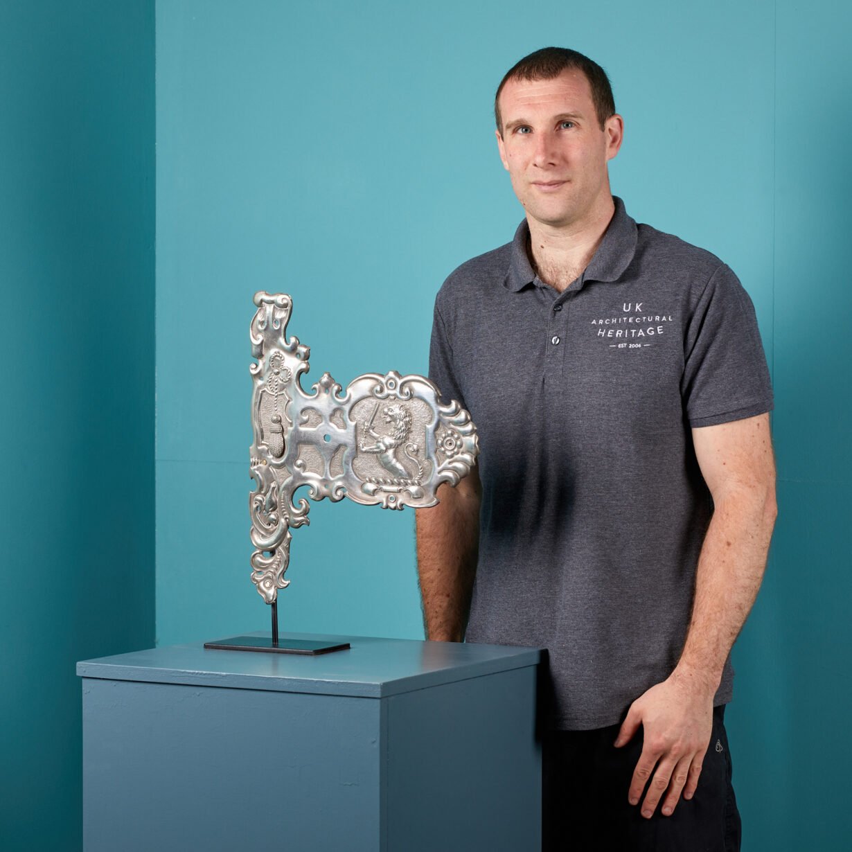 back to topAntique Armorial Door Escutcheon Plate. A white metal armorial door escutcheon plate with engraved detail, featuring the City of Londons lion crest.