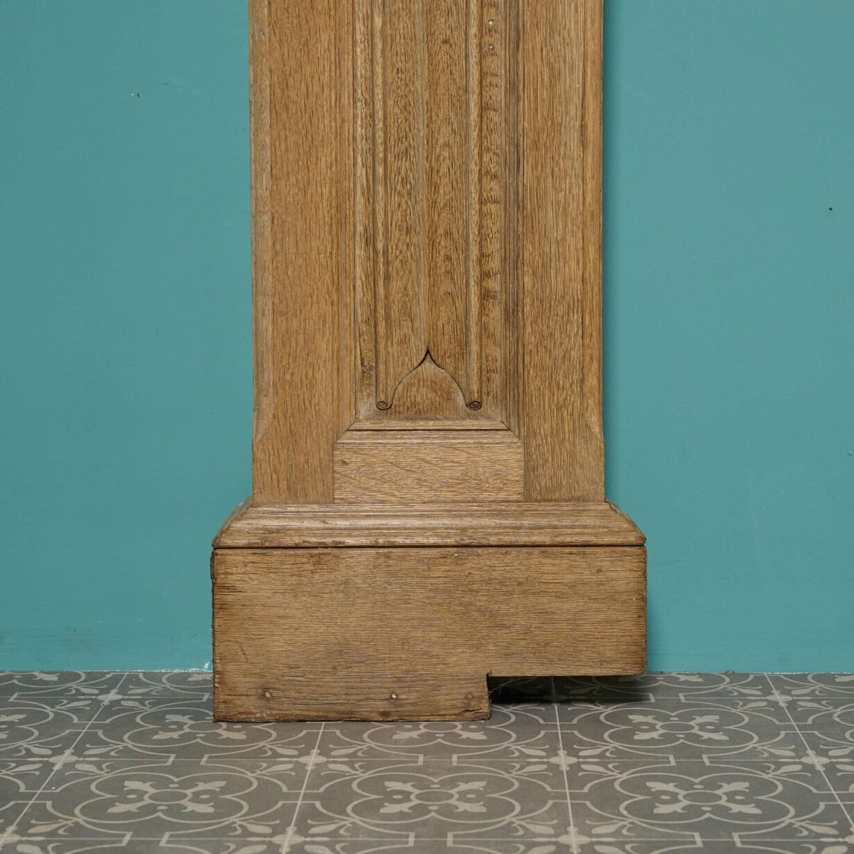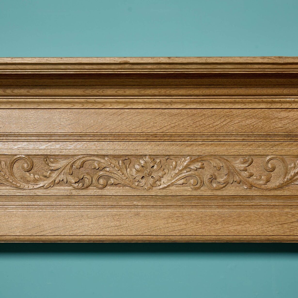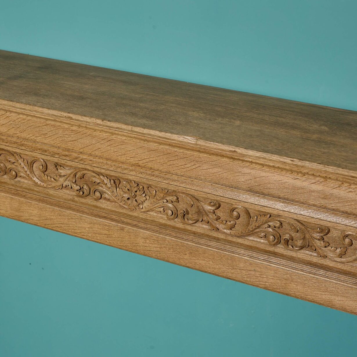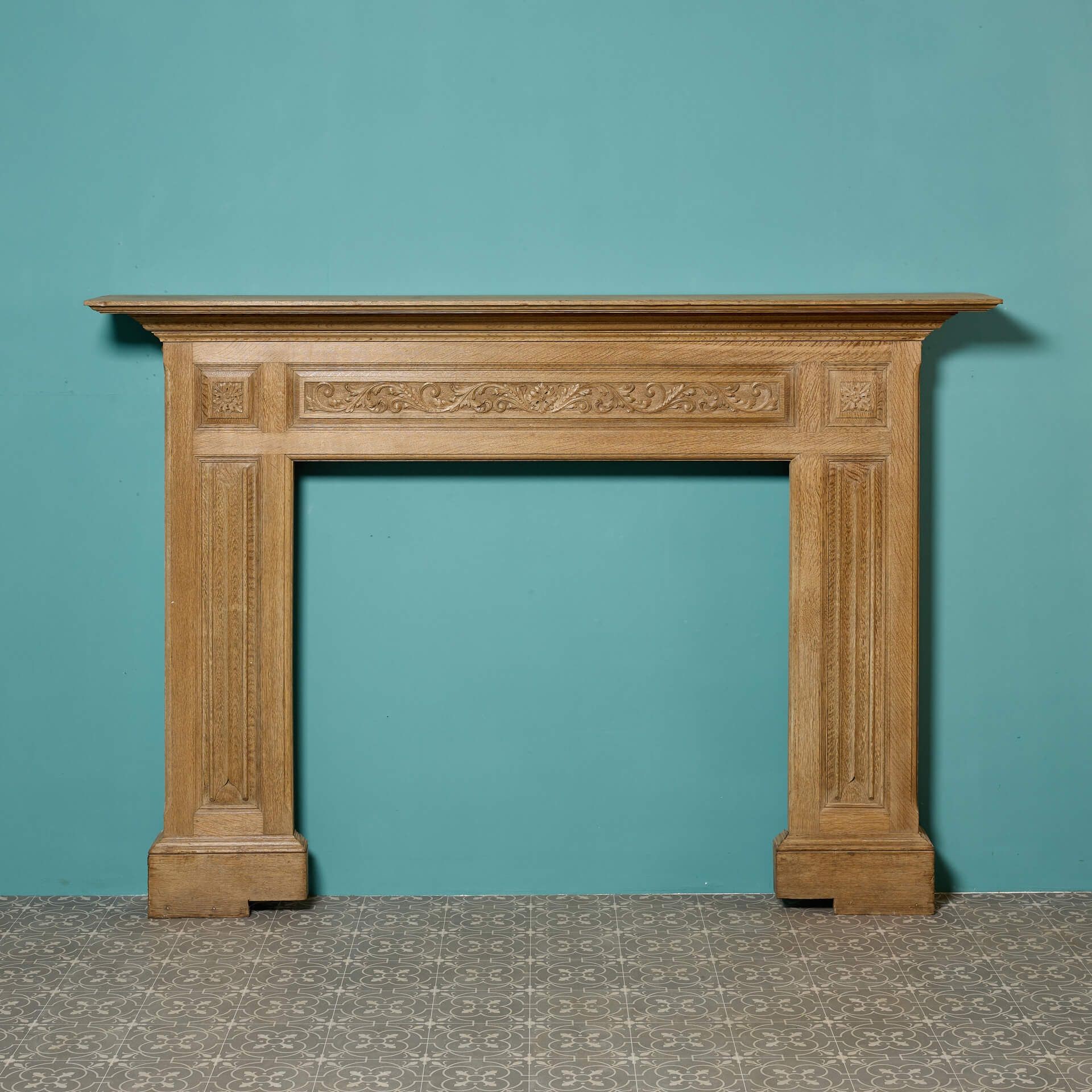 back to topA large antique English carved oak fireplace surround, circa 1880. With its light oak colour and simple styling, this antique fire surround is a handsome addition to interiors traditional and contemporary alike. Features include a frieze panel carved with foliage, paterae end blocks and carved linen fold jambs.