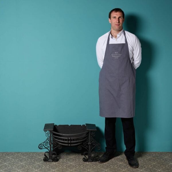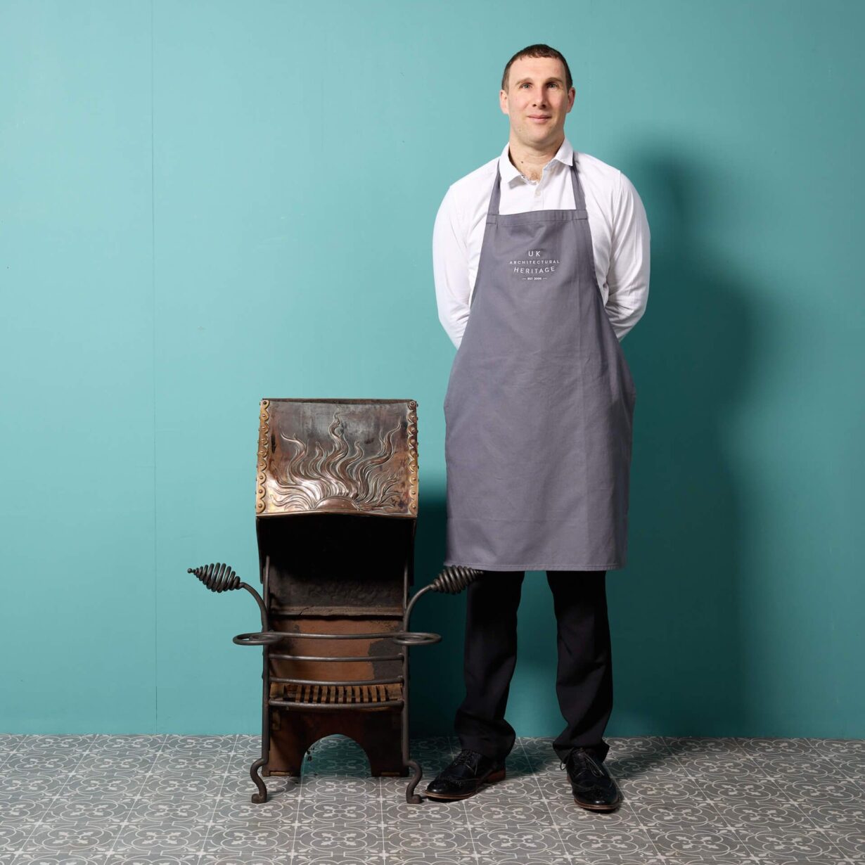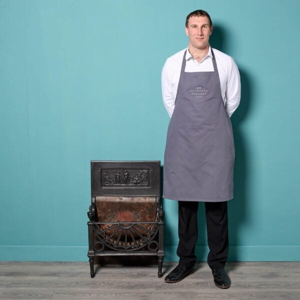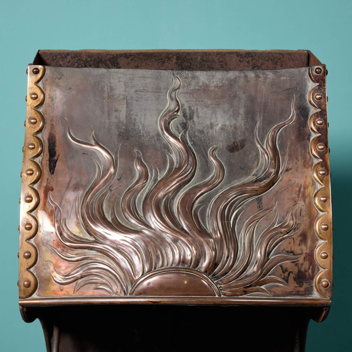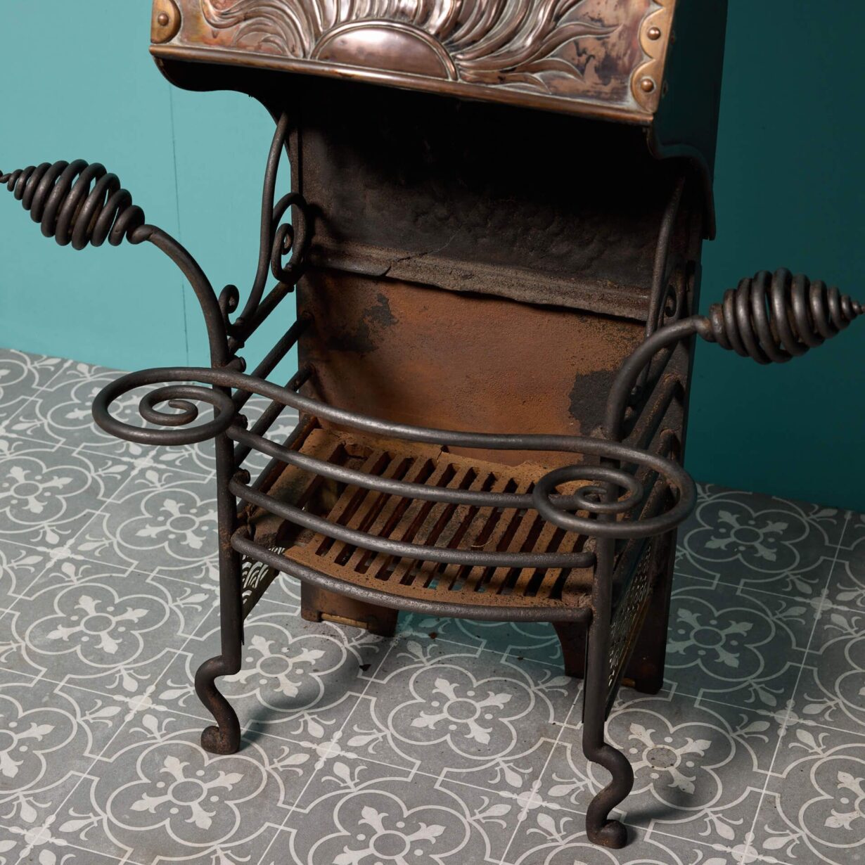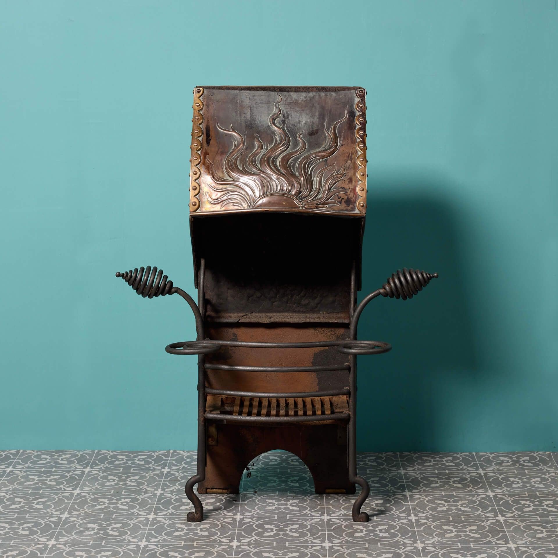 back to topAn antique English aesthetic movement fire grate. The three barred fire grate is decoratively cast with an aesthetic movement motif of a sun to its copper canopy, supported by stylised finials above sturdy scrolled feet.