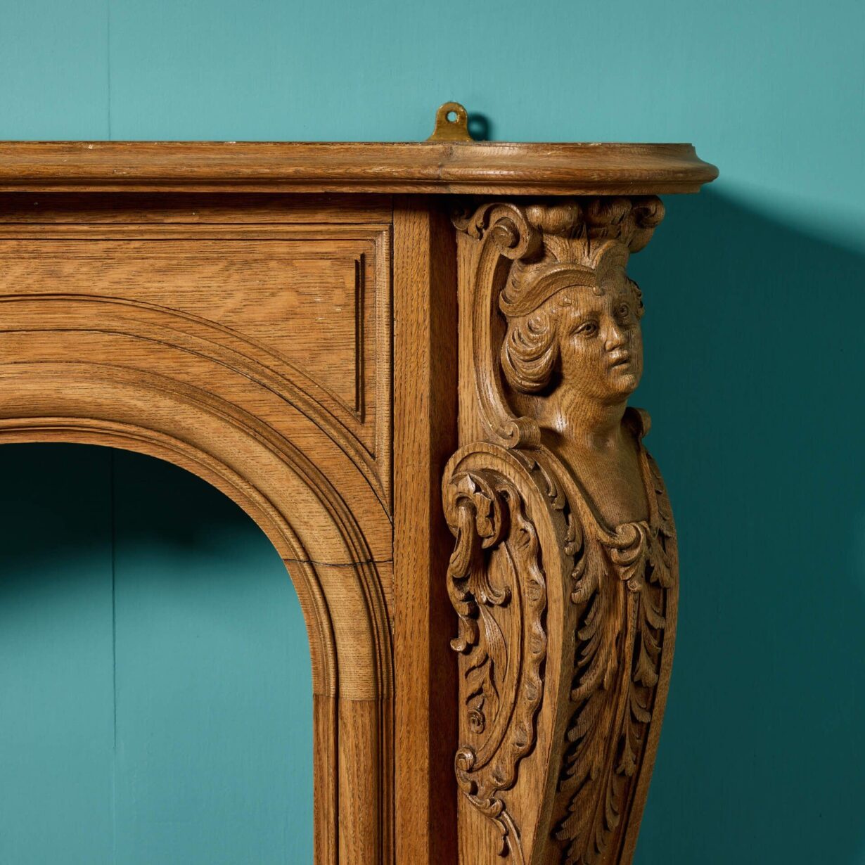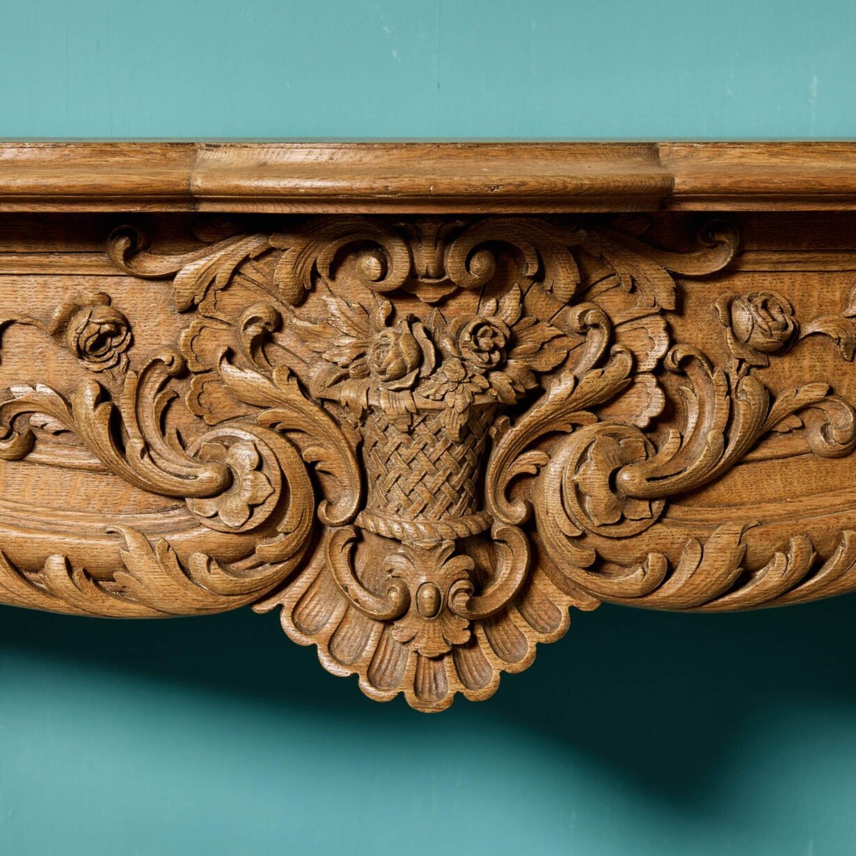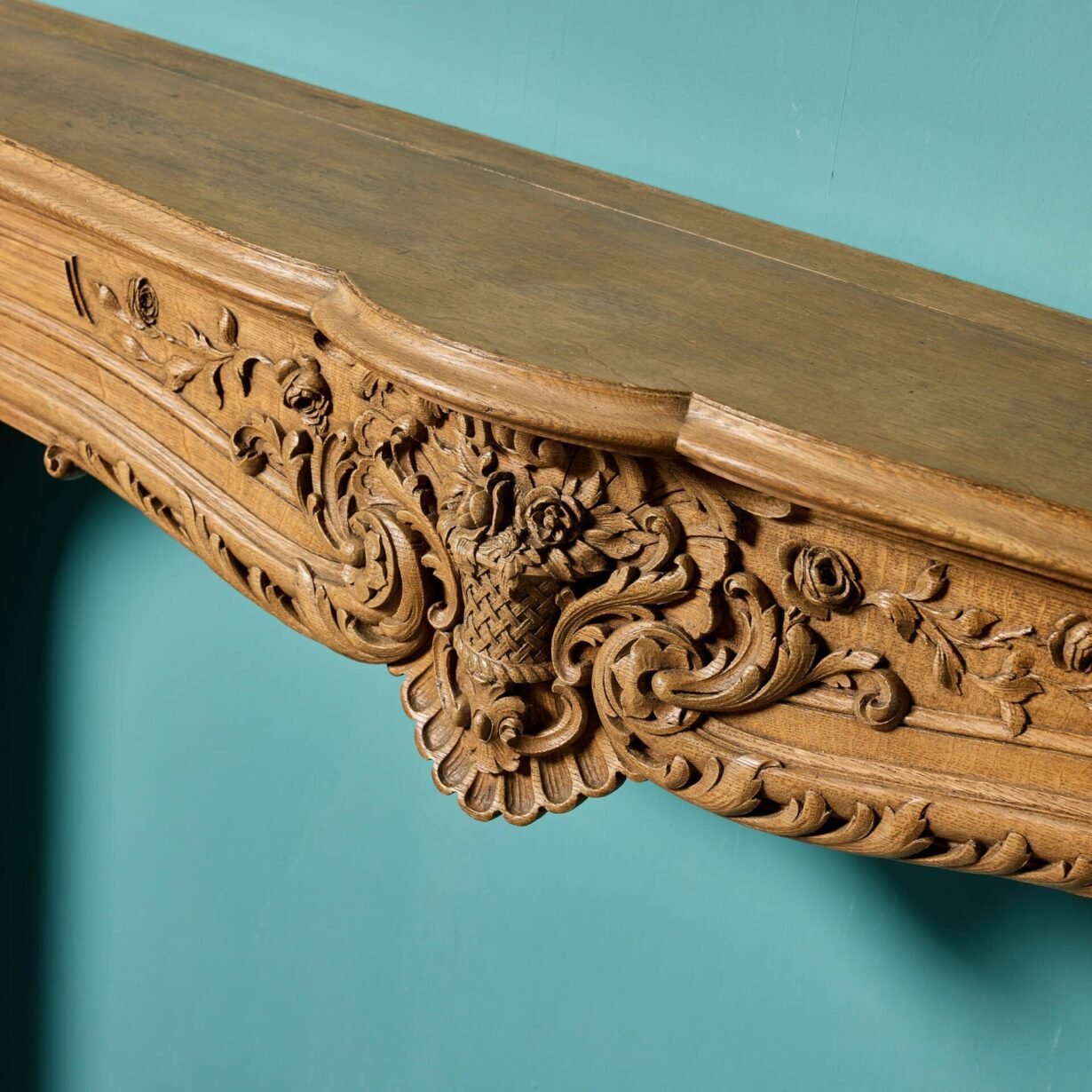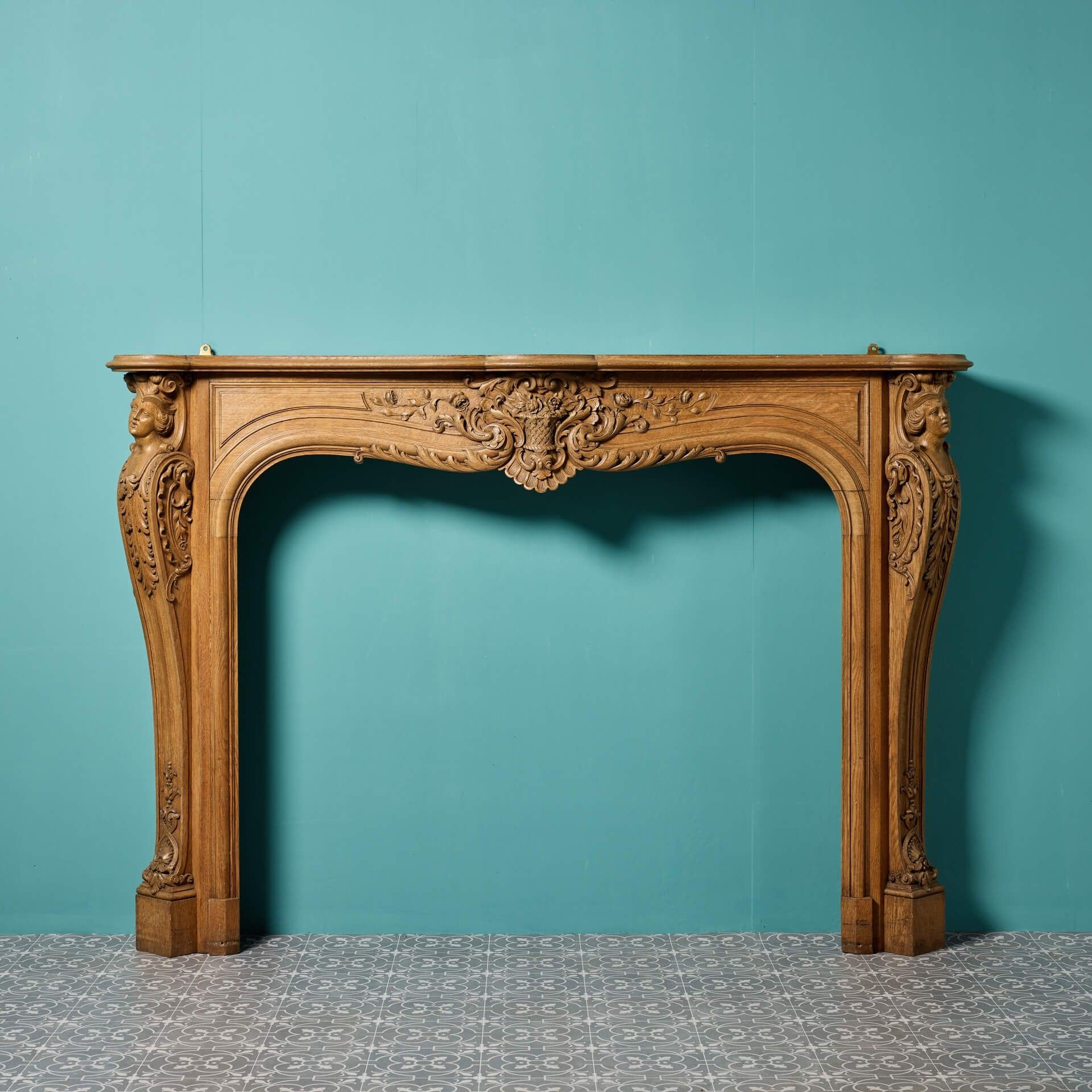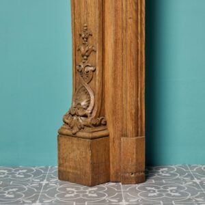 back to topAn English Louis style carved oak fire surround, reclaimed from a country house near Bedford. Dating to circa 1820, this antique fireplace is exceptionally ornate, crafted at the hand of a talented early 19th century artisan. With a serpentine mantle, carved foliage on the frieze and jambs carved as Herms, it would make a striking feature surround in any traditional setting.