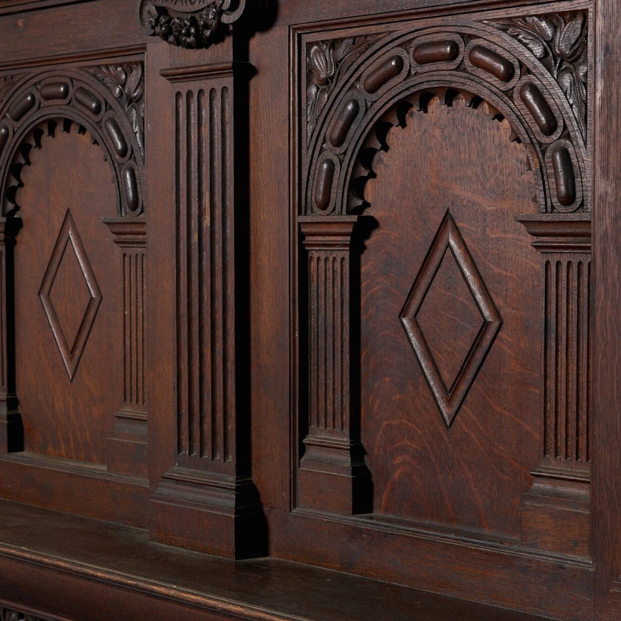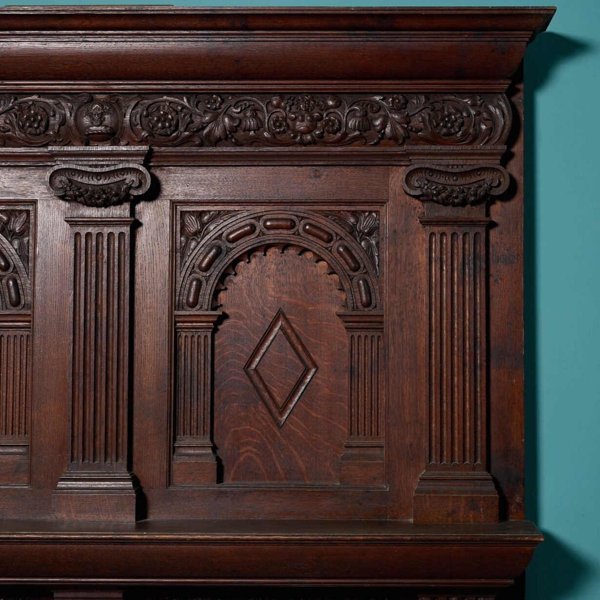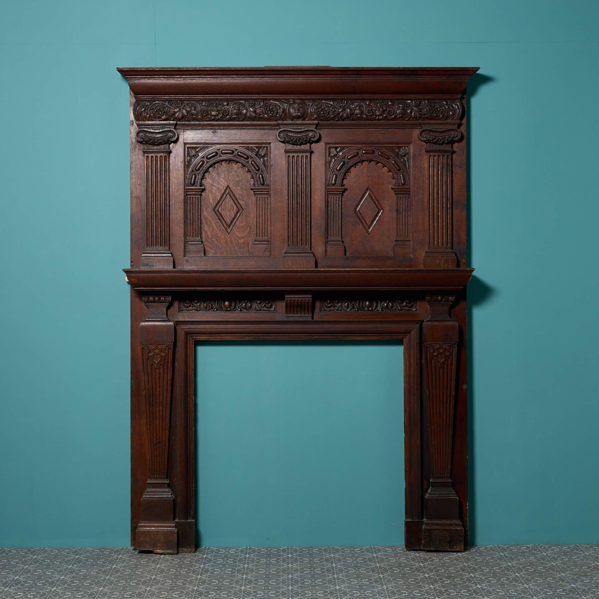 To the top is a spectacularly carved panel detailed with scrolling fruits and foliage with masks above a larger panel carved with grand columns and arches with the shelf and a large fireplace opening below, framed by two column-like jambs.