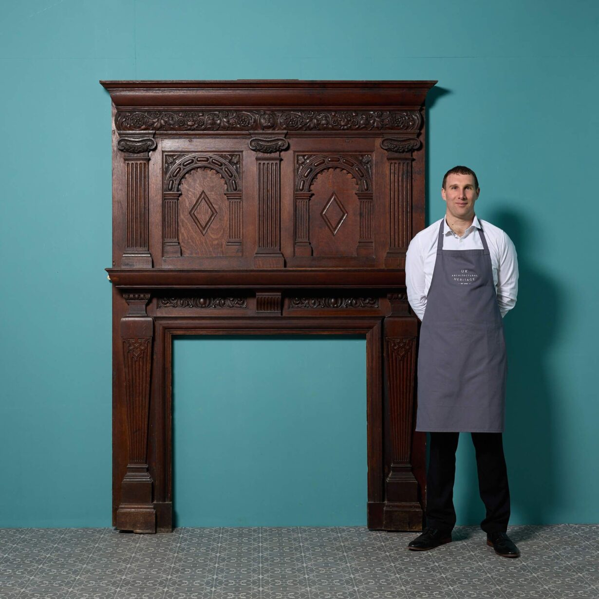 back to topA tall antique Jacobean style carved oak fireplace with overmantel reclaimed from a manor house in Suffolk. Impressive in style and stature, this fireplace dates from the late 19th century but encompasses earlier Tudor and Jacobean styles. Today, it makes a prestigious feature in the main room of a large period property, its solid oak construction and rich wood colour complimenting traditional styles.