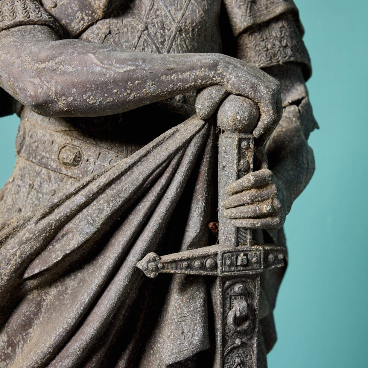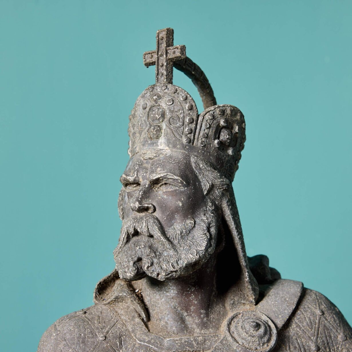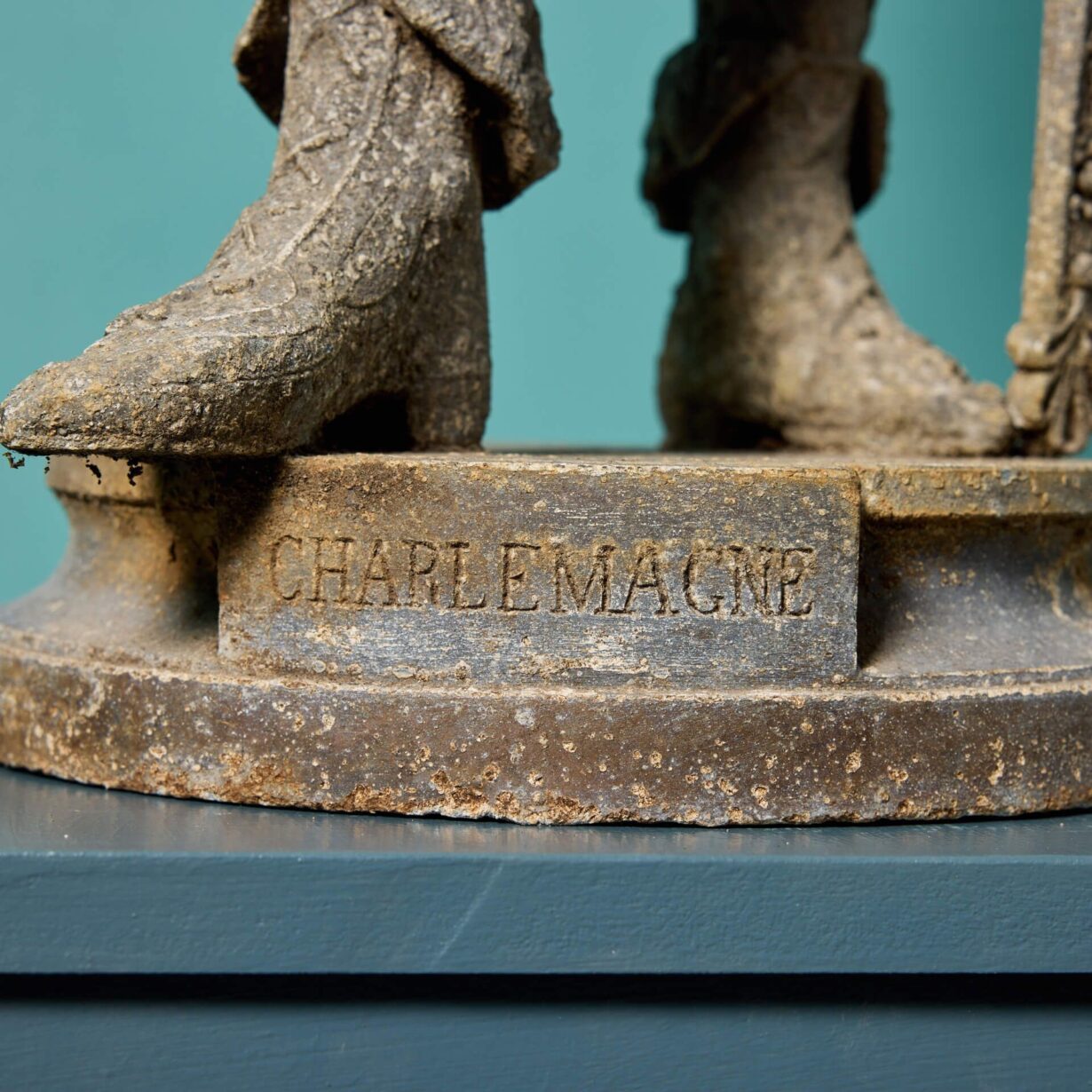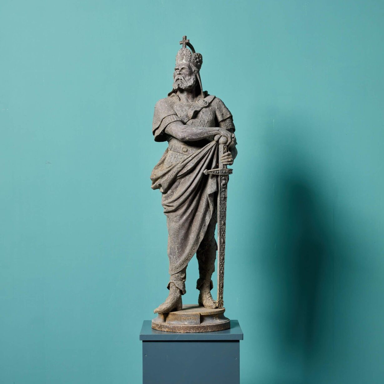 back to topAn antique spelter garden statue of Charlemagne (Charles the Great) for use inside or out. Dating from the early 20th century, this statue models the 8th-9th century King and emperor as he is often depicted, wearing a crown with cross and holding a sword.