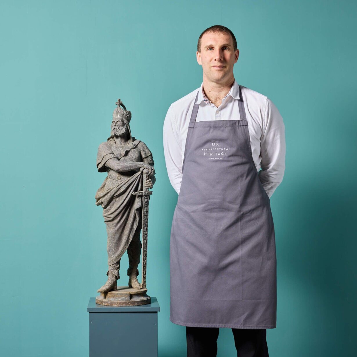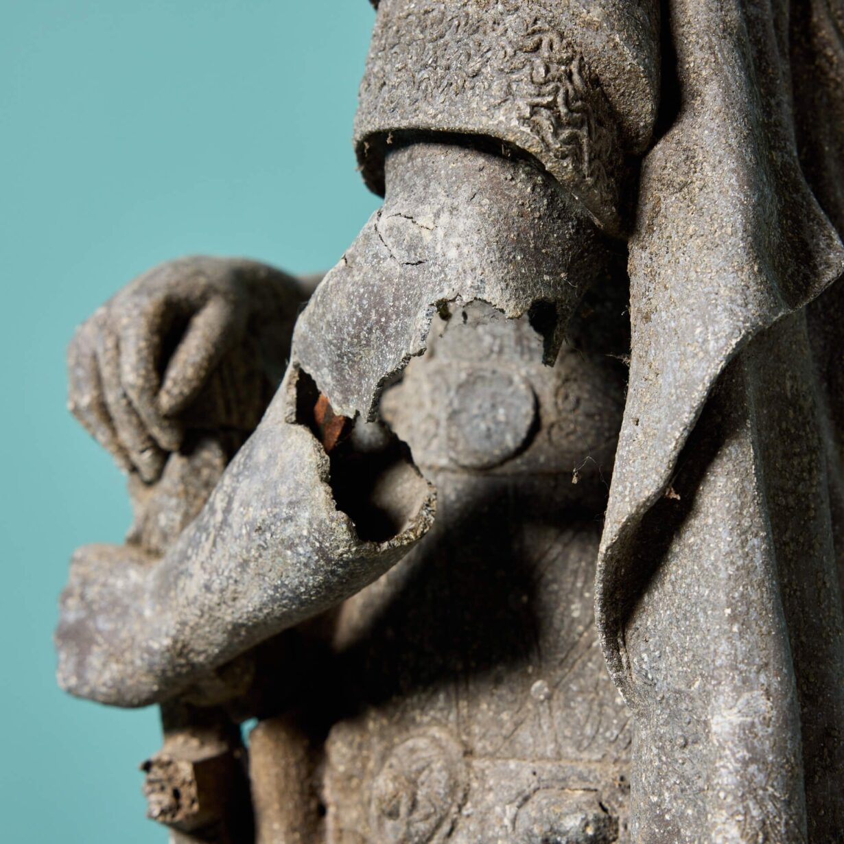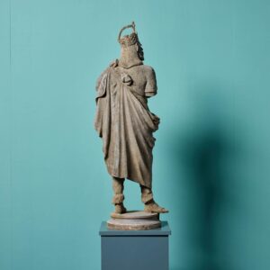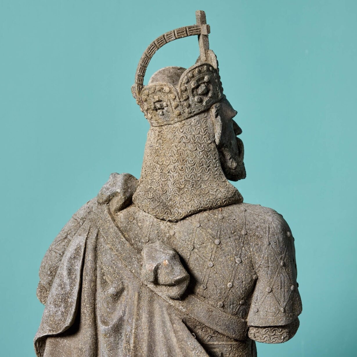 back to topAn antique spelter garden statue of Charlemagne (Charles the Great) for use inside or out. Dating from the early 20th century, this statue models the 8th-9th century King and emperor as he is often depicted, wearing a crown with cross and holding a sword.