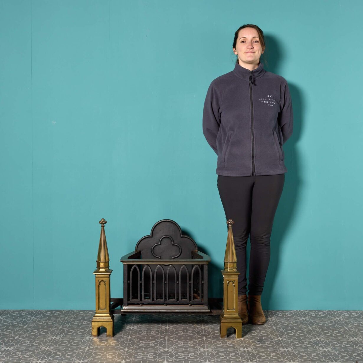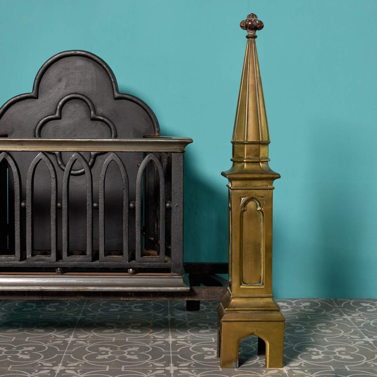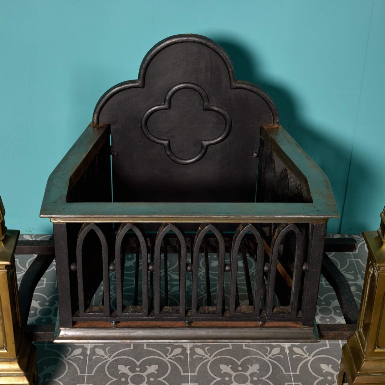 back to topAn unusual late 19th century antique gothic style fire grate, reclaimed from a property in Sussex. Pairing function with form, this fire grate is a striking piece for any setting, defined by its distinguished brass fire dog finials and strong quatrefoil profile.