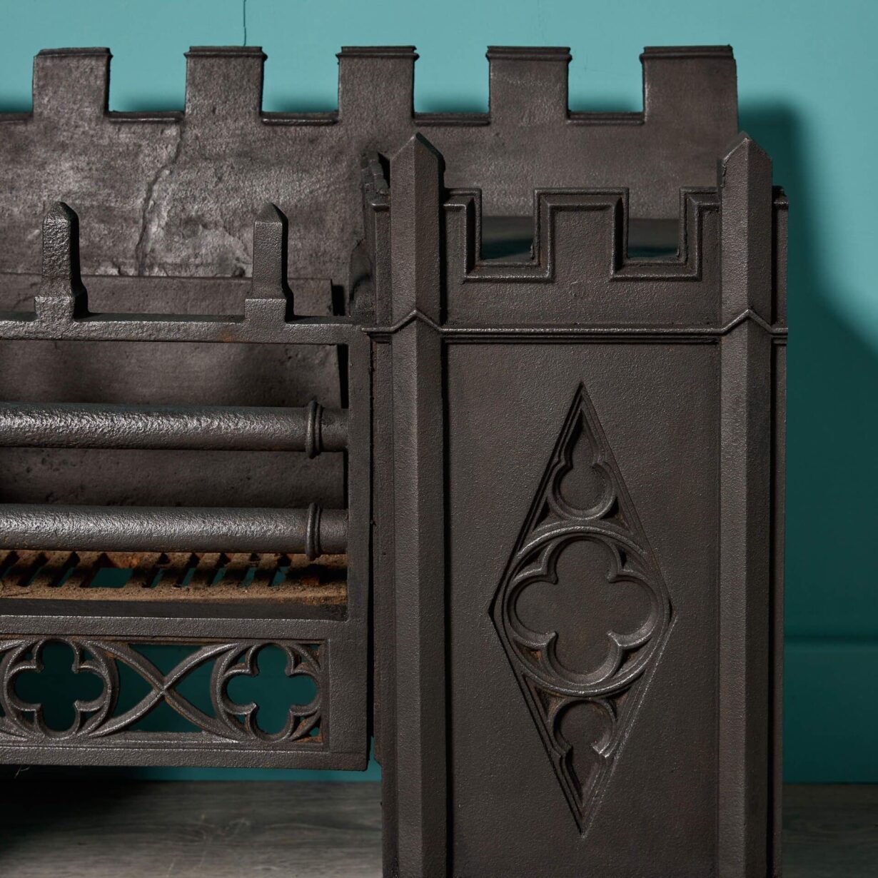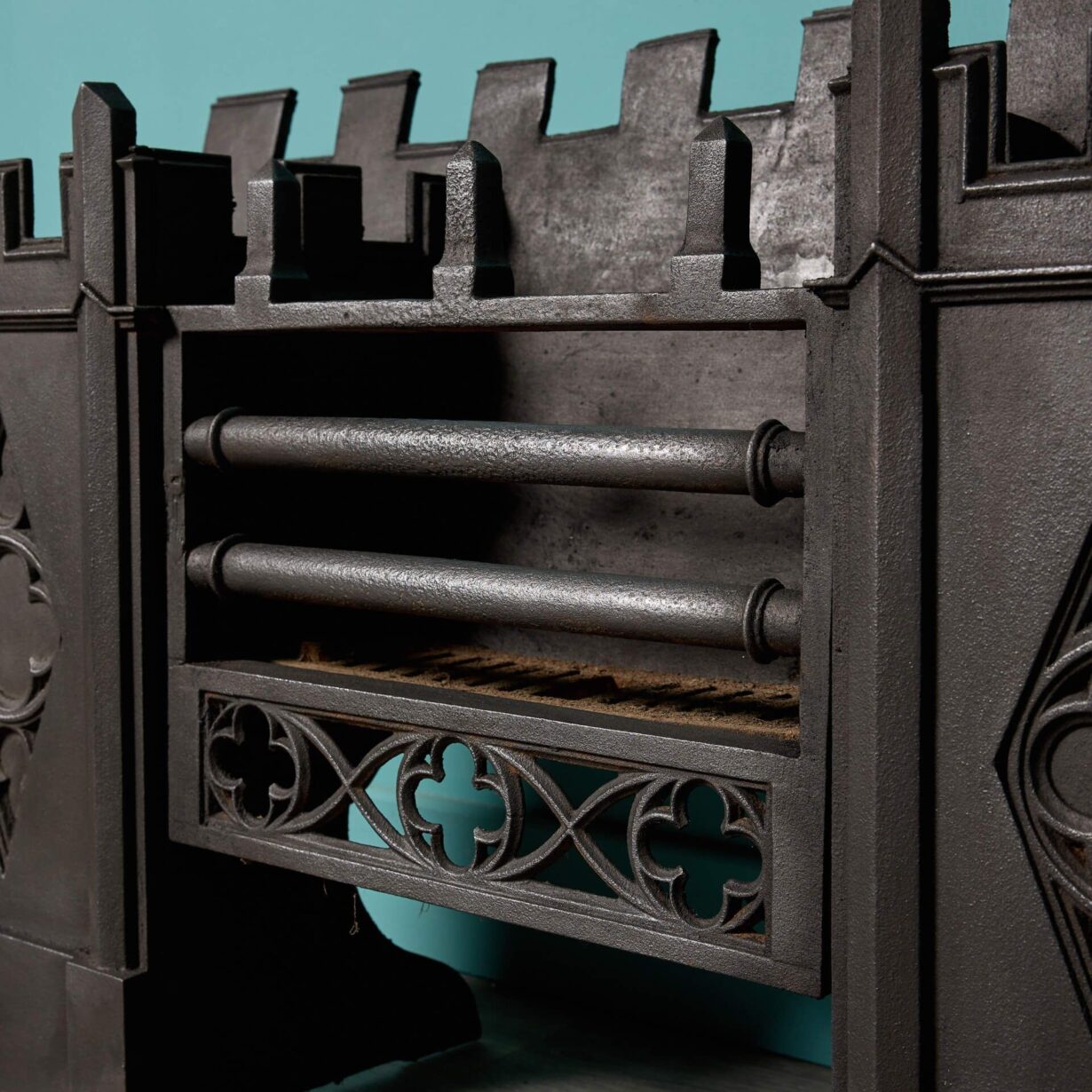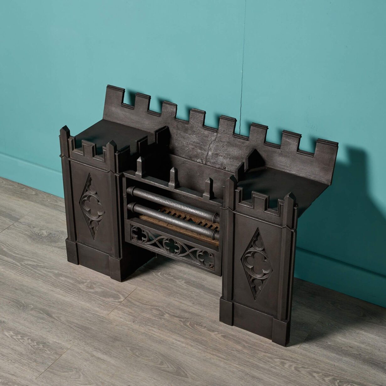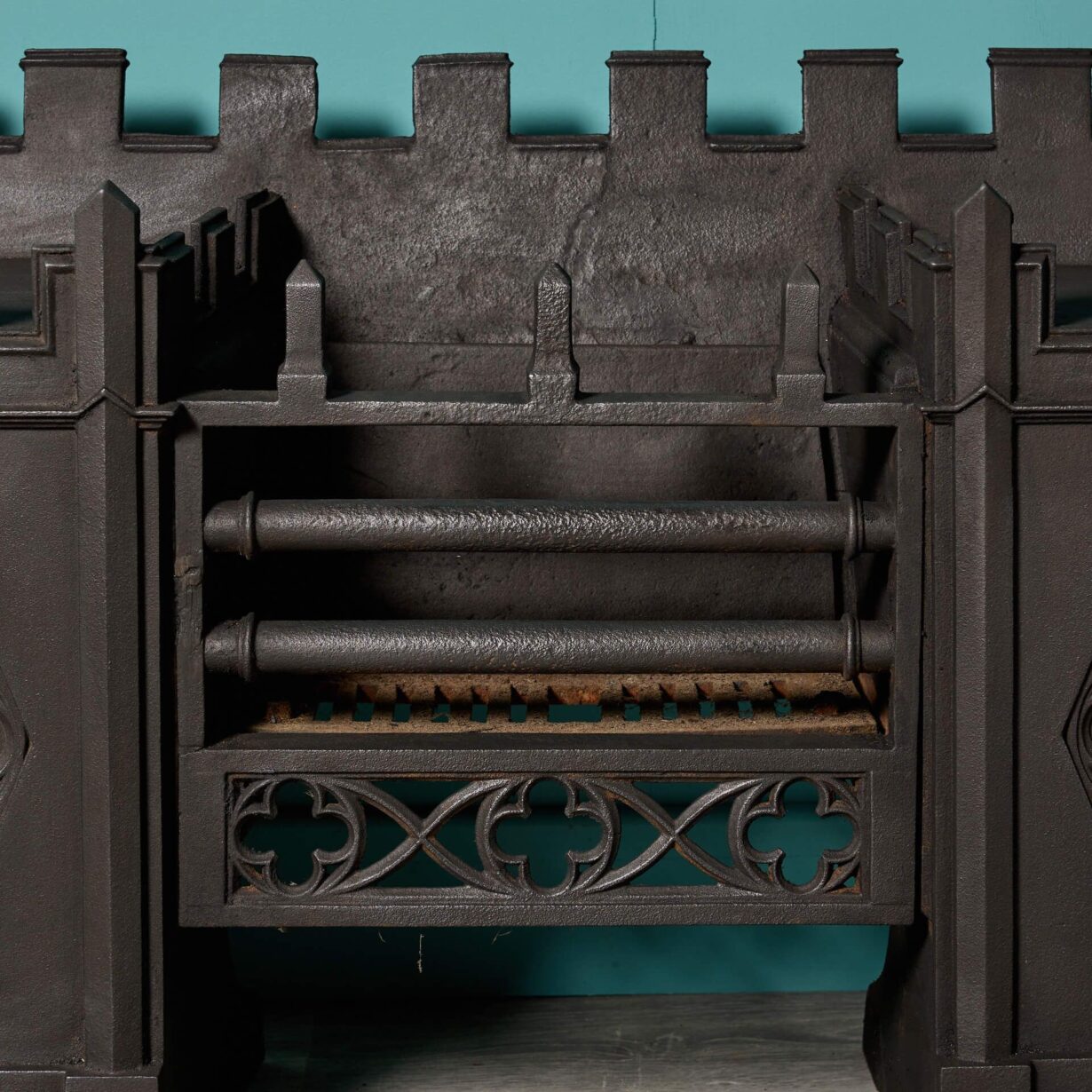 back to top| A Victorian era Gothic style hob grate dating from circa 1830 and unusually decorated with castellations and quatrefoils. Finished in black graphite polish, this antique cast iron hob grate will make a character feature of a modern fireplace or period chimney breast. |