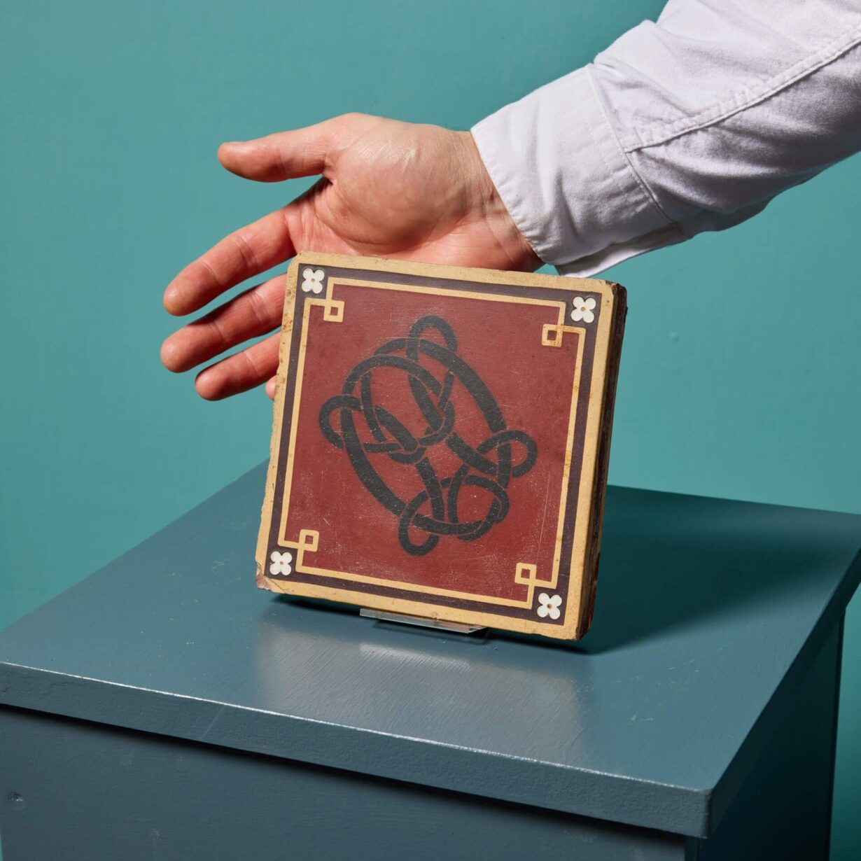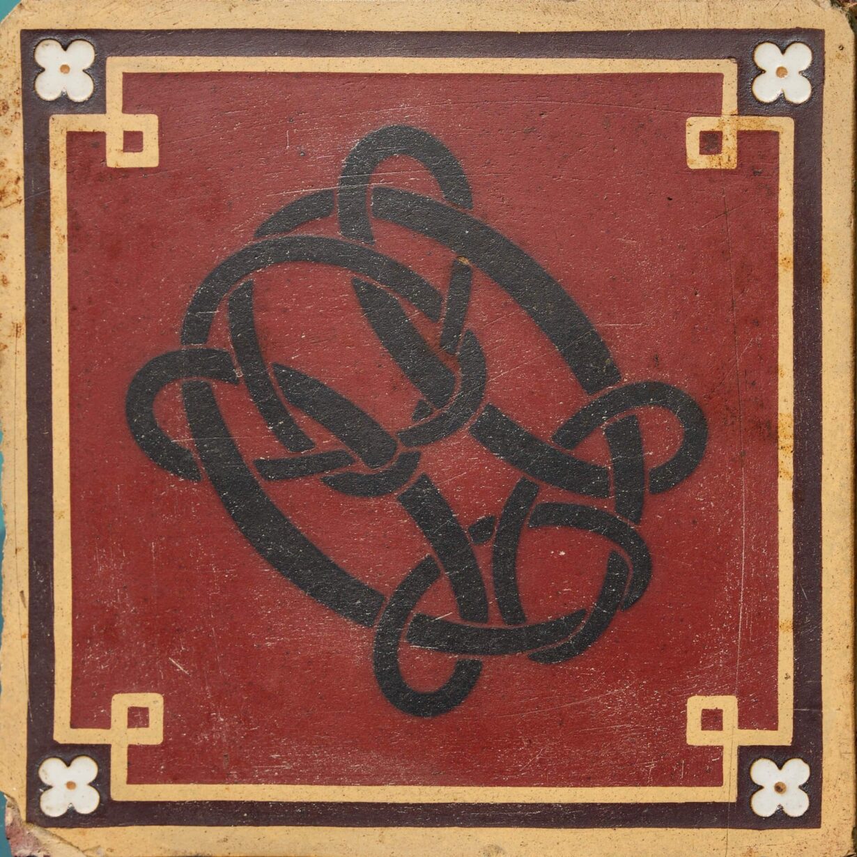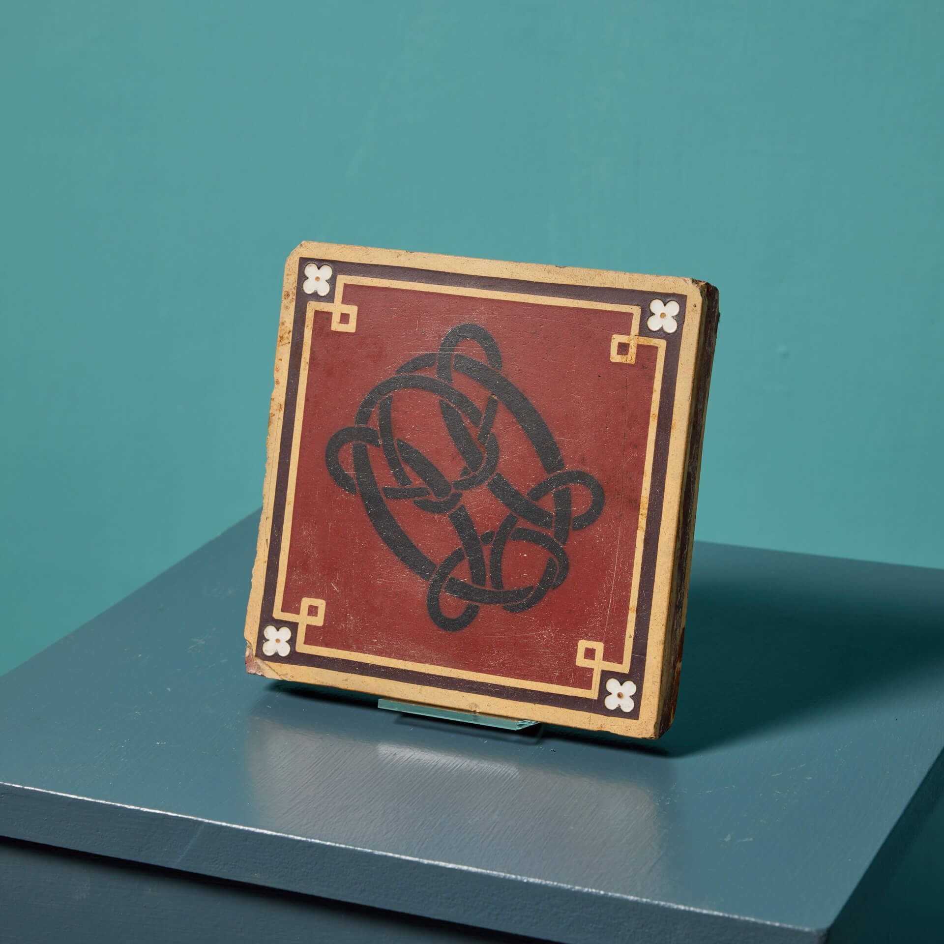 back to topAn unusual antique encaustic Minton tile with a monogram design dating from circa 1863. This antique encaustic tile features a black monogram on a deep red backdrop bordered with buff geometric border with flower embellishments, stamped to the reverse with ‘Minton & Co. Patent, Stoke Upon Trent’. A brilliant collector’s piece!
