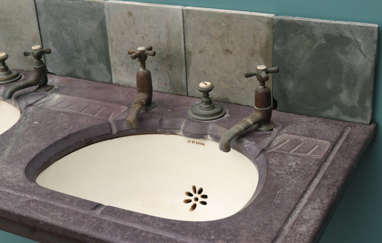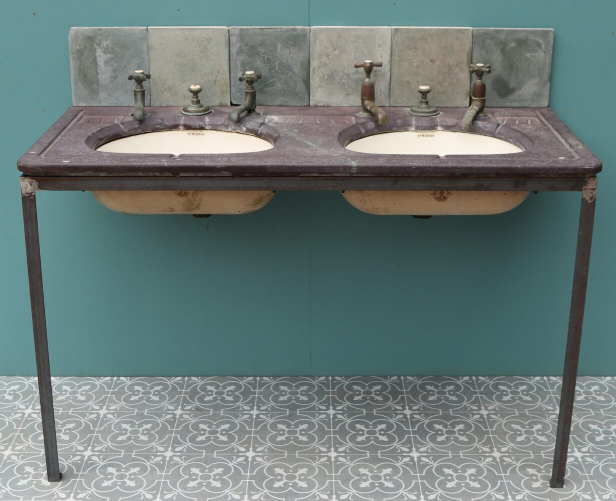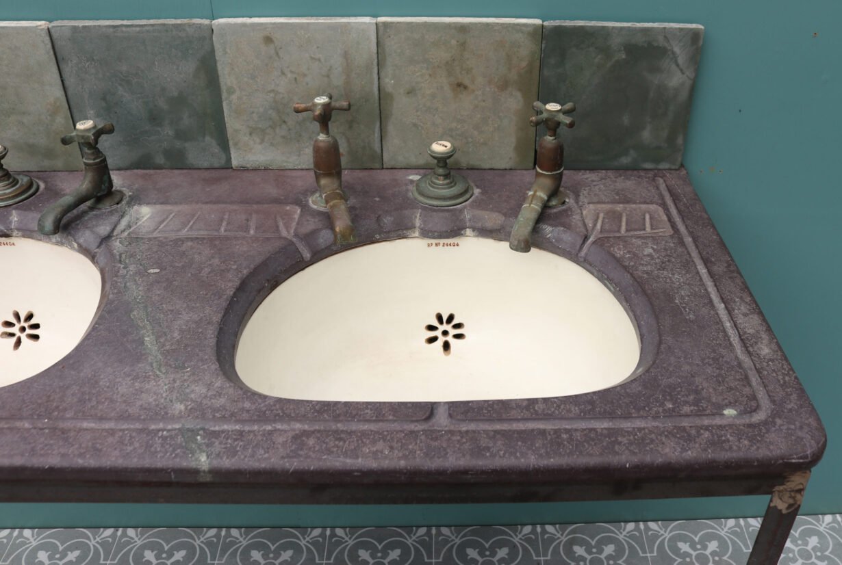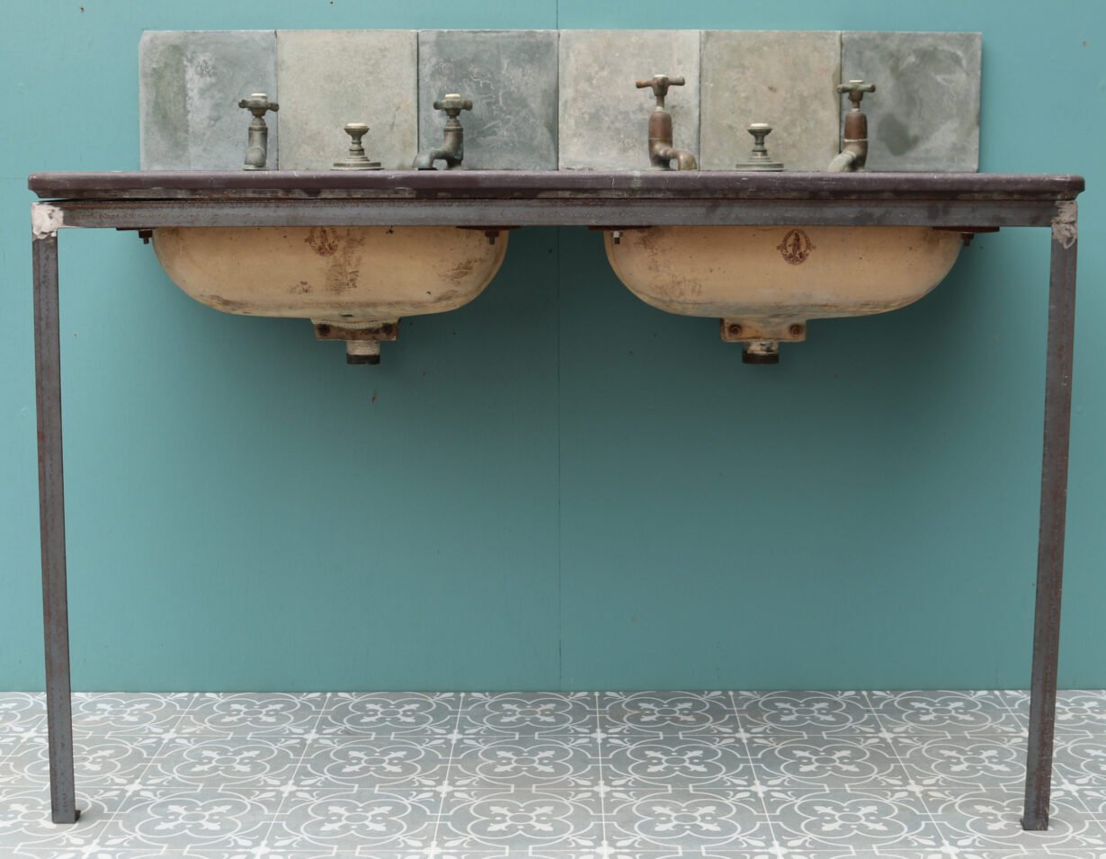back to topA reclaimed antique double basin or sink by Morrison Ingram & Co. Registered design number 24404. Constructed with a slate top, and under-mounted glazed stoneware basins. Supplied on a modern steel stand and tiles to form a splash-back.