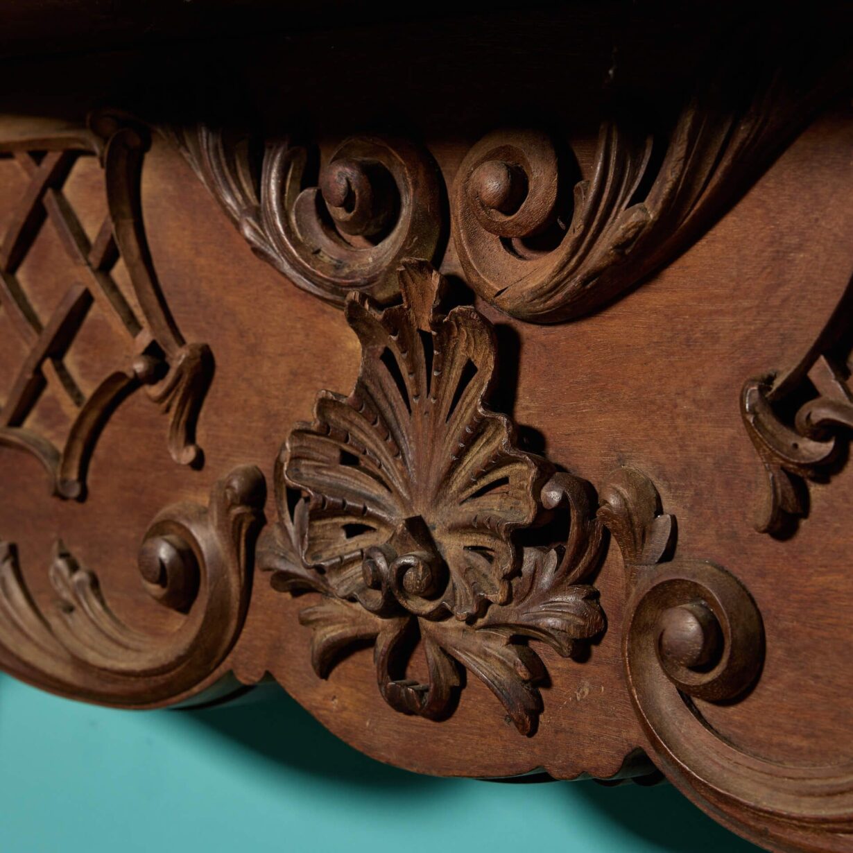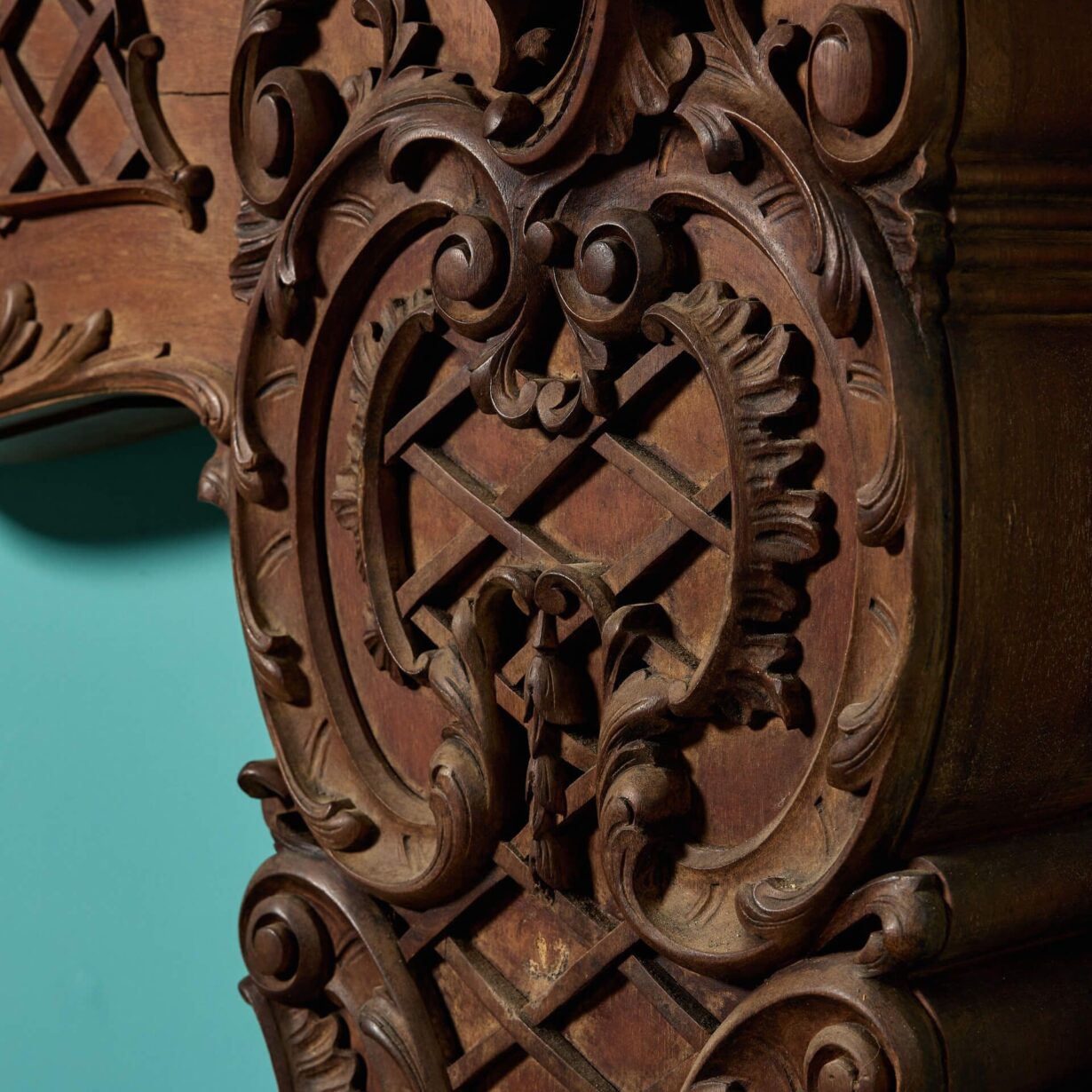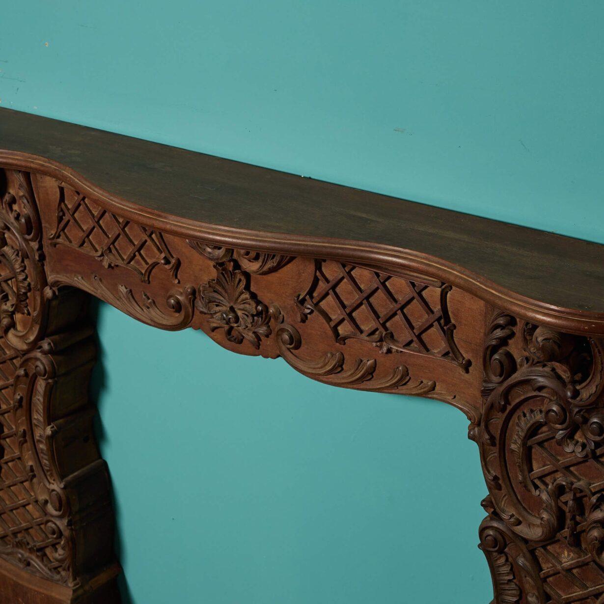 back to topAn unusual antique Rococo style carved mahogany fire surround, reclaimed from a house in Evesham. Featuring beautiful curves, scrolls and latticework throughout, this early 20th century antique fireplace is instilled with the opulence of the Rococo era, bringing finery and elegance to any setting.