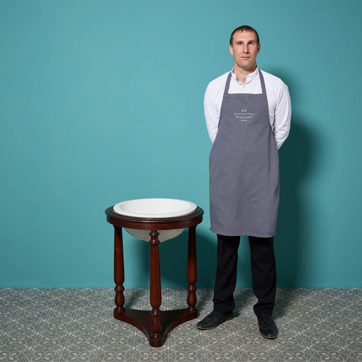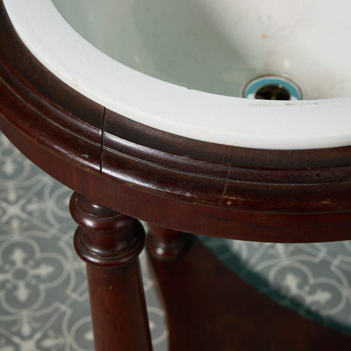 This large sink has a simple yet elegant white porcelain basin held on a striking mahogany one tier triform base with original fittings.
