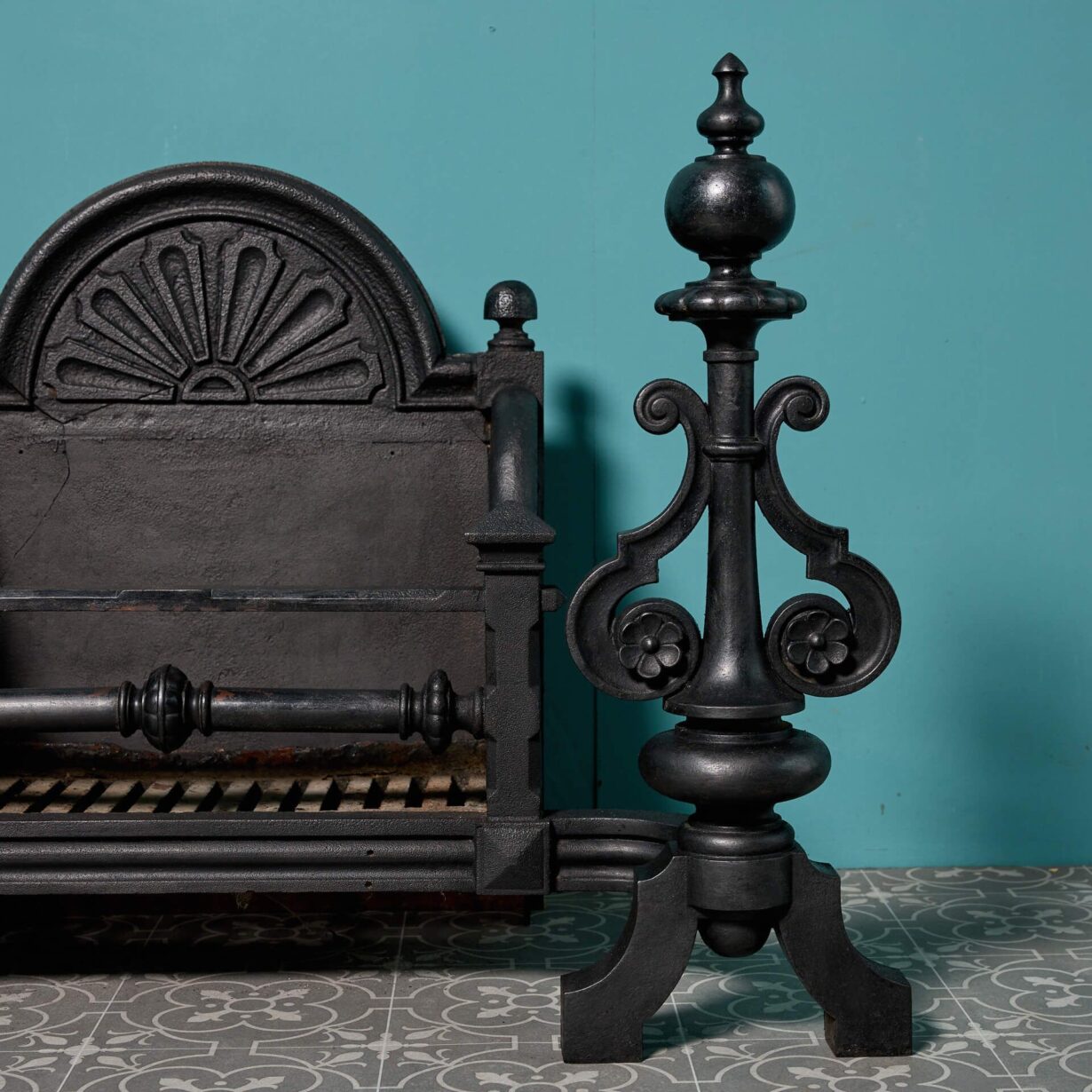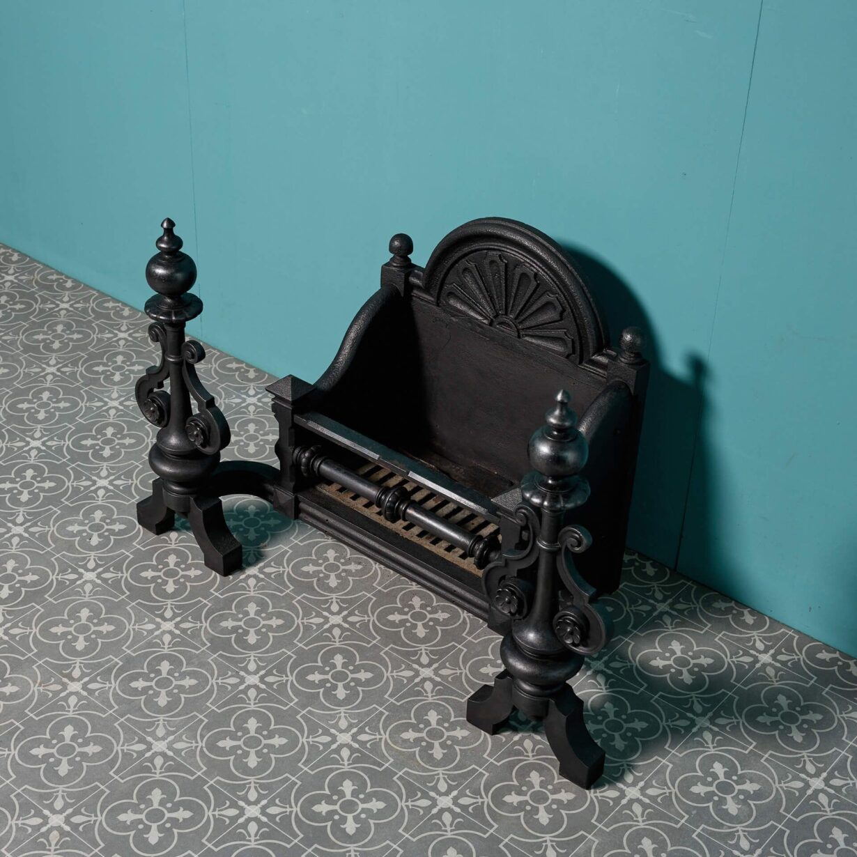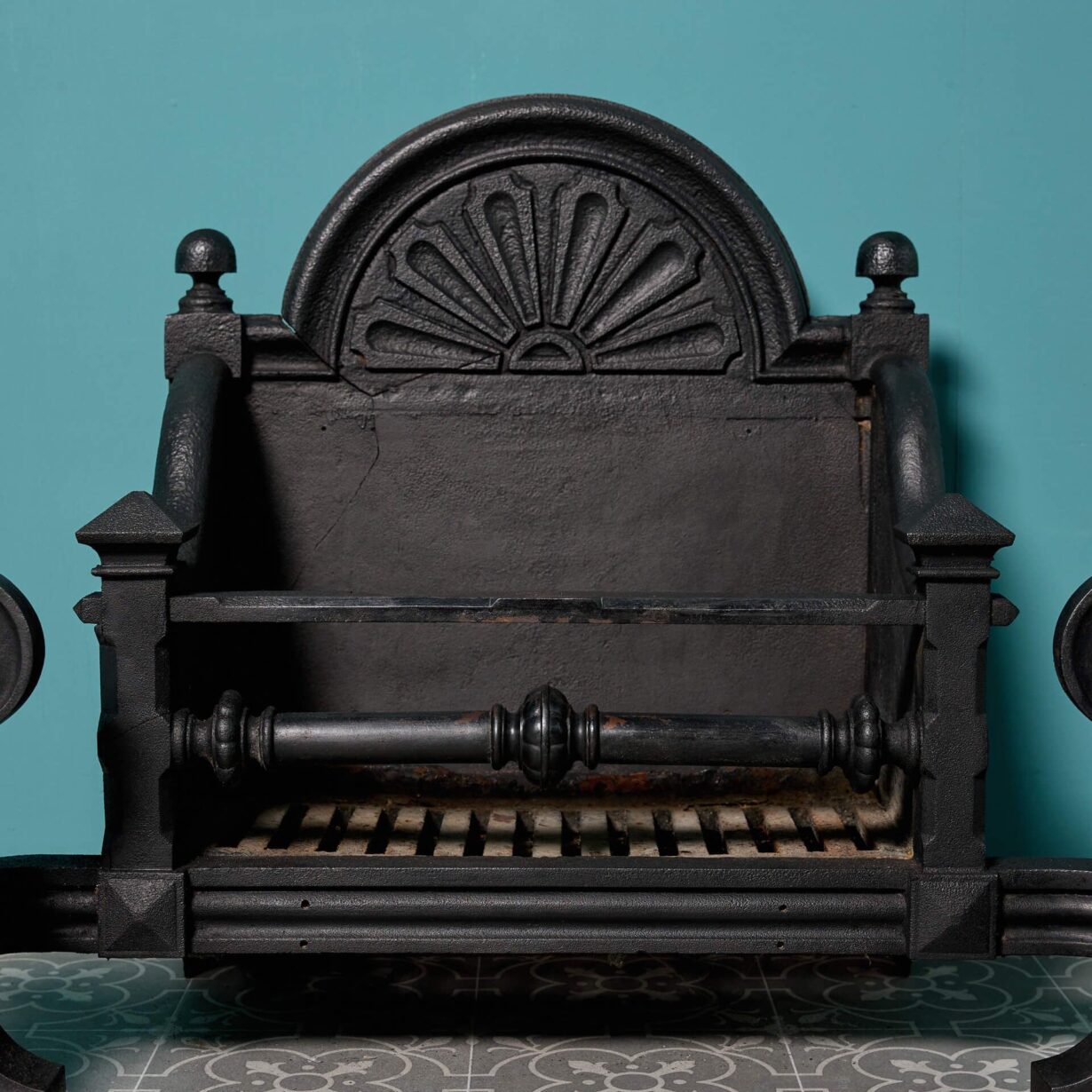 back to topAn antique Victorian period cast iron fire grate. With an arched back, shaped bars and bulbous finials, this fire grate has an abundance of charming features.