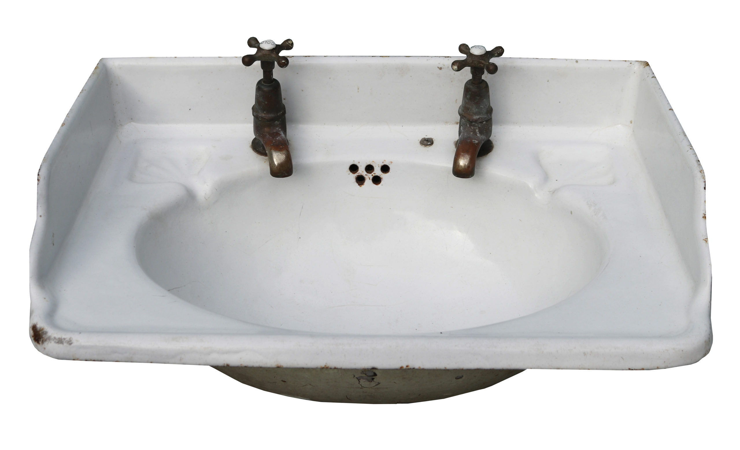 Good structural condition. Lightly worn enamel with wear and minor chips to places. Minor surface rust. Original taps included, but not tested.