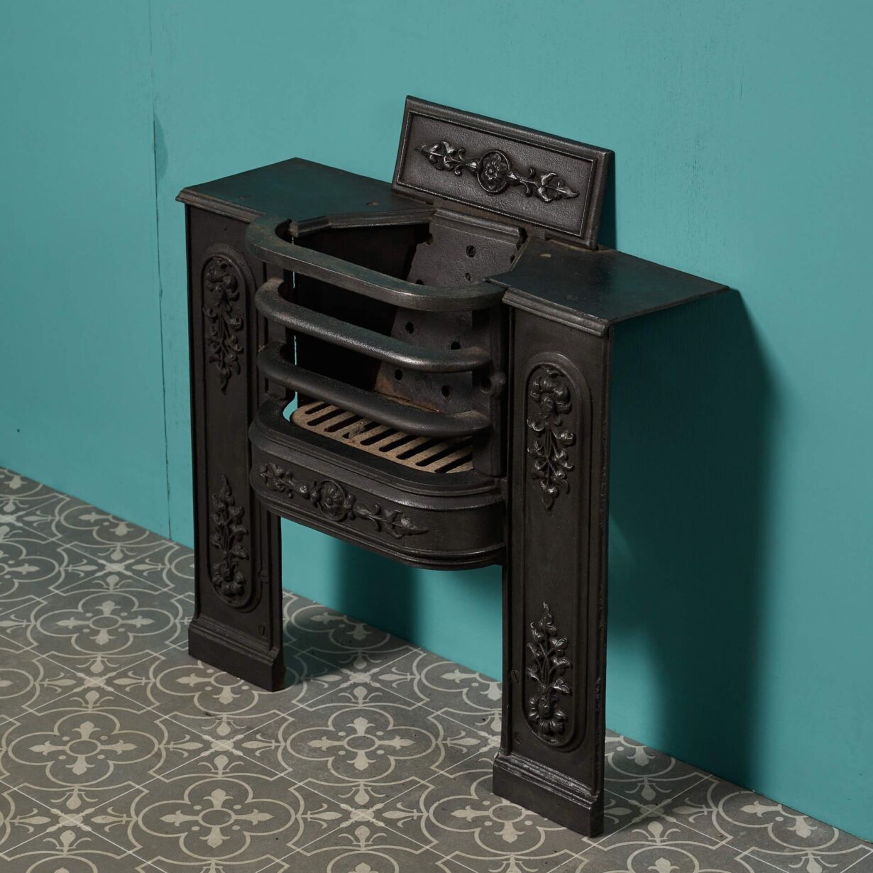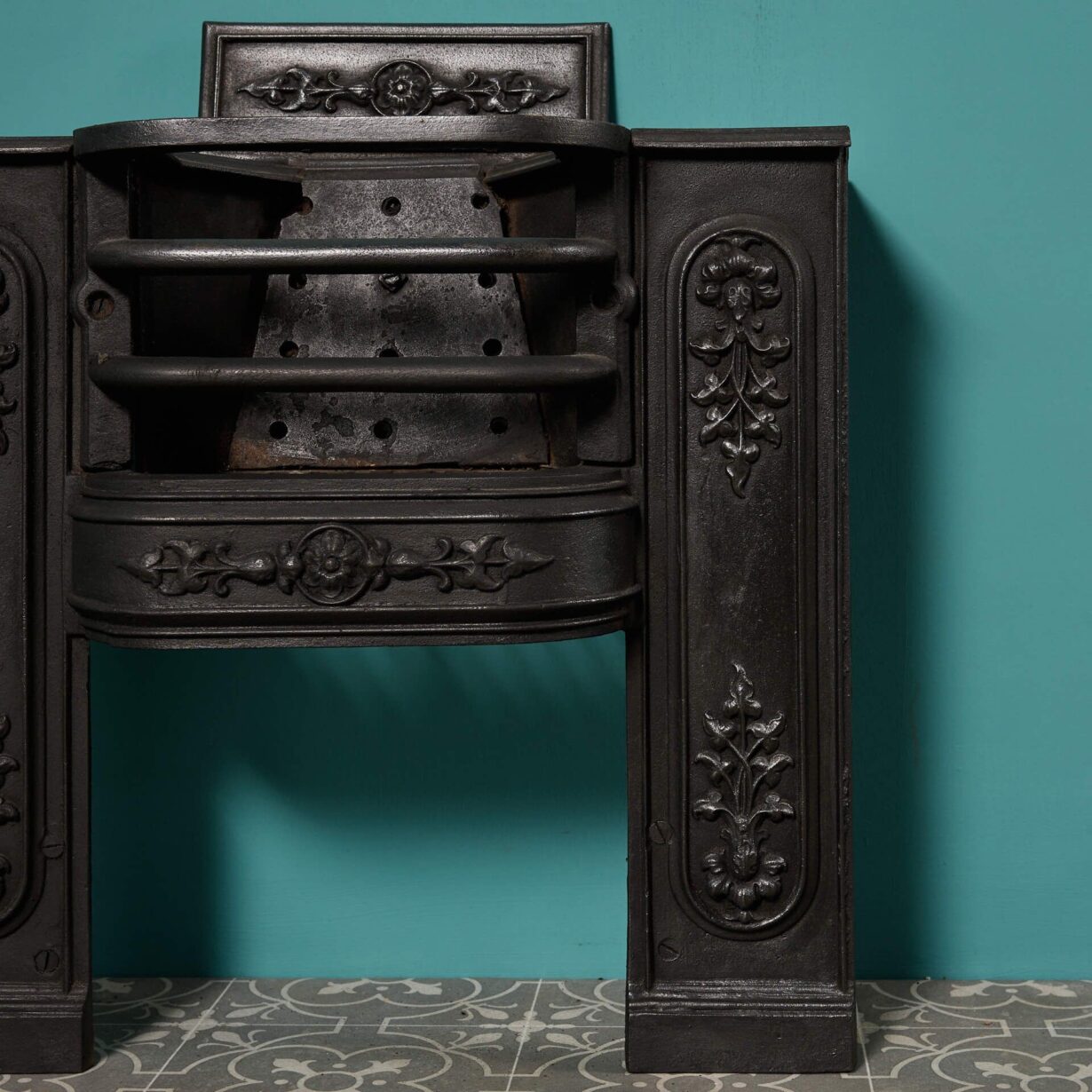 Finished in black graphite polish, this impressive hob grate pairs function with form, featuring decorated legs, shaped bars for the basket and a decorative tall back plate showcasing a stylised floral design.