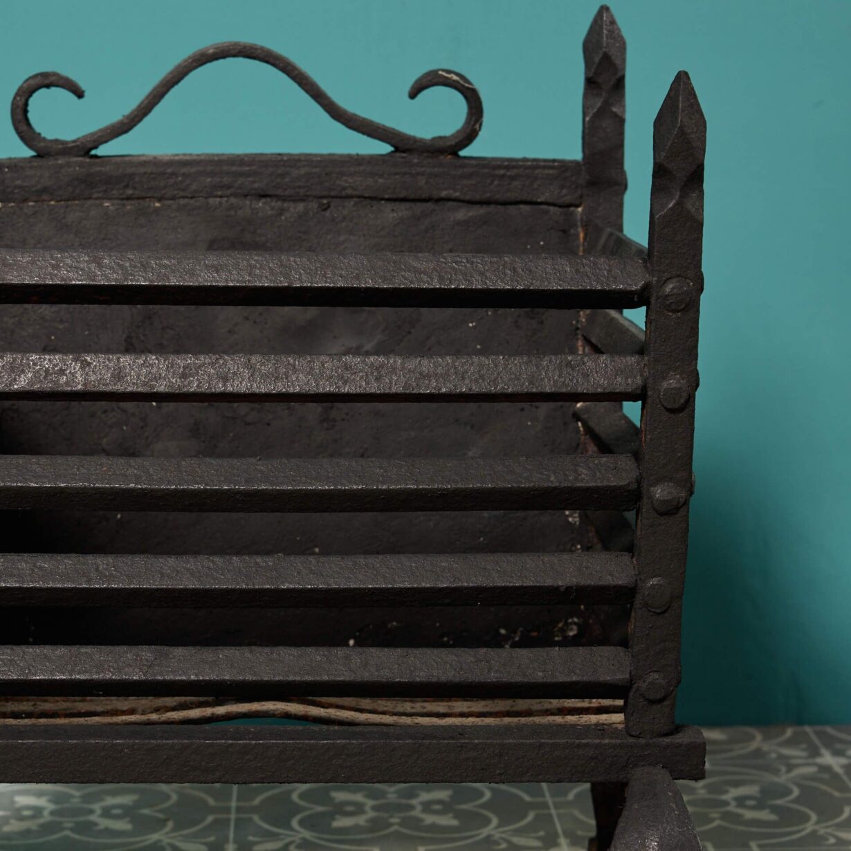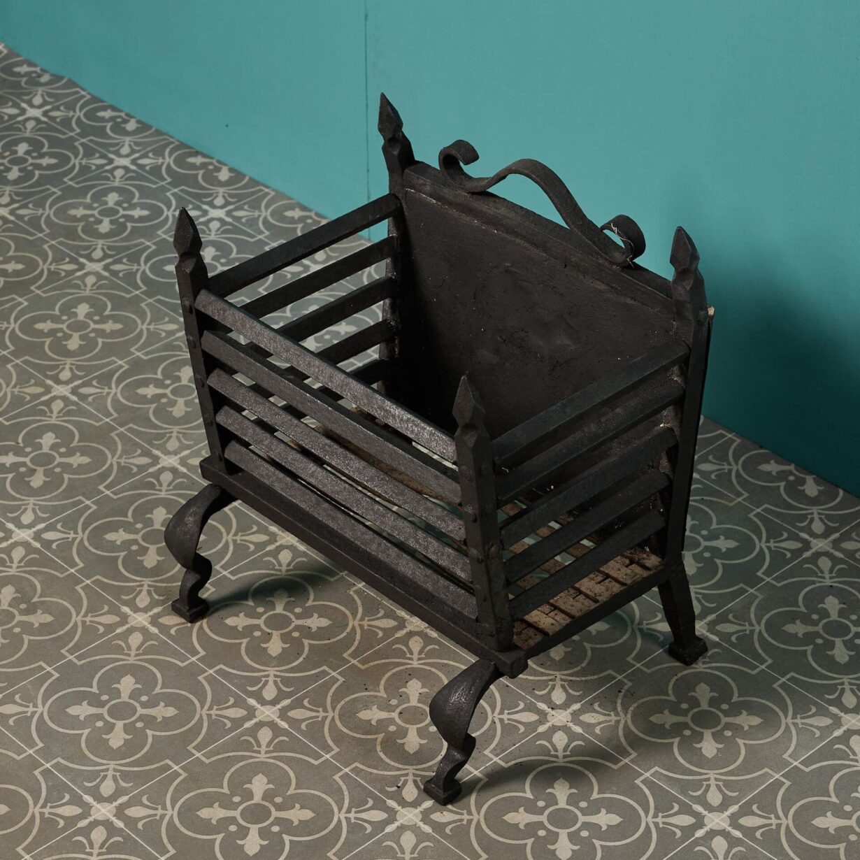 Dating to circa 1880, this reclaimed fire grate has an elegant, minimalist design with pointed finials and simple scrollwork to the back.