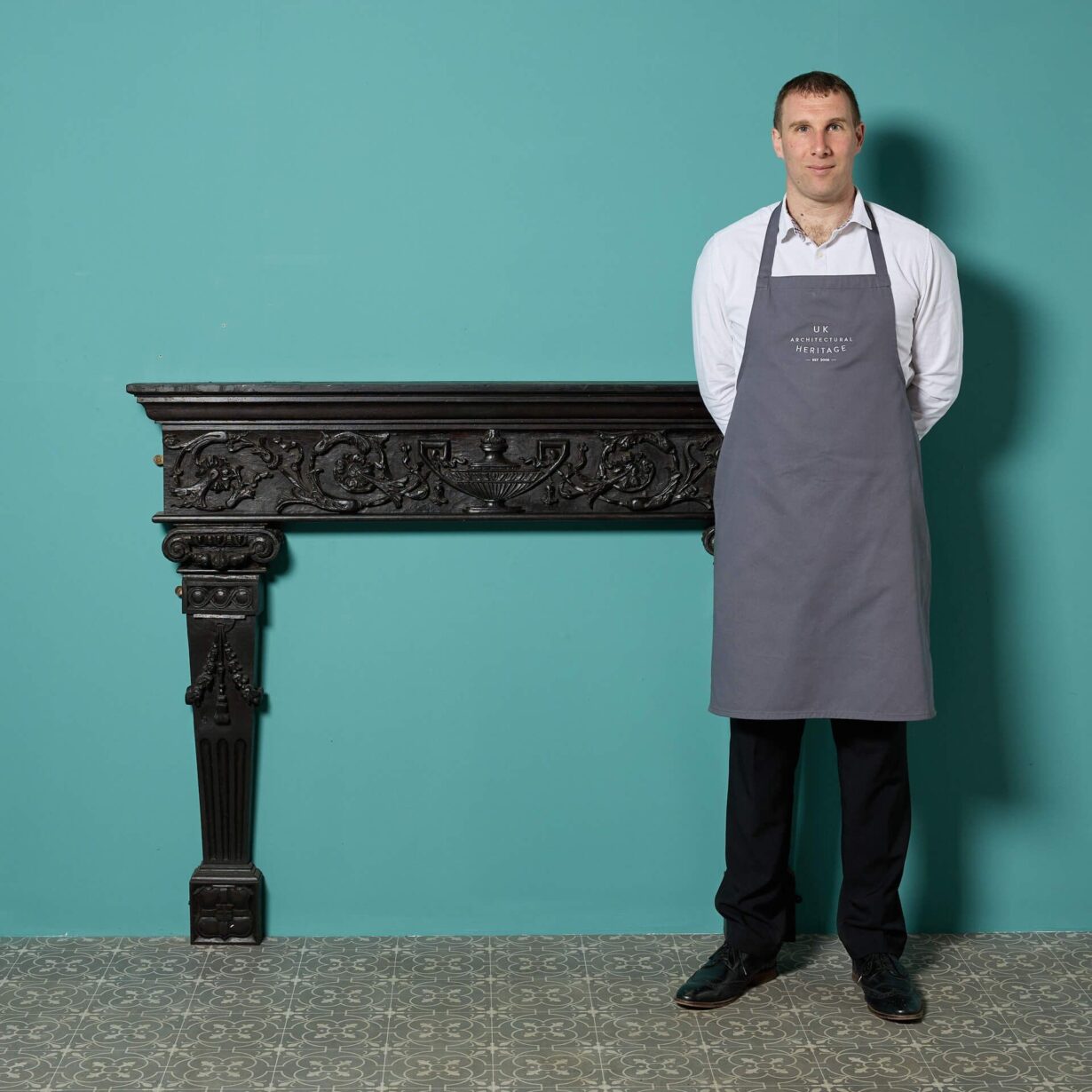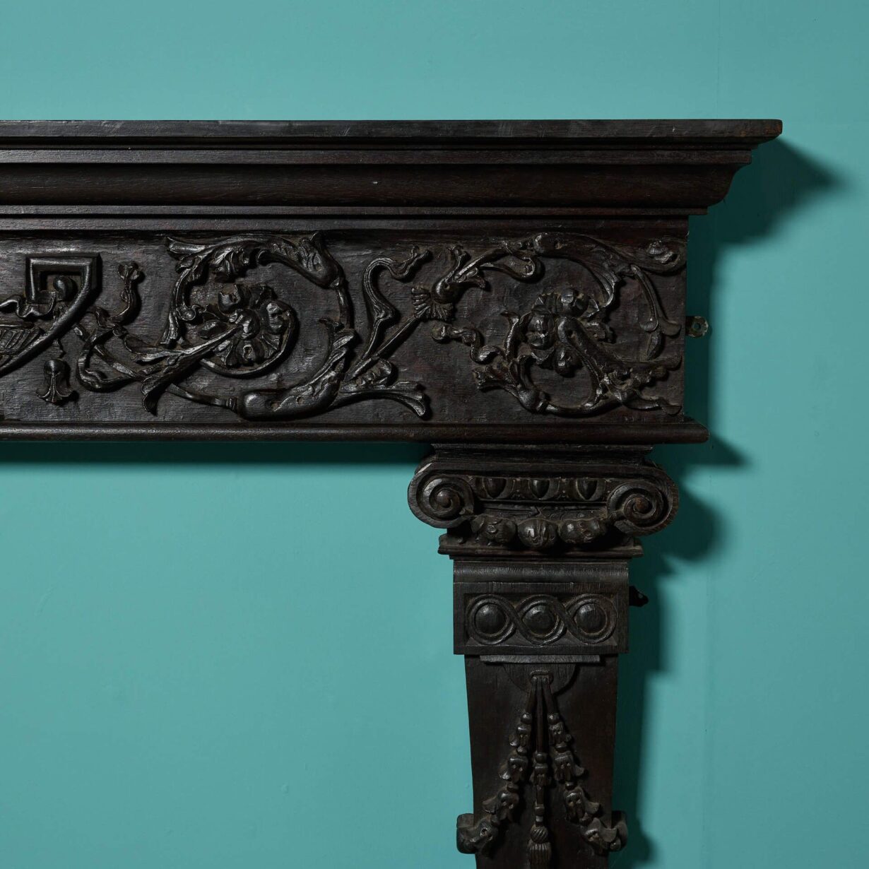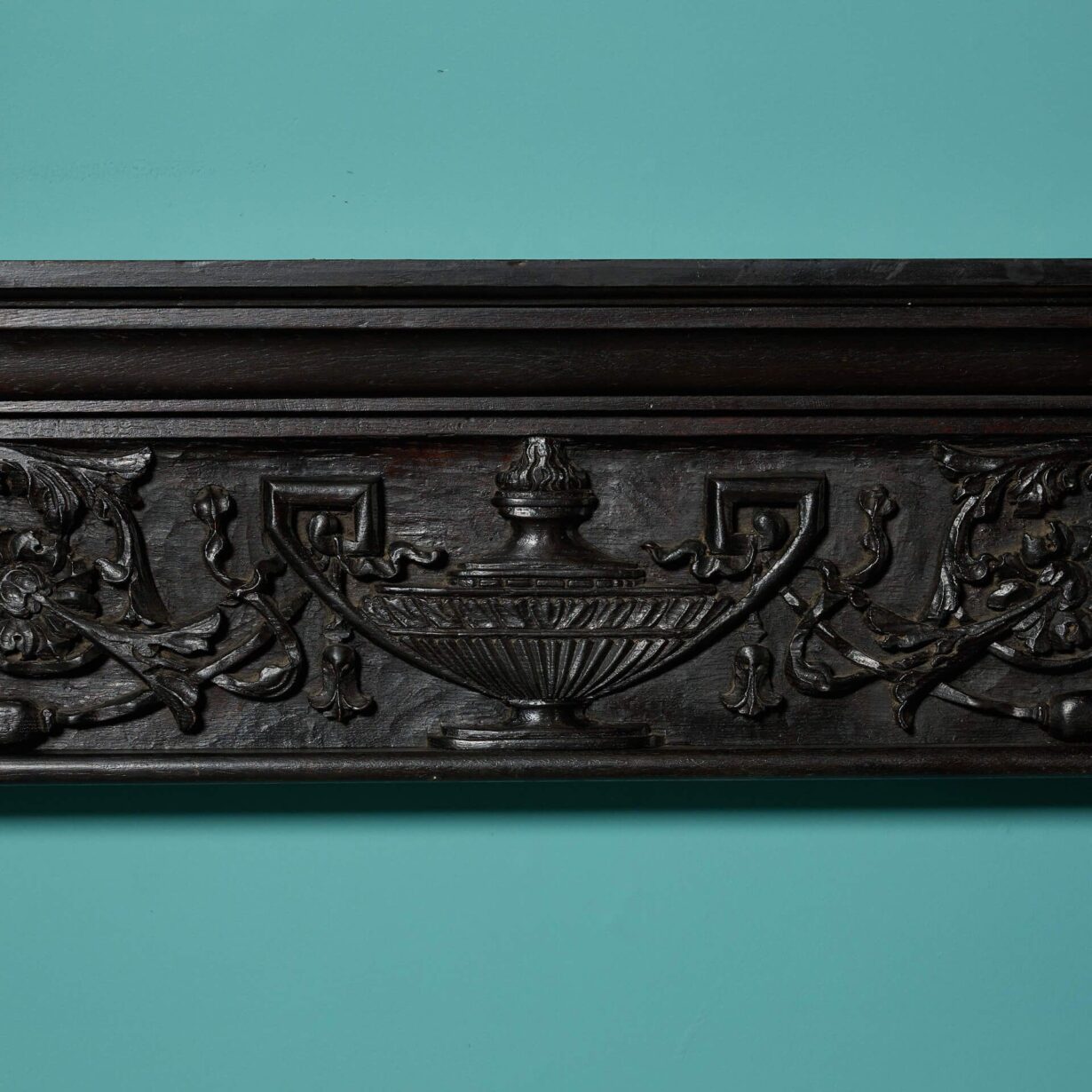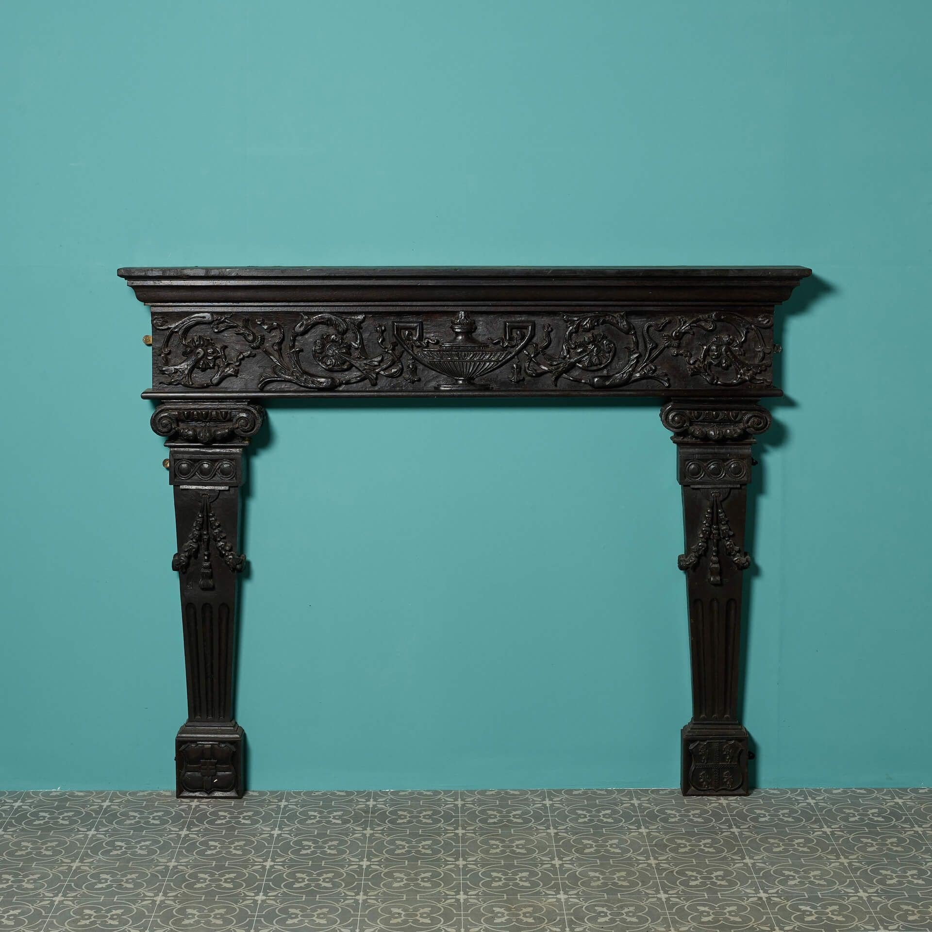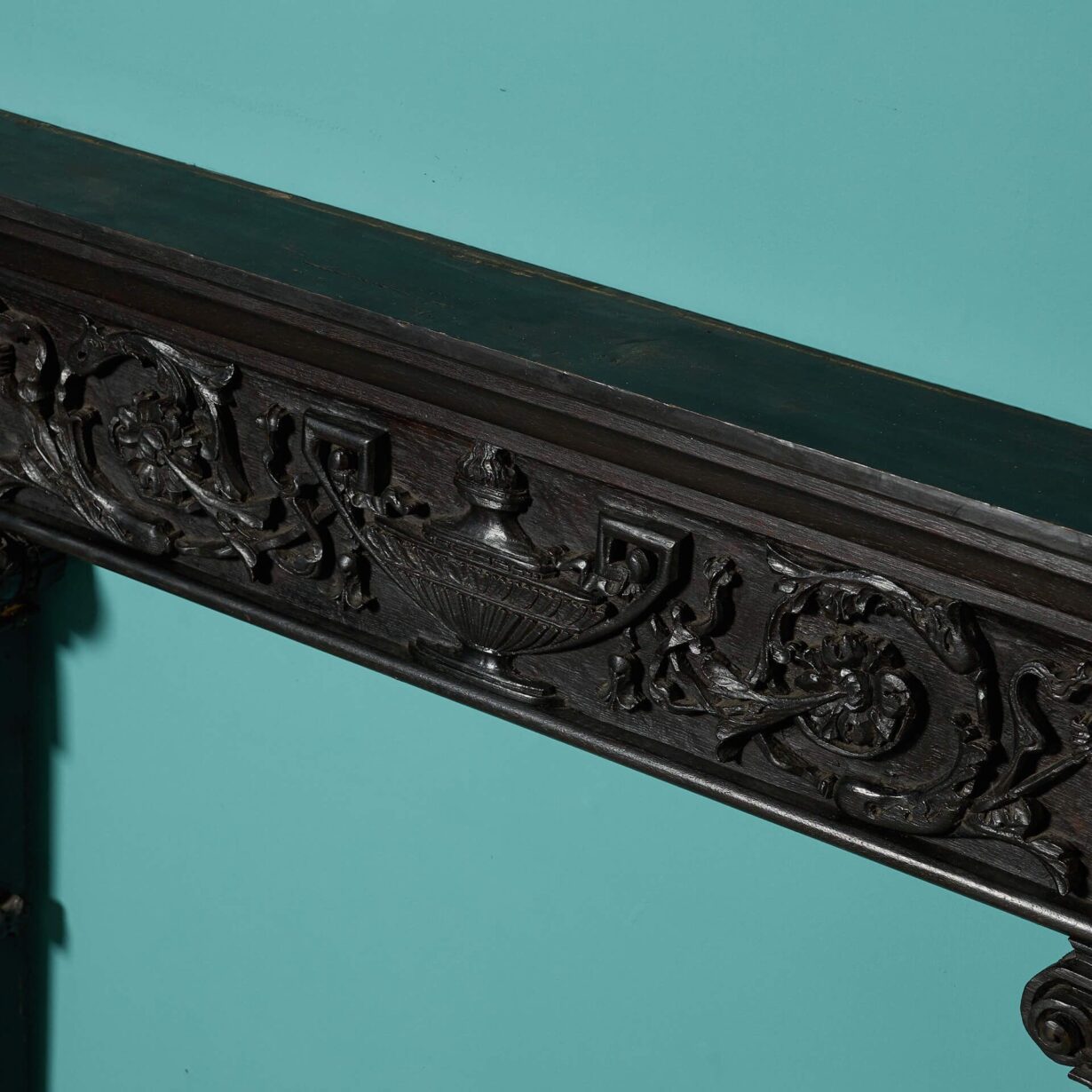 Featuring tapering column-style jambs below an ornate frieze, heavily handcarved with a large urn and scrolling foliage, this antique fire surround is a beautiful chimneypiece for an interior seeking architectural features of elegance and fine craftsmanship.