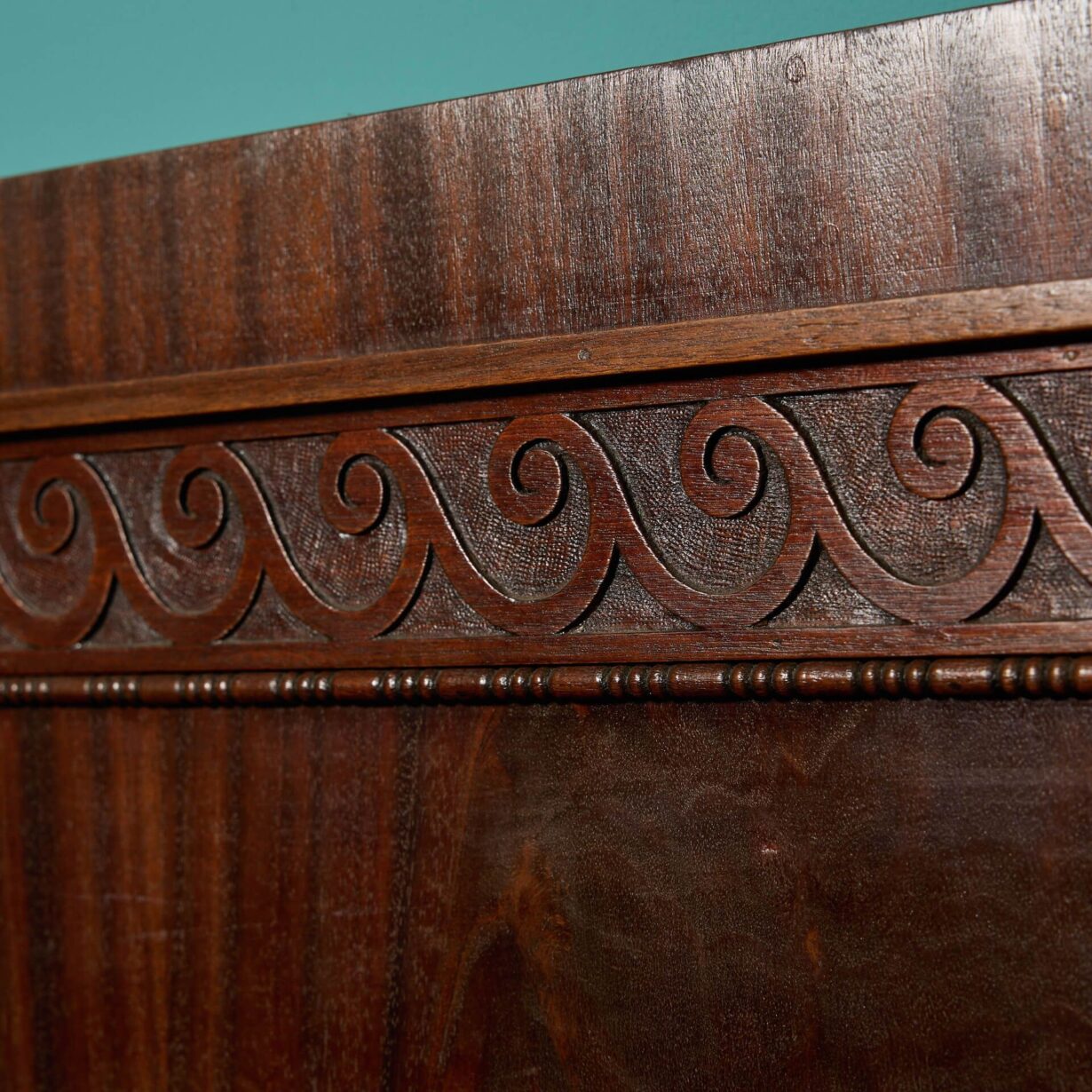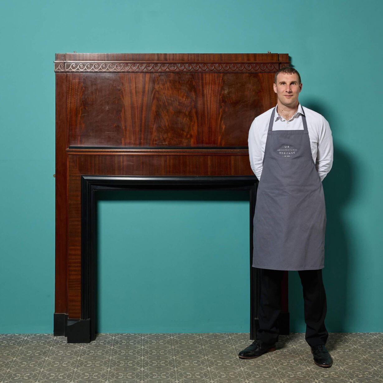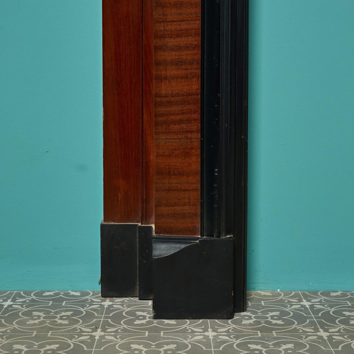 back to topA large reclaimed Art Deco mahogany fireplace. This striking fireplace is veneered in flame mahogany with a stylish painted matt black shelf and trim.