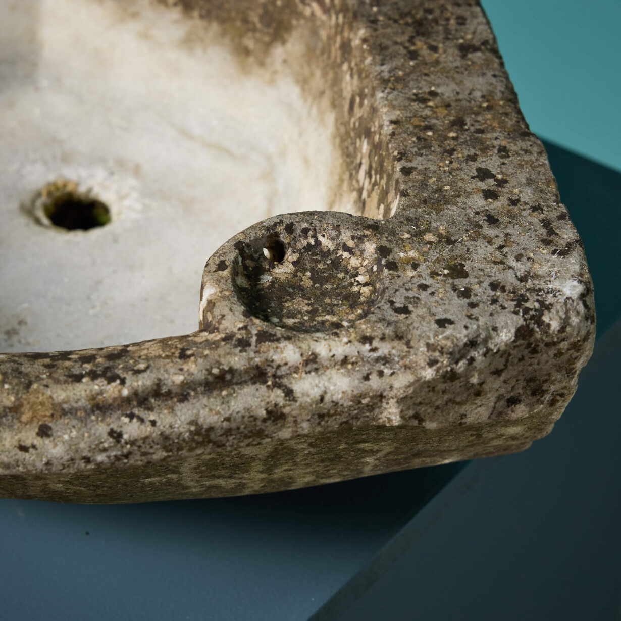 back to topAn antique carved Carrara marble corner basin dating to the 18th century.