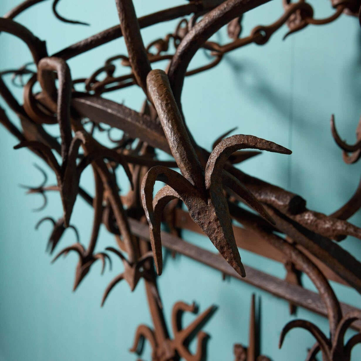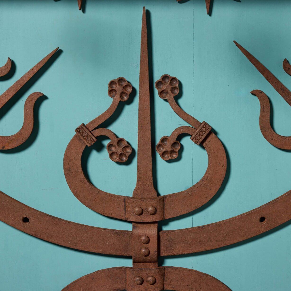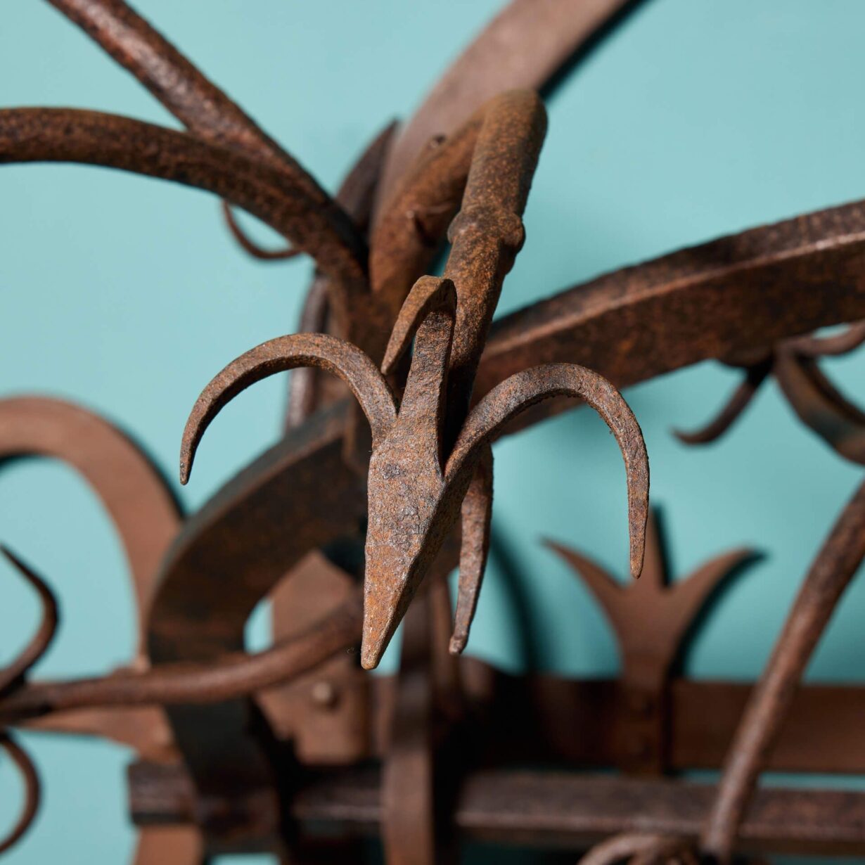 back to topAn antique early 18th century wrought iron gate guard. Believed to originate from a Scottish castle, this large unusual gate guard’s striking spikes give a menacing, medieval look, while displaying detail and precision; a masterclass in 18th century blacksmithing.