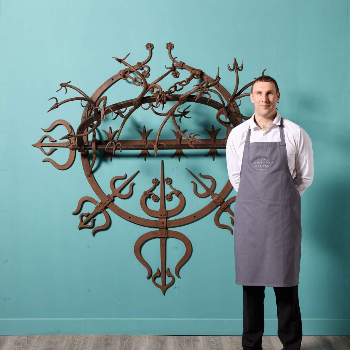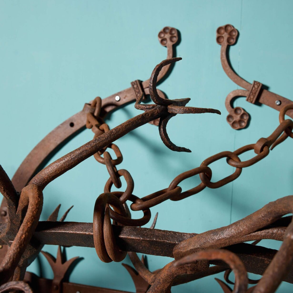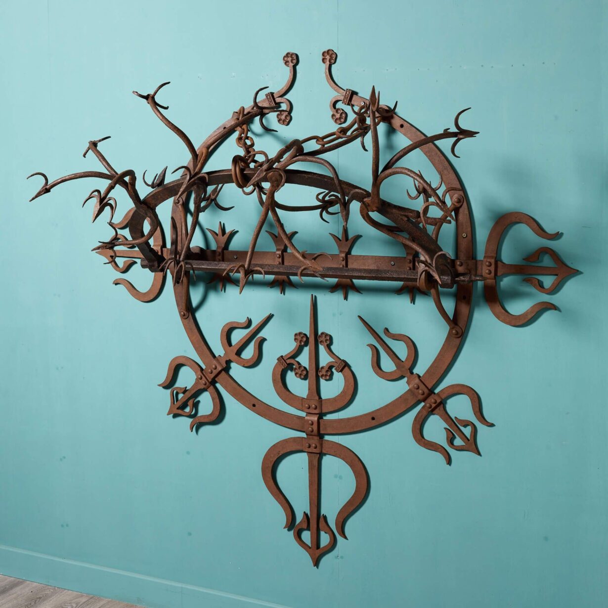 back to topAn antique early 18th century wrought iron gate guard. Believed to originate from a Scottish castle, this large unusual gate guard’s striking spikes give a menacing, medieval look, while displaying detail and precision; a masterclass in 18th century blacksmithing.