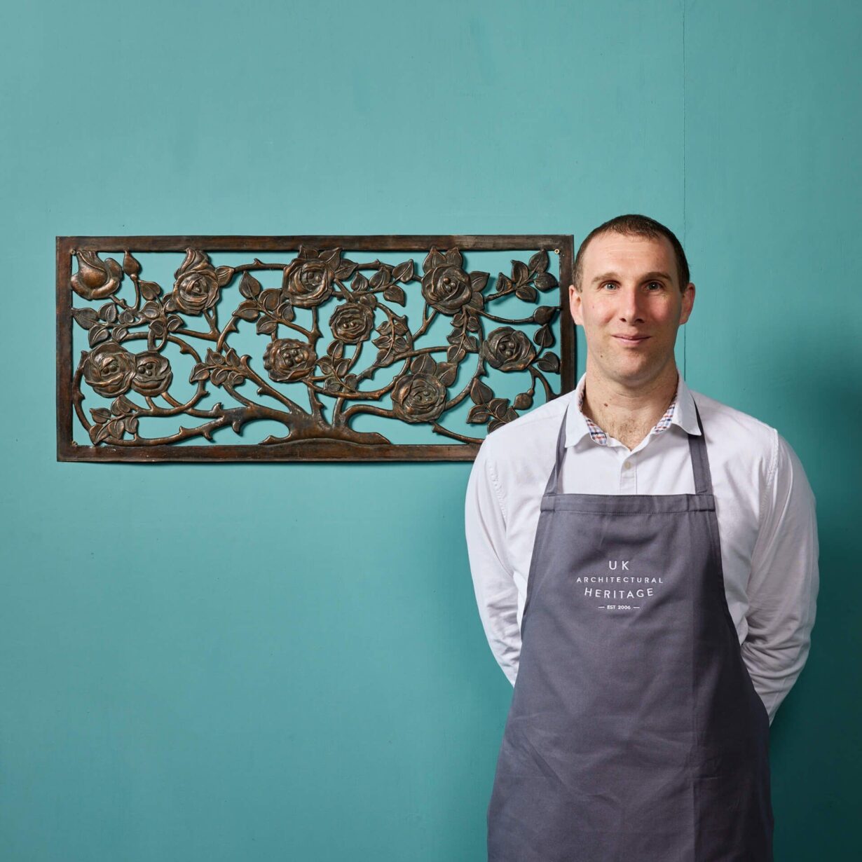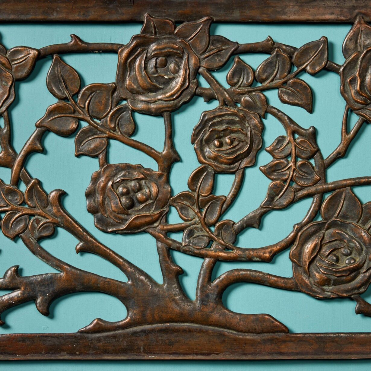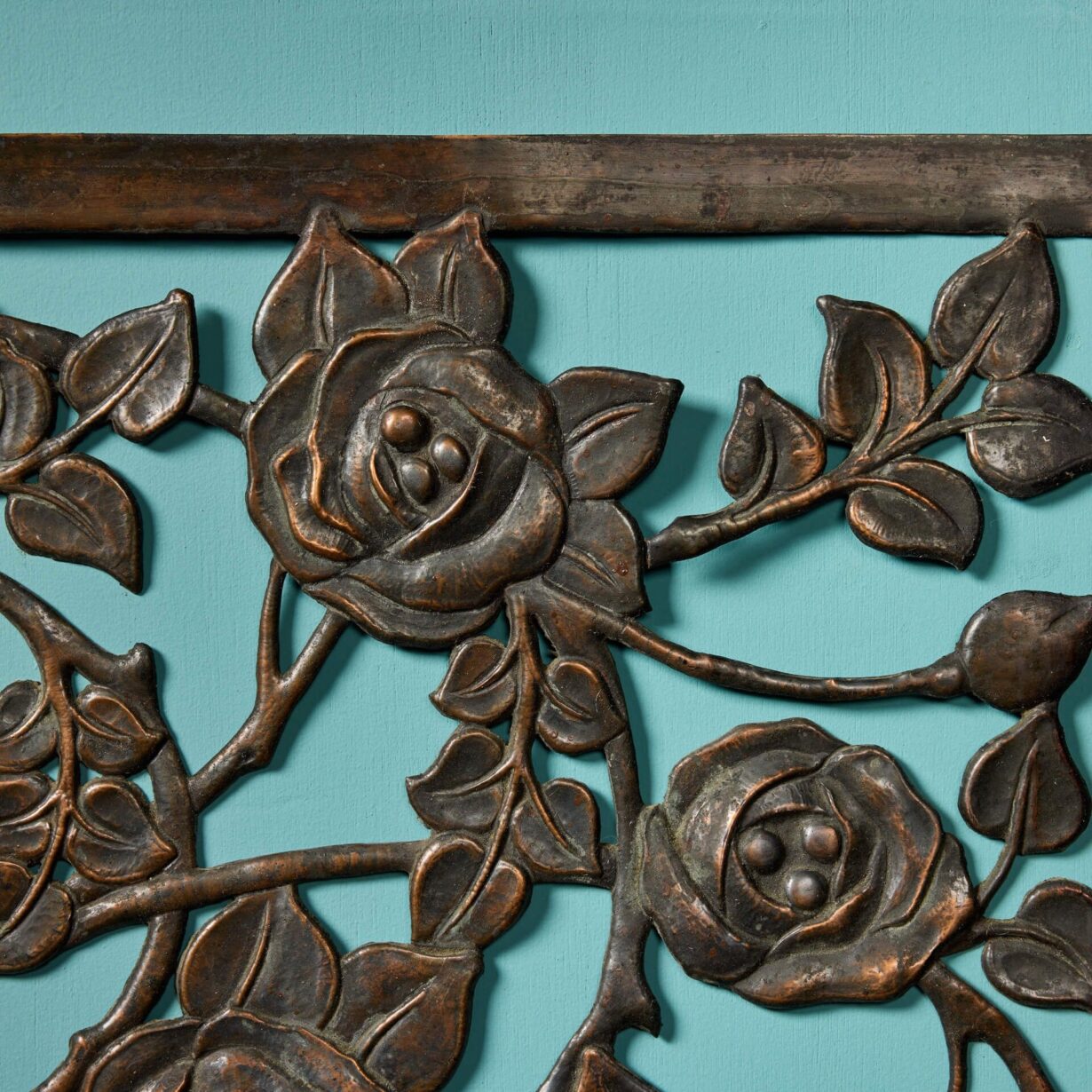 back to topAn antique late 19th century decorative floral wall hanging, reclaimed from a country house in Somerset, England. Showcasing the French repoussé technique, this panel displays a hand-crafted detailed rose bush, accompanied by a strong copper patina finish.