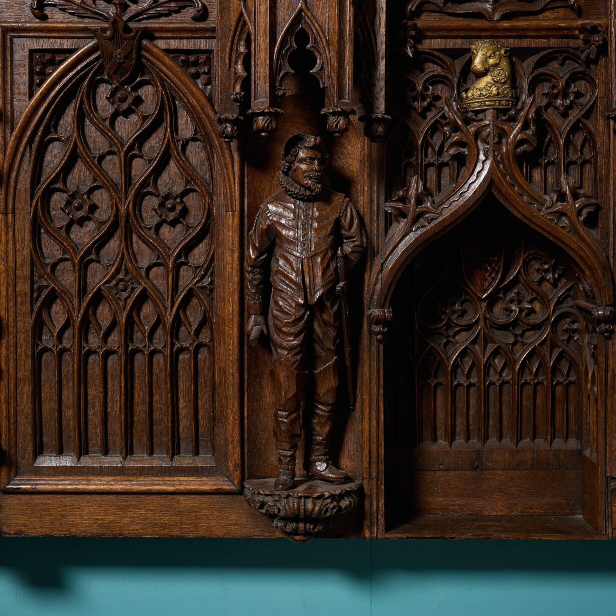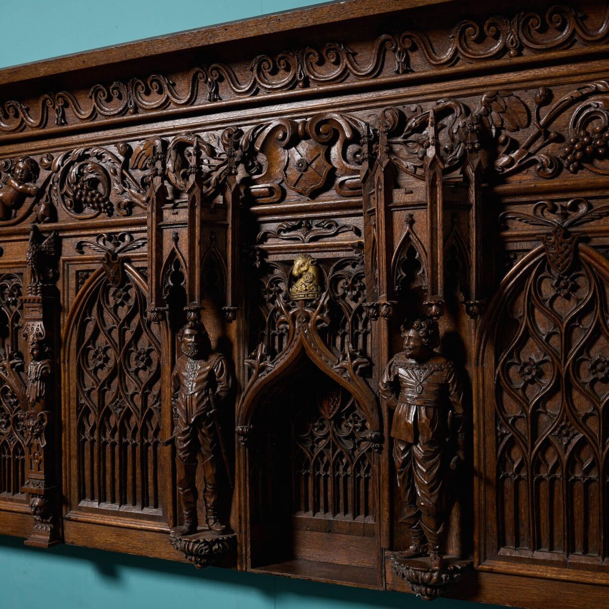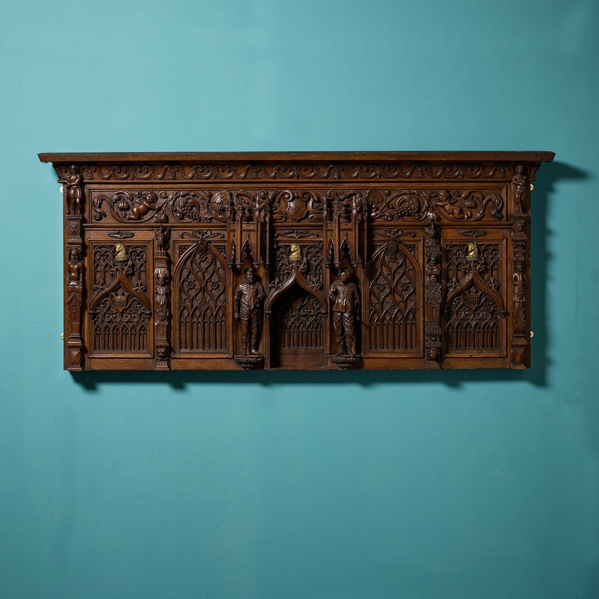 back to topA large and impressive late 19th century gothic style decorative oak wall hanging panel.