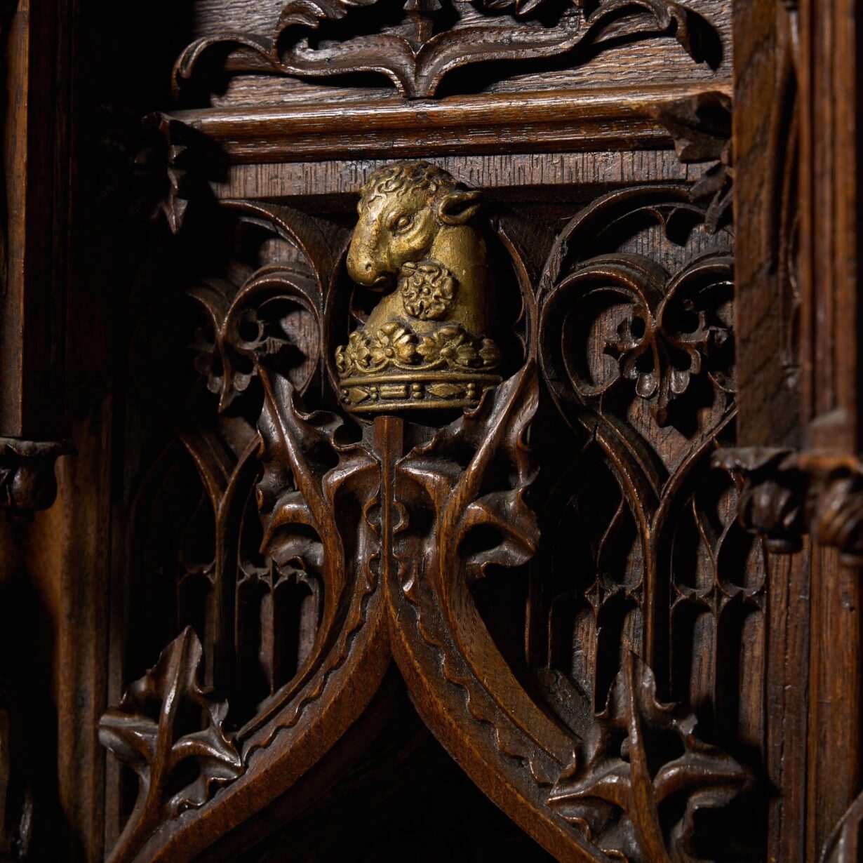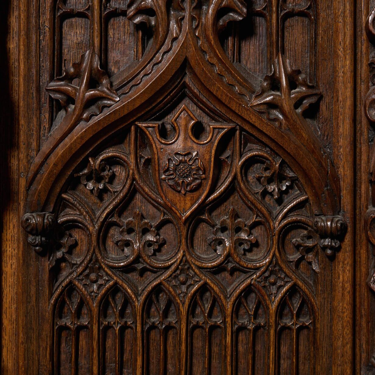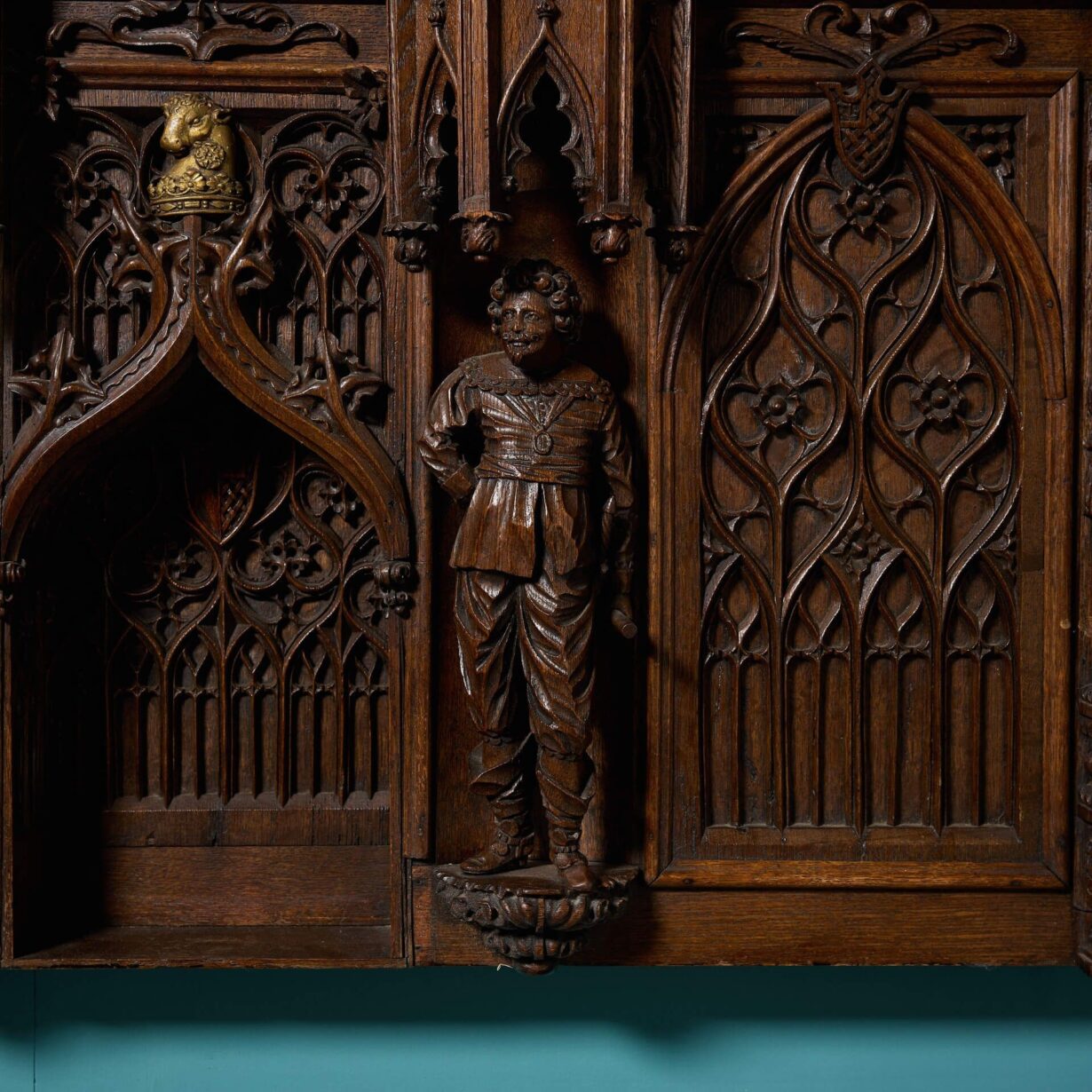 back to topA large and impressive late 19th century gothic style decorative oak wall hanging panel.