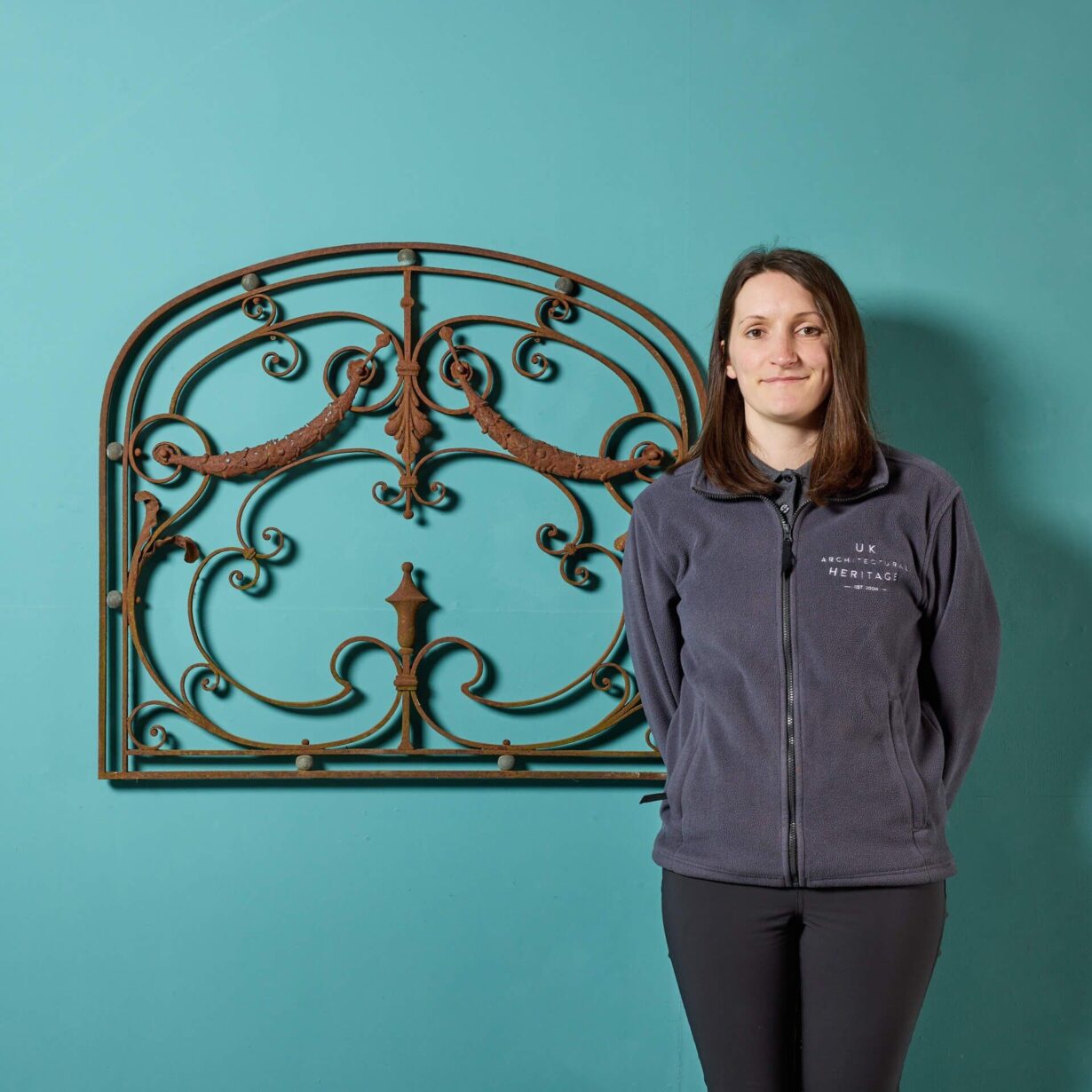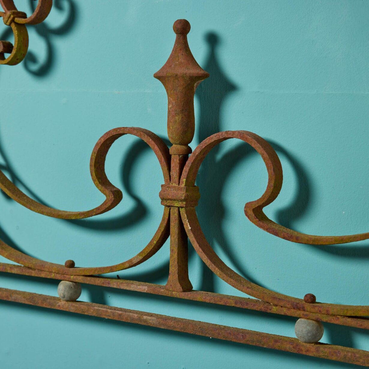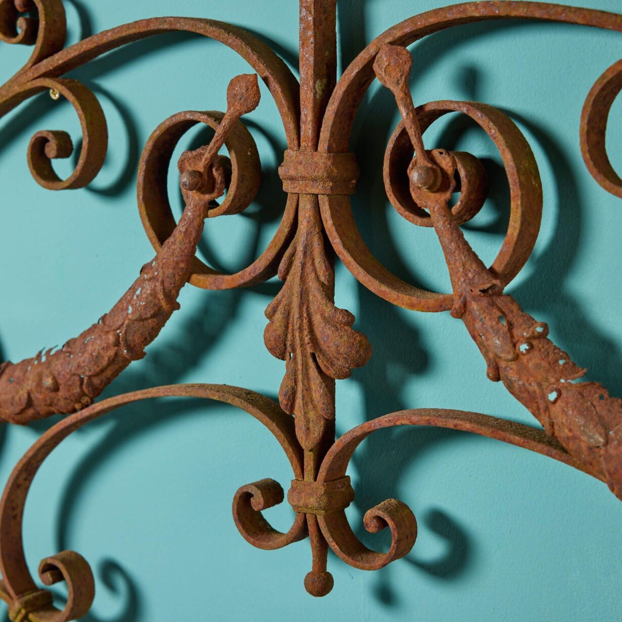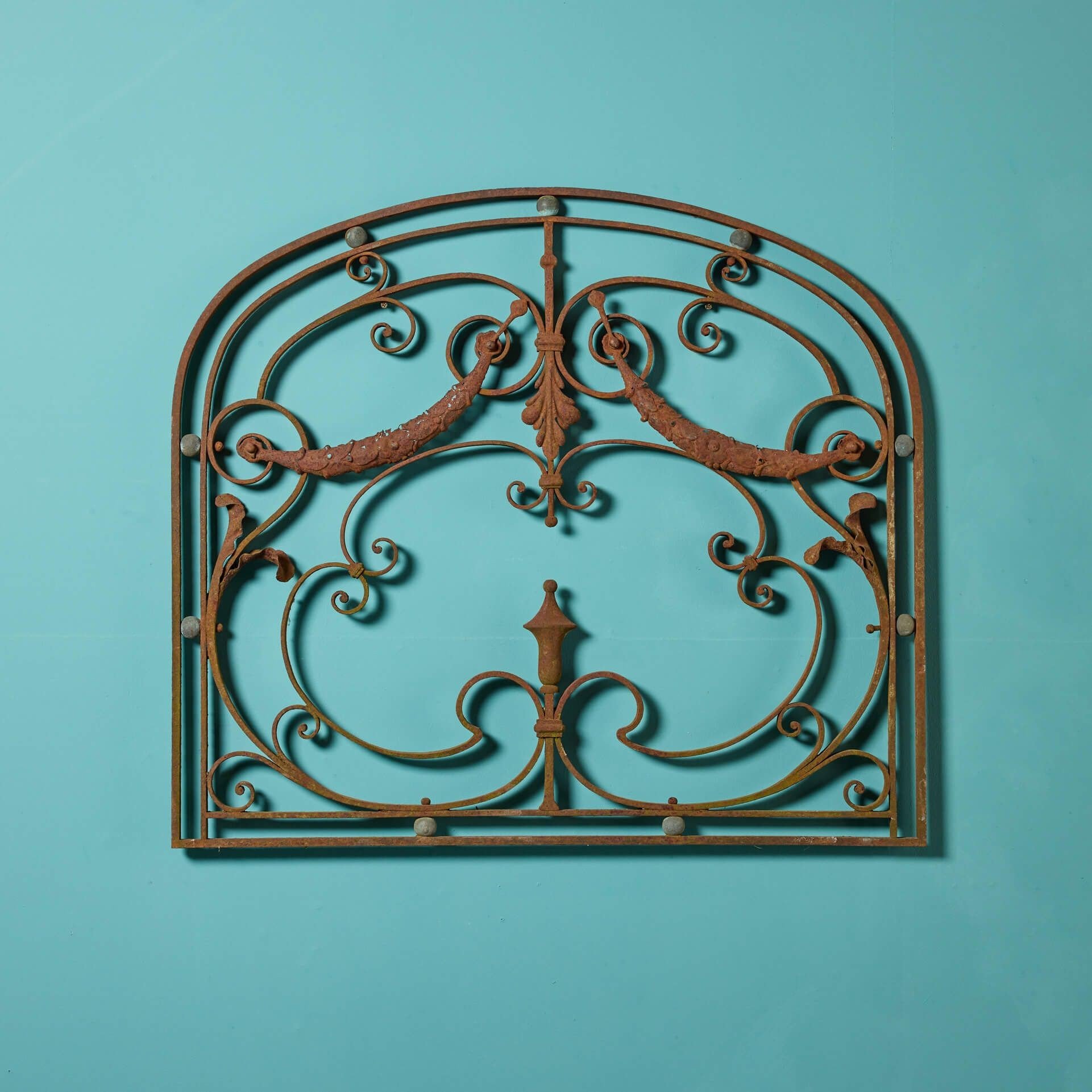 back to topAn antique arched wrought iron panel. Dating to circa 1780, this hand-forged wrought iron panel displays scrolls amongst stylised foliage and swag decoration, while brass balls decorate the perimeter of its arched shape.