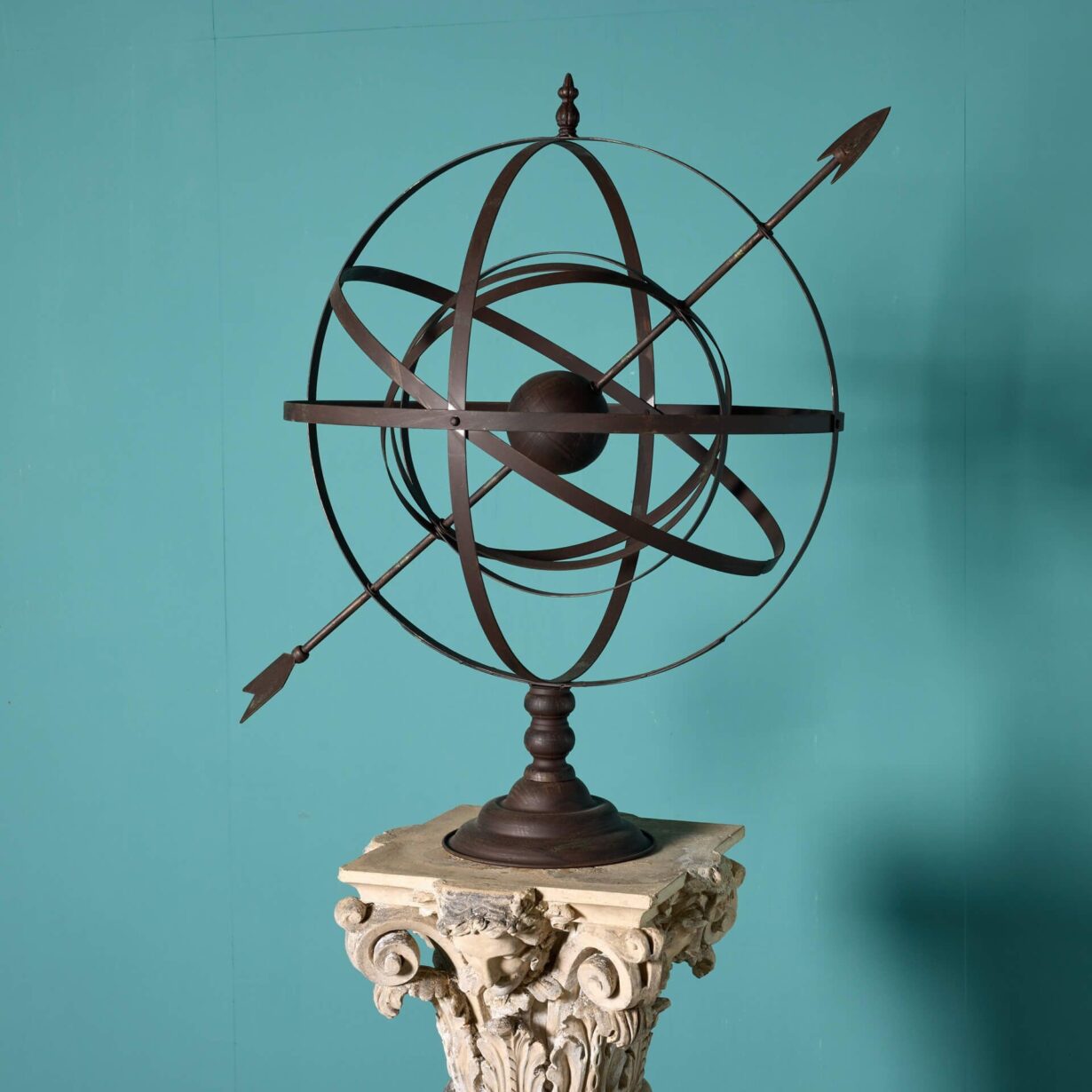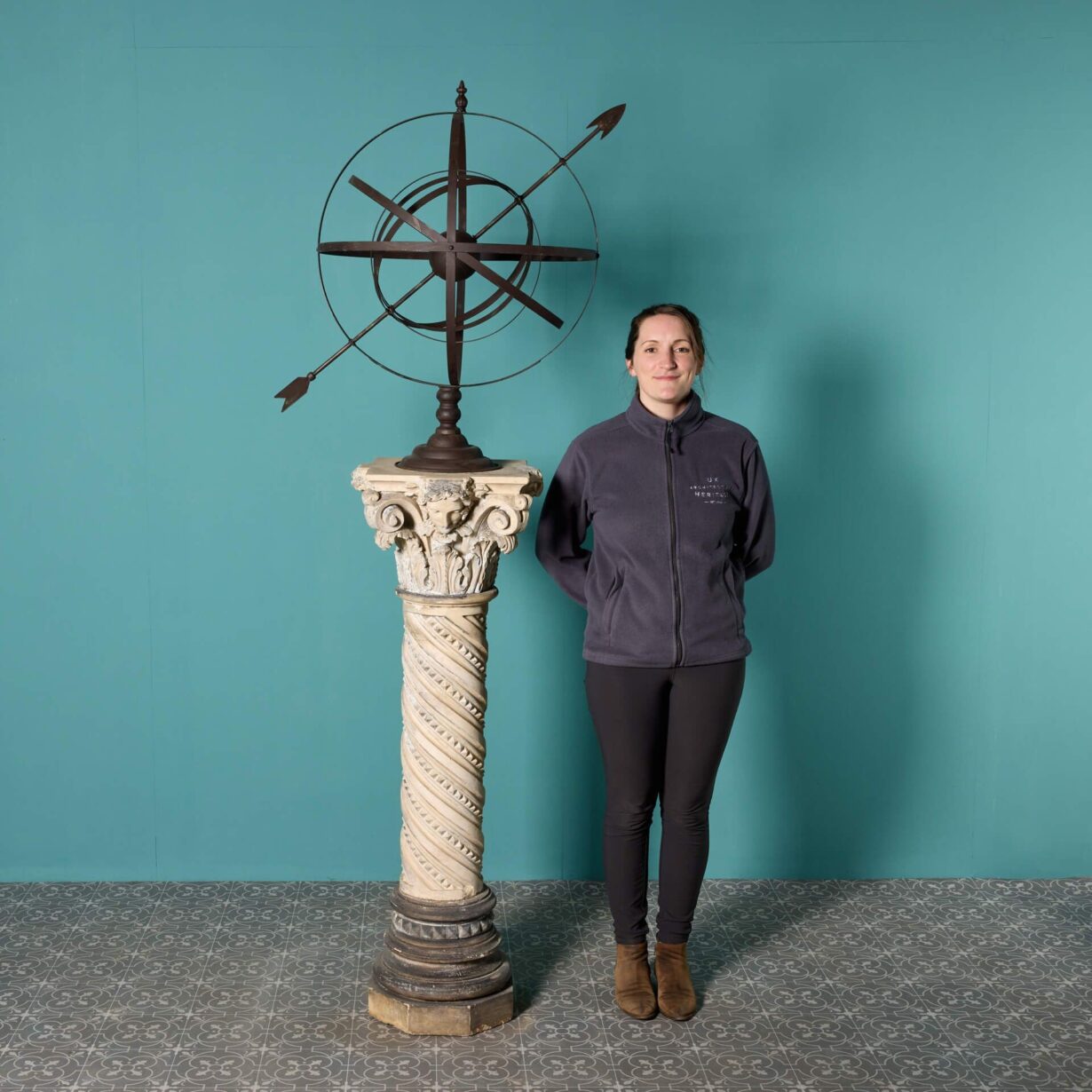 The column base dates from the late 19th century and is paired with a modern armillary sphere of impressive scale, making a striking statement in a large country garden or scenic courtyard.