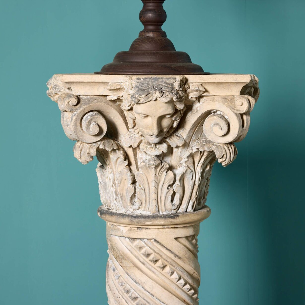 Sculpted in terracotta, the base is intricately modelled with masks and scrolls on each side above a Solomonic spiral twist pedestal. This makes for a finely elegant yet hardwearing design, the blend of old and new complementing each other beautifully for use as an ornamental garden feature.