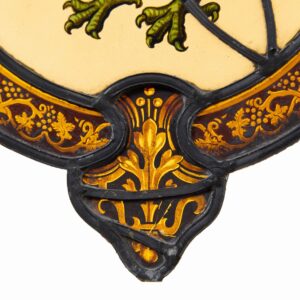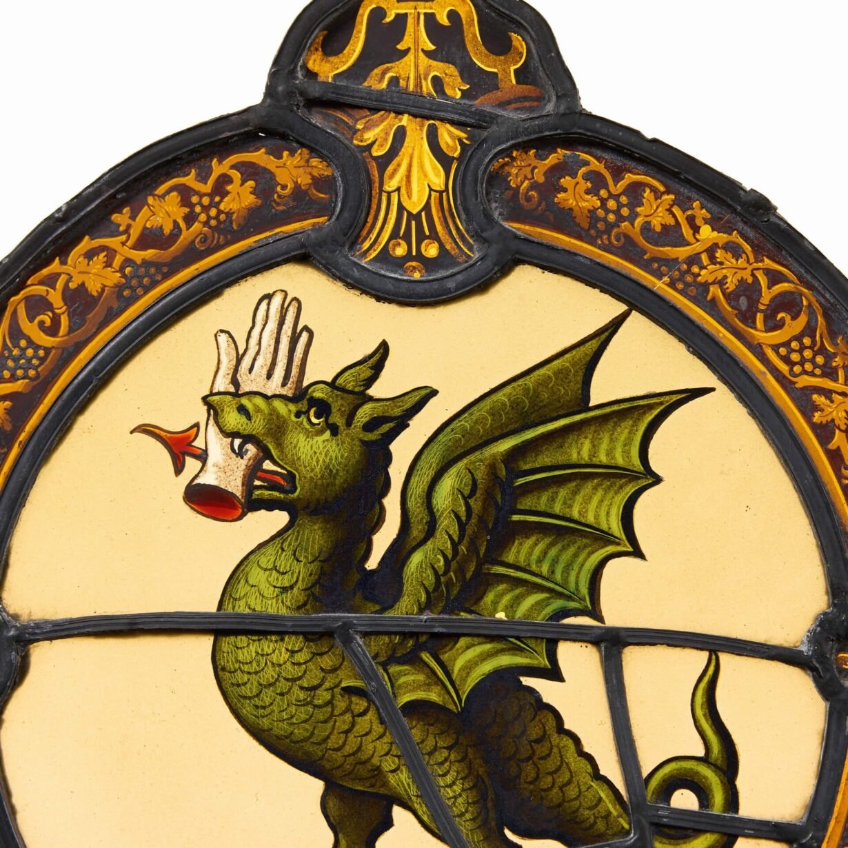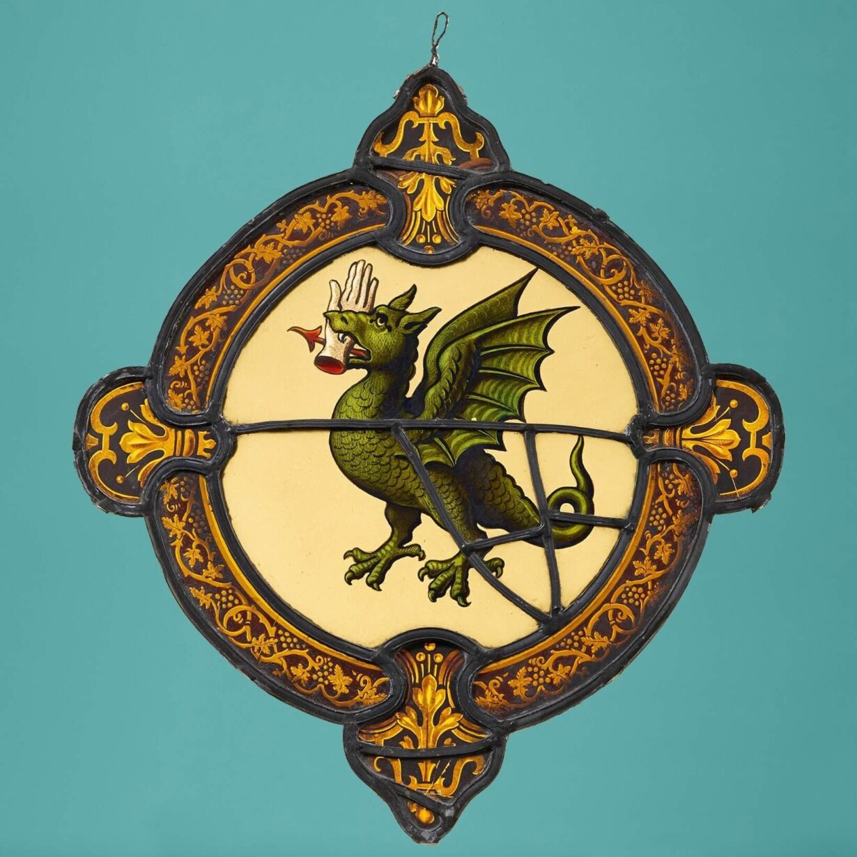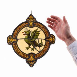 back to topAn armorial stained glass panel depicting the vivid scene of a beastly dragon.