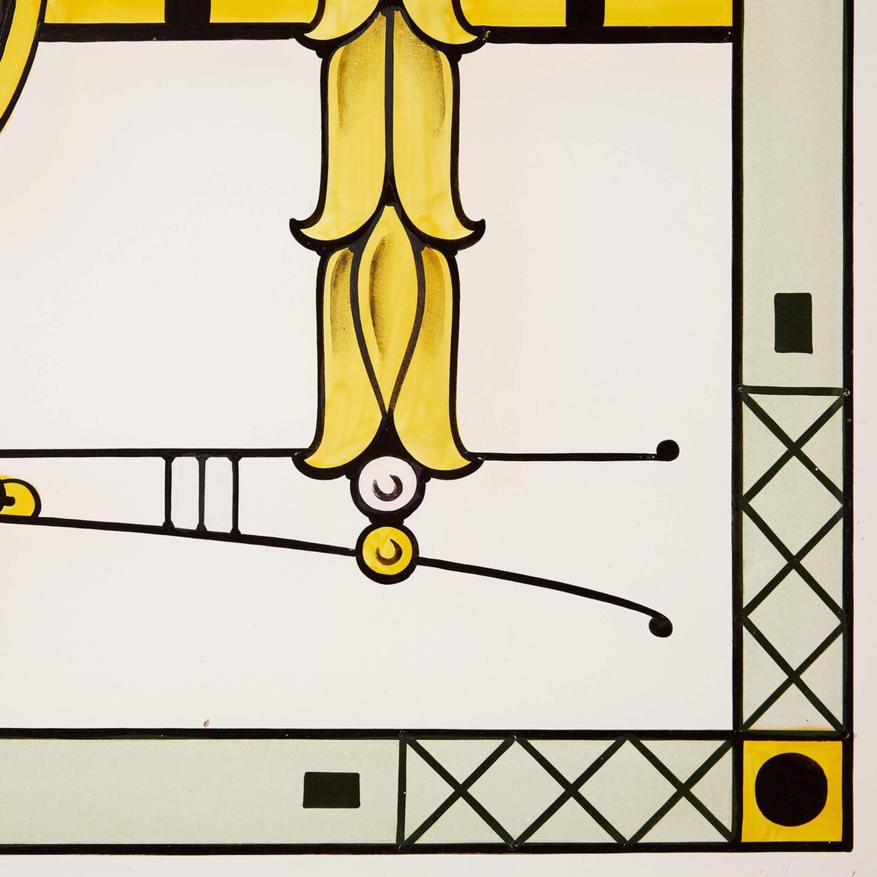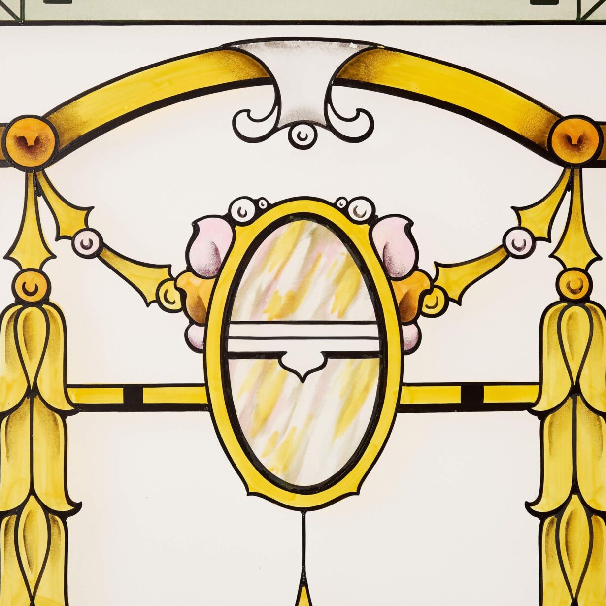 back to topAn early 20th century stained glass window, beautifully etched with Art Nouveau style details.