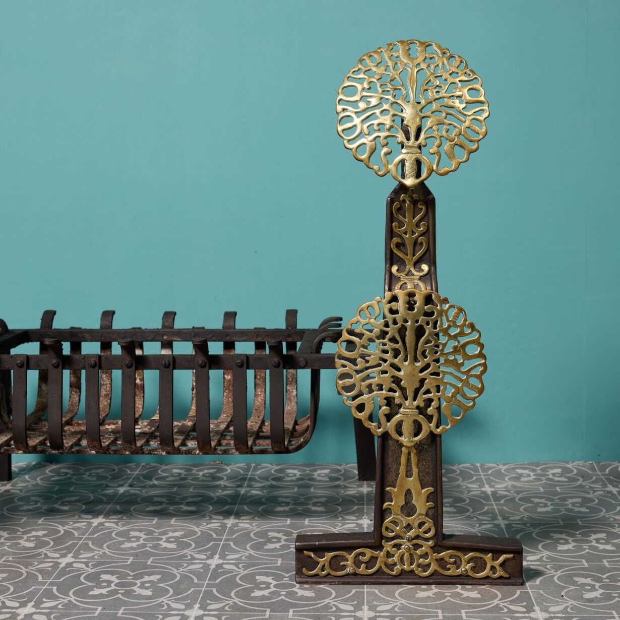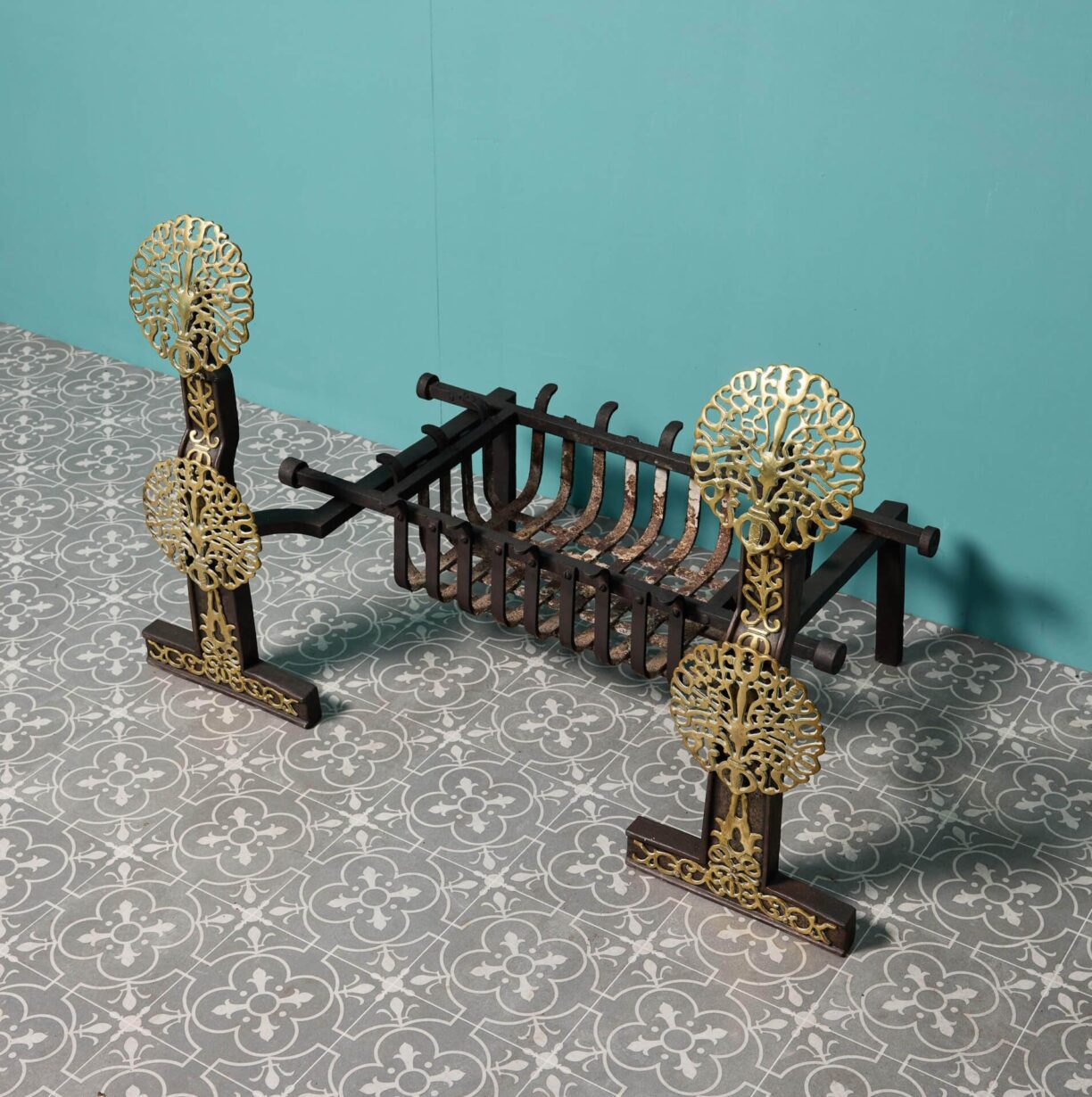 The two andirons showcase pierced brass discs with foliate detailing. This fire grate is an ode to its English blacksmith with its beautiful intricate iron and brass work, making it a stunning new element for a period townhouse or country home.
