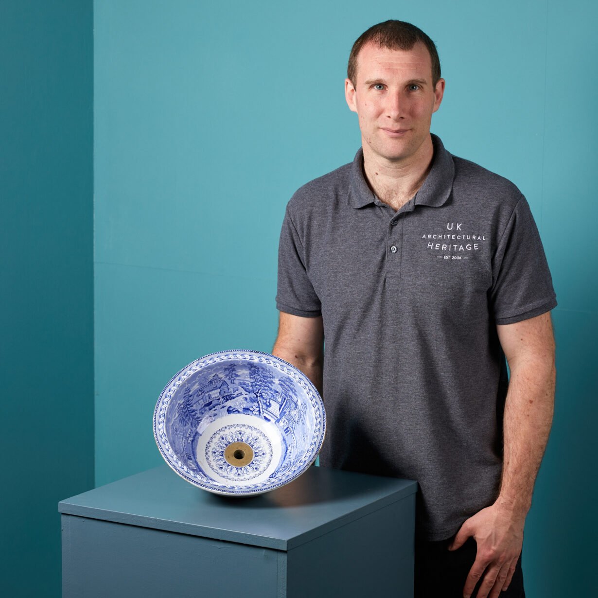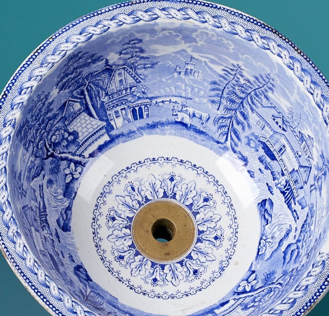 back to topAntique Blue and White Transfer Printed Porcelain Sink. A circular blue and white transfer decorated wash basin in a classical Victorian design.